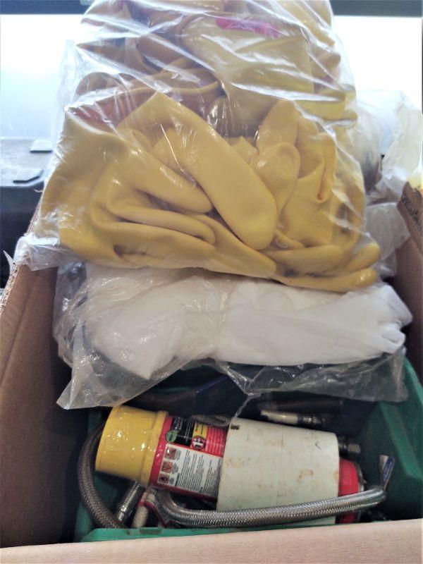 Box of yellow rubber gloves, white disposable coveralls, etc