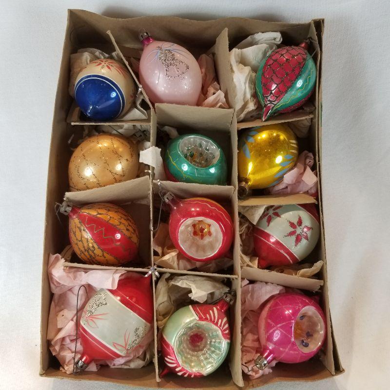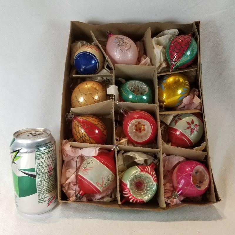 This box is a nice collection of 12 vintage regular/medium-sized ornaments. All are in very good condition consistent with age. None are broken - no lid to box. These will make a mid-century tree smile.