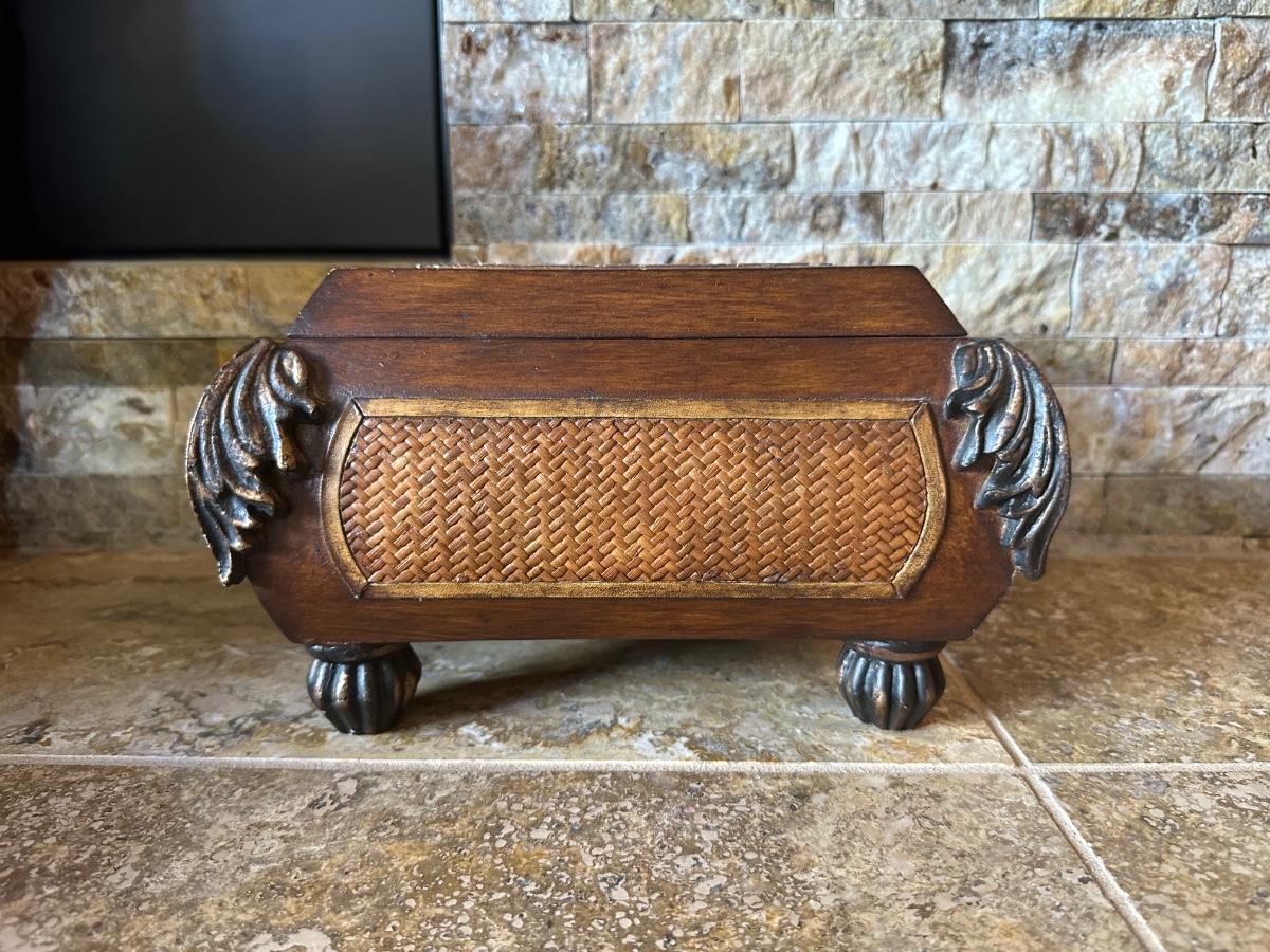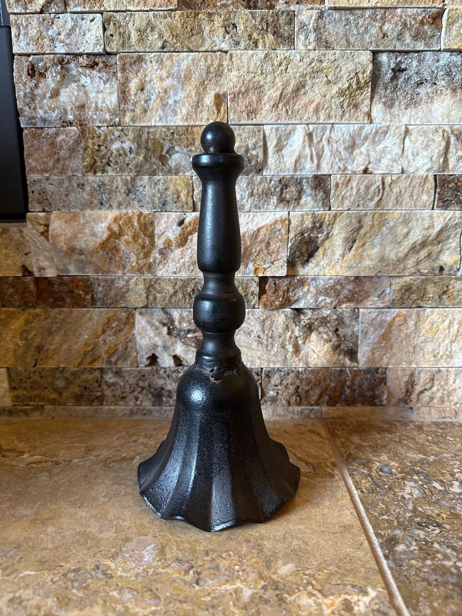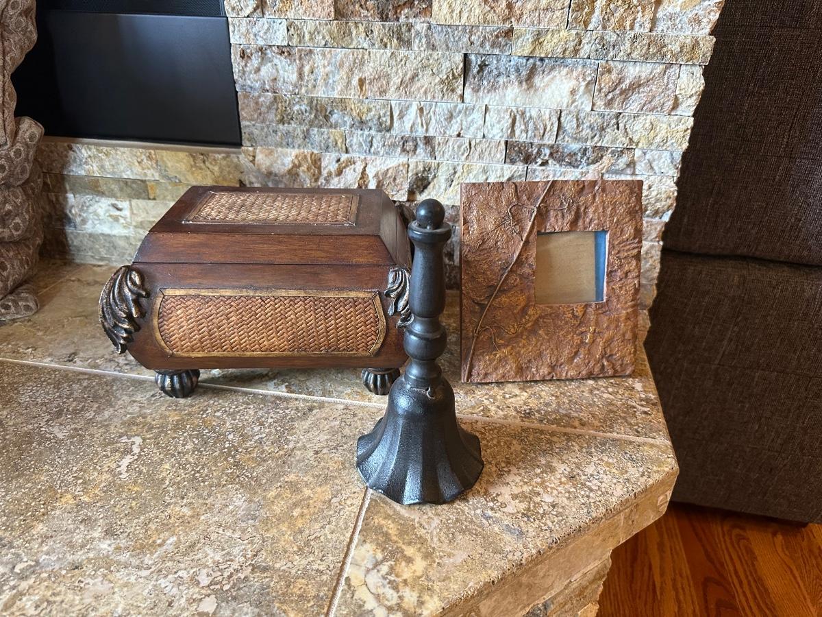 BOX, PICTURE FRAME AND CAST IRON BELL