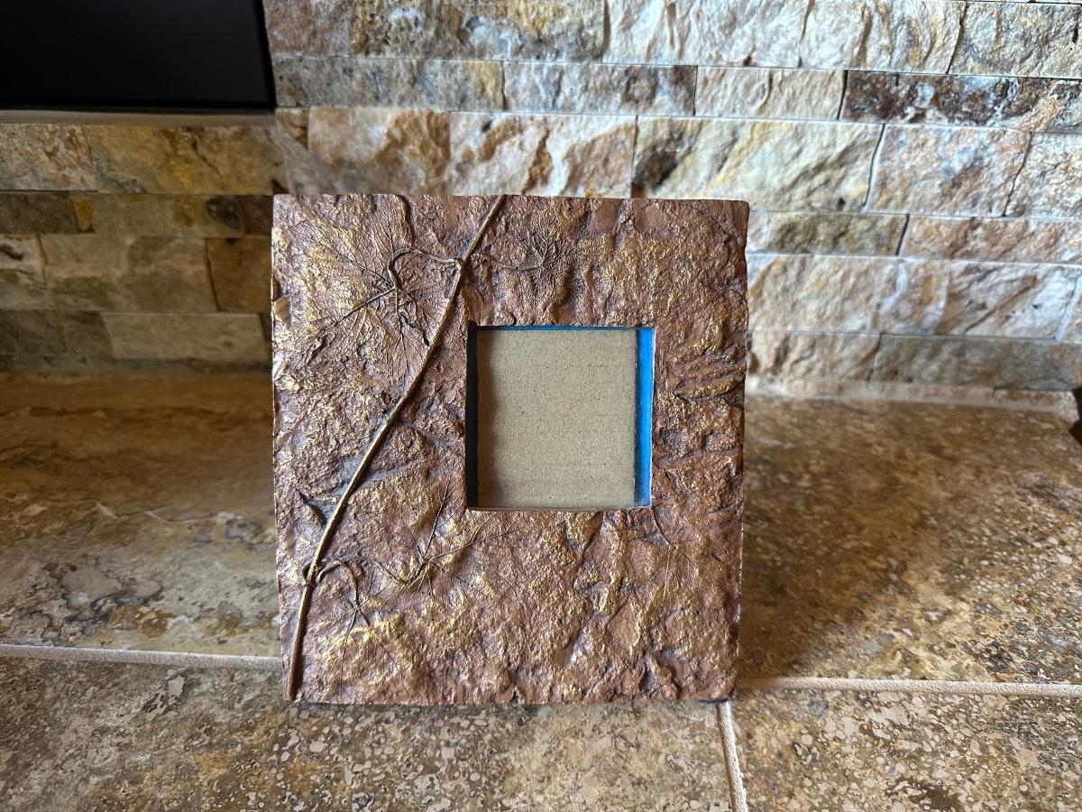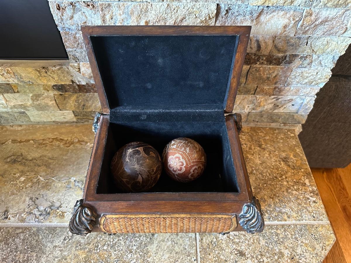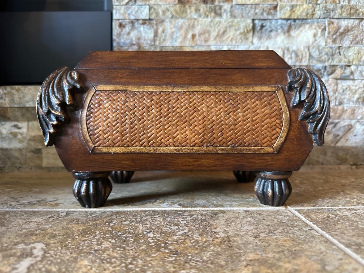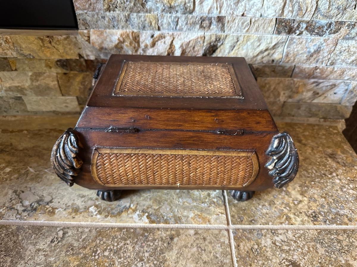 BOX, PICTURE FRAME AND CAST IRON BELL