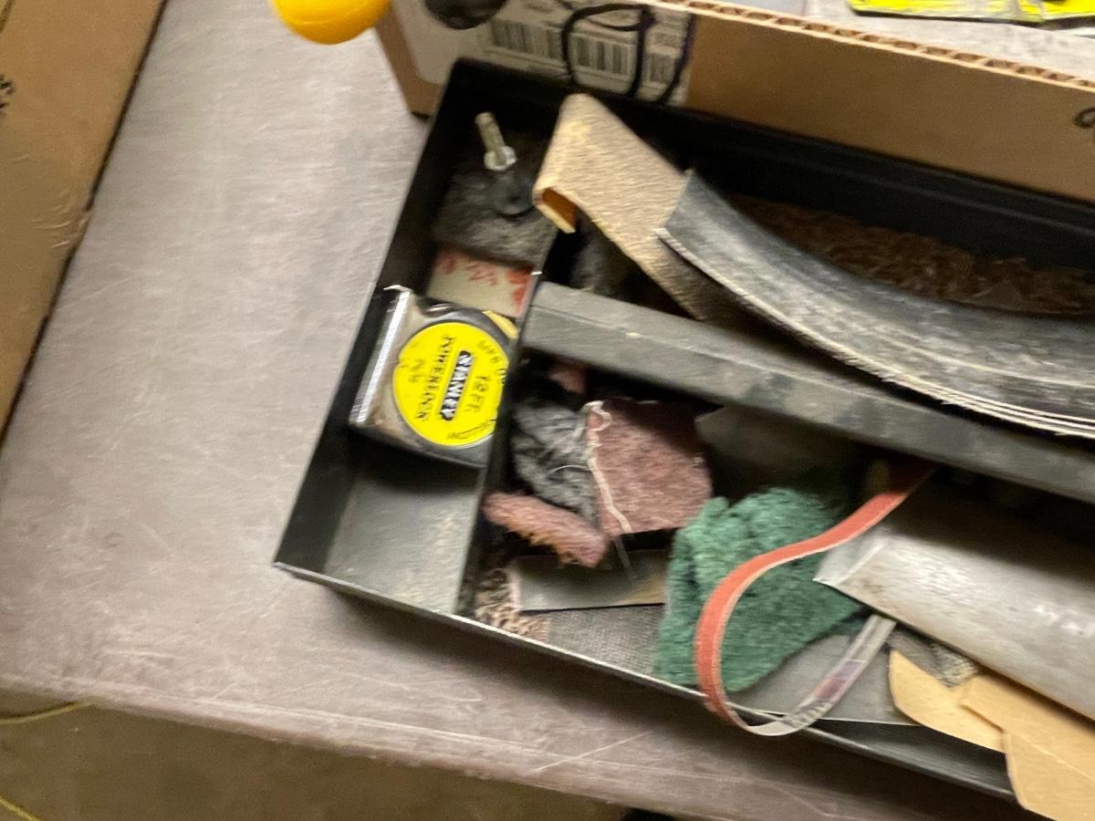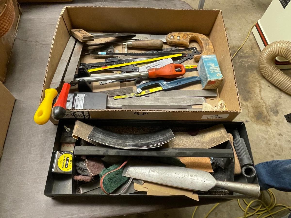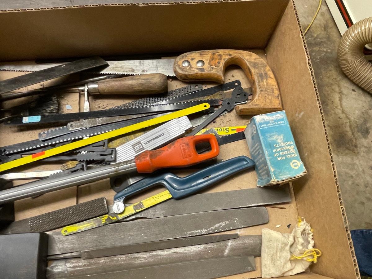 Box & Tray of Tools - mostly Files - also saw/blades/tape measure/lg. Chisel