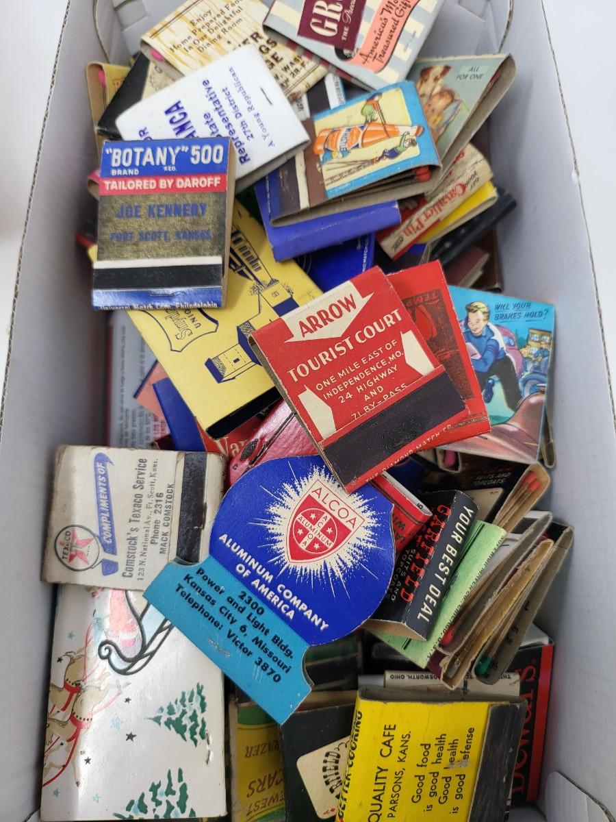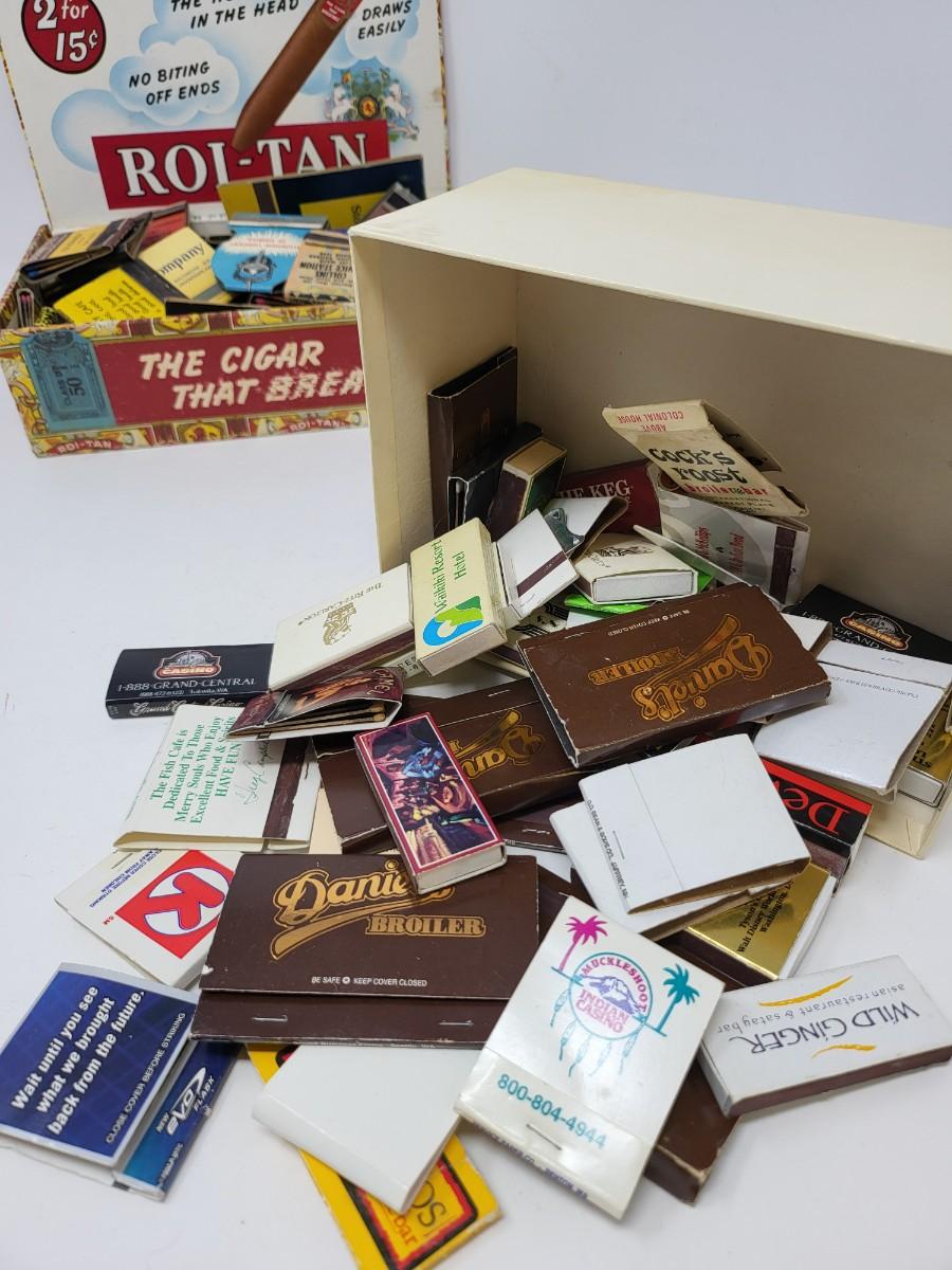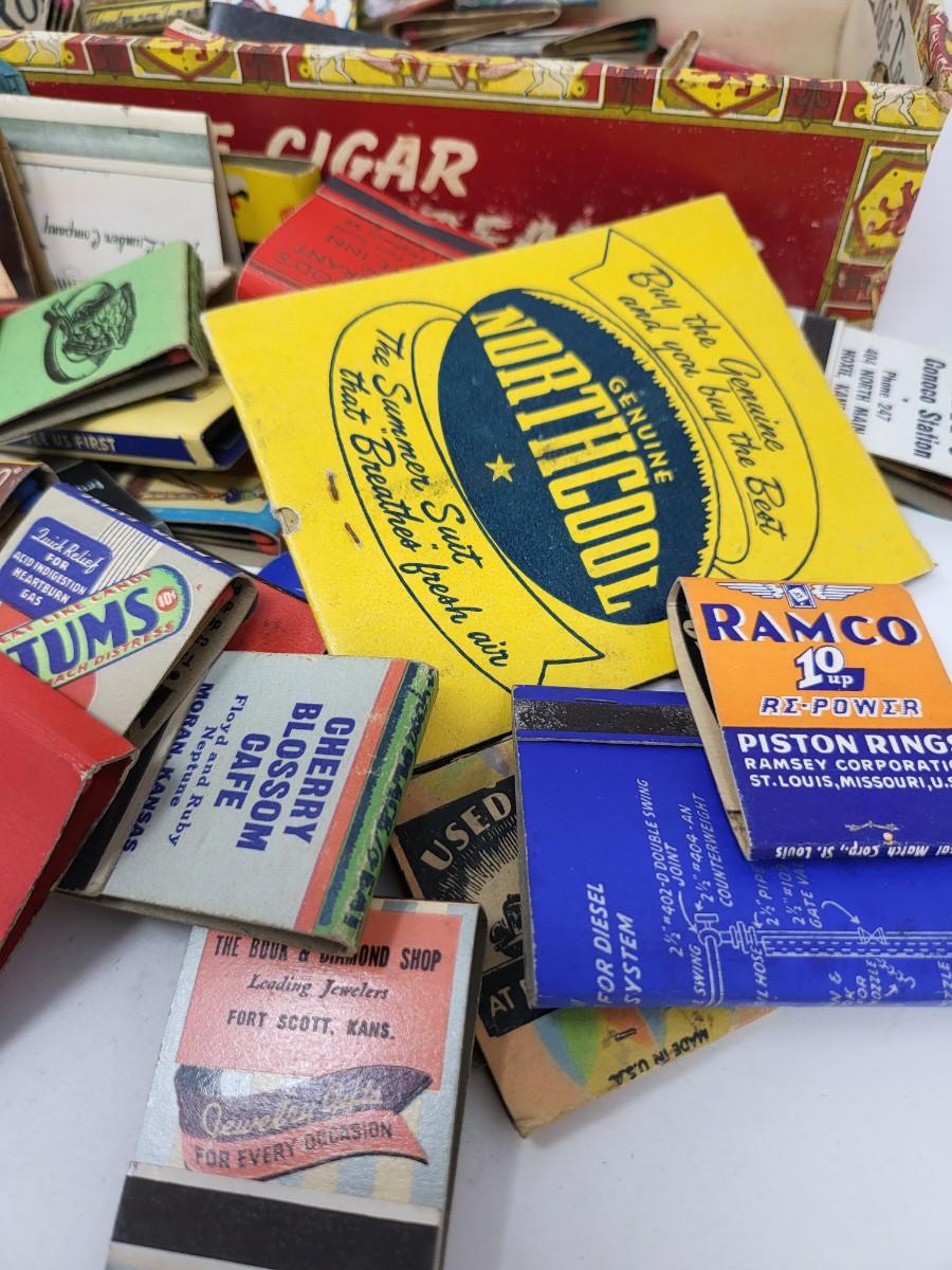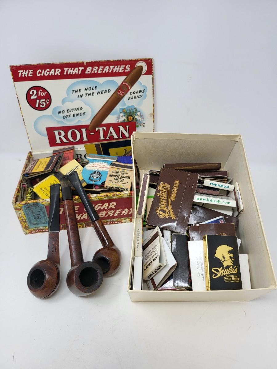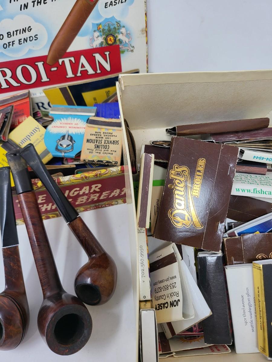 Mostly vintage matchbooks + three Briar pipes.