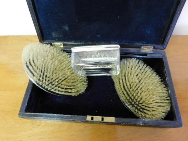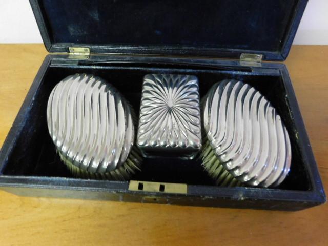 Box with Silver Plate Brush and Vanity Jar