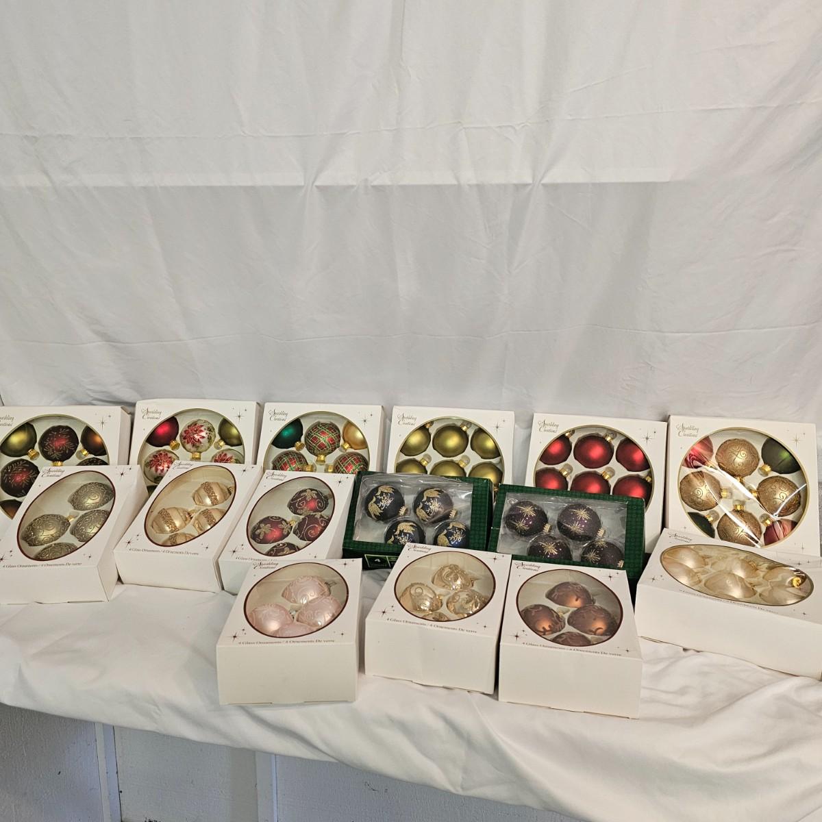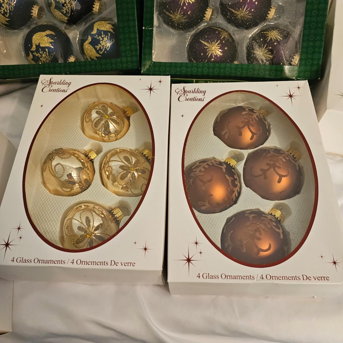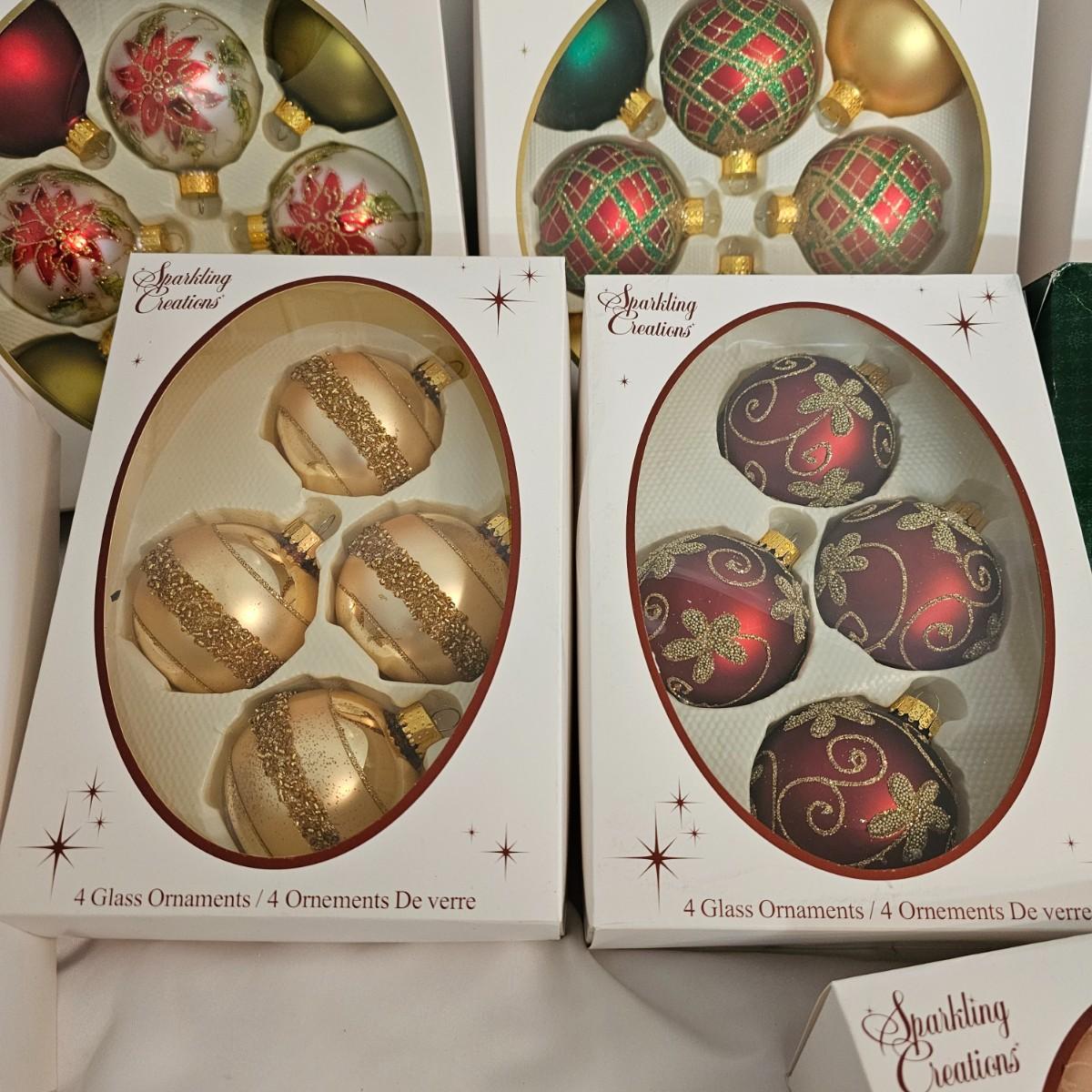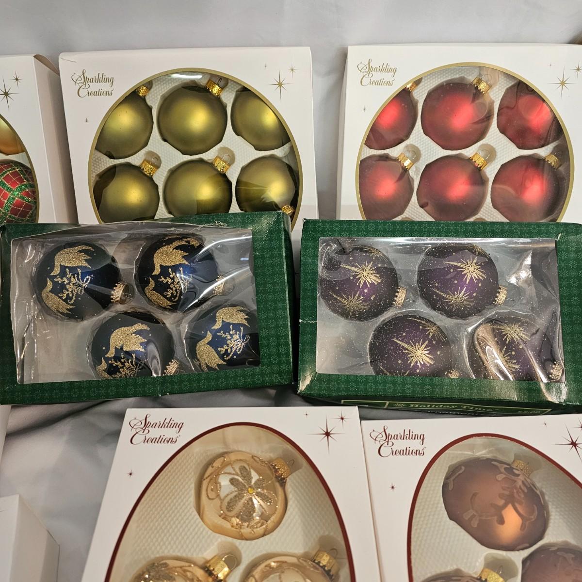 Fifteen boxes of glass Christmas ornaments, Holiday Time and Sparkling Creations brands. All in original boxes, various colors and patterns. See photos for details. Shipping available.