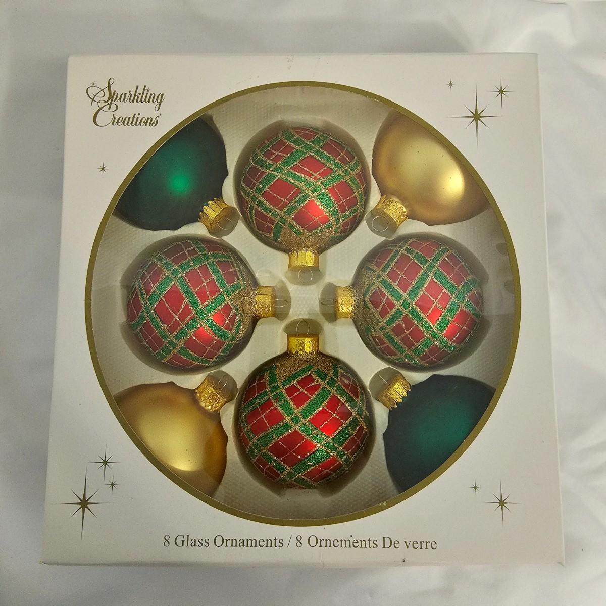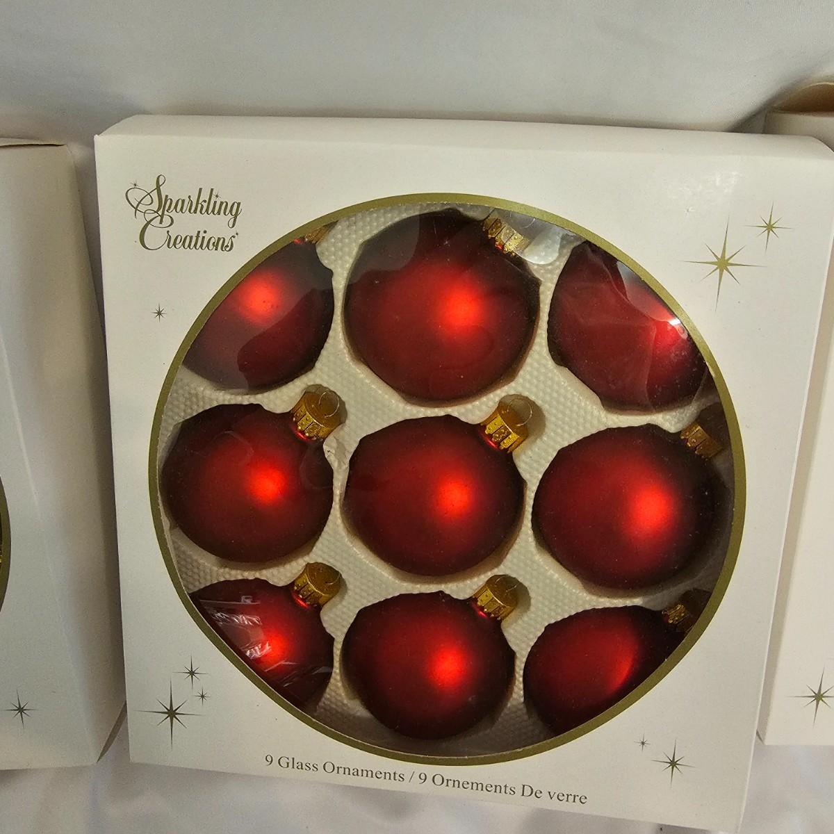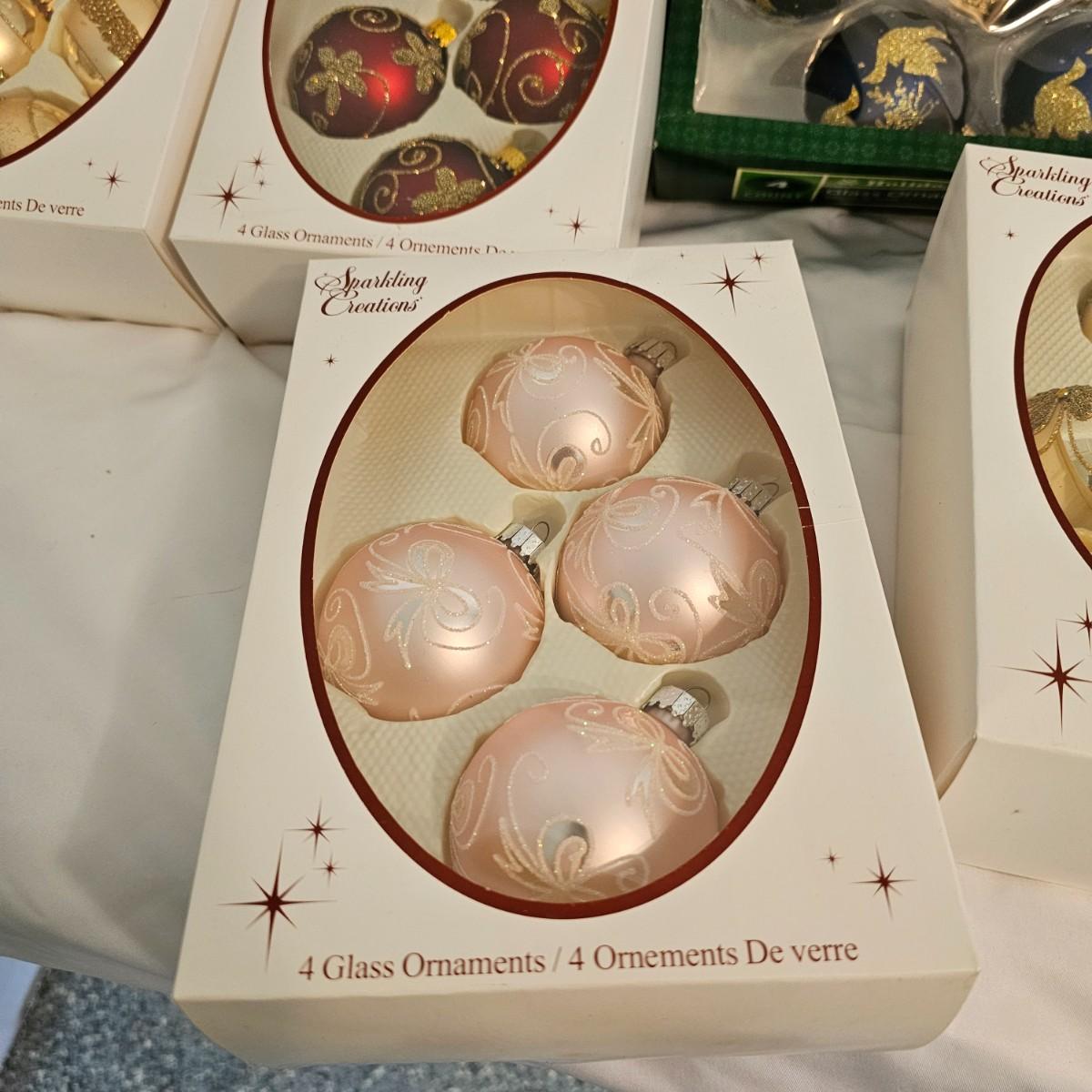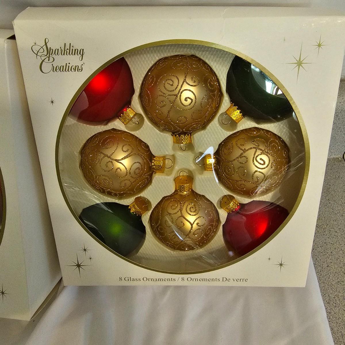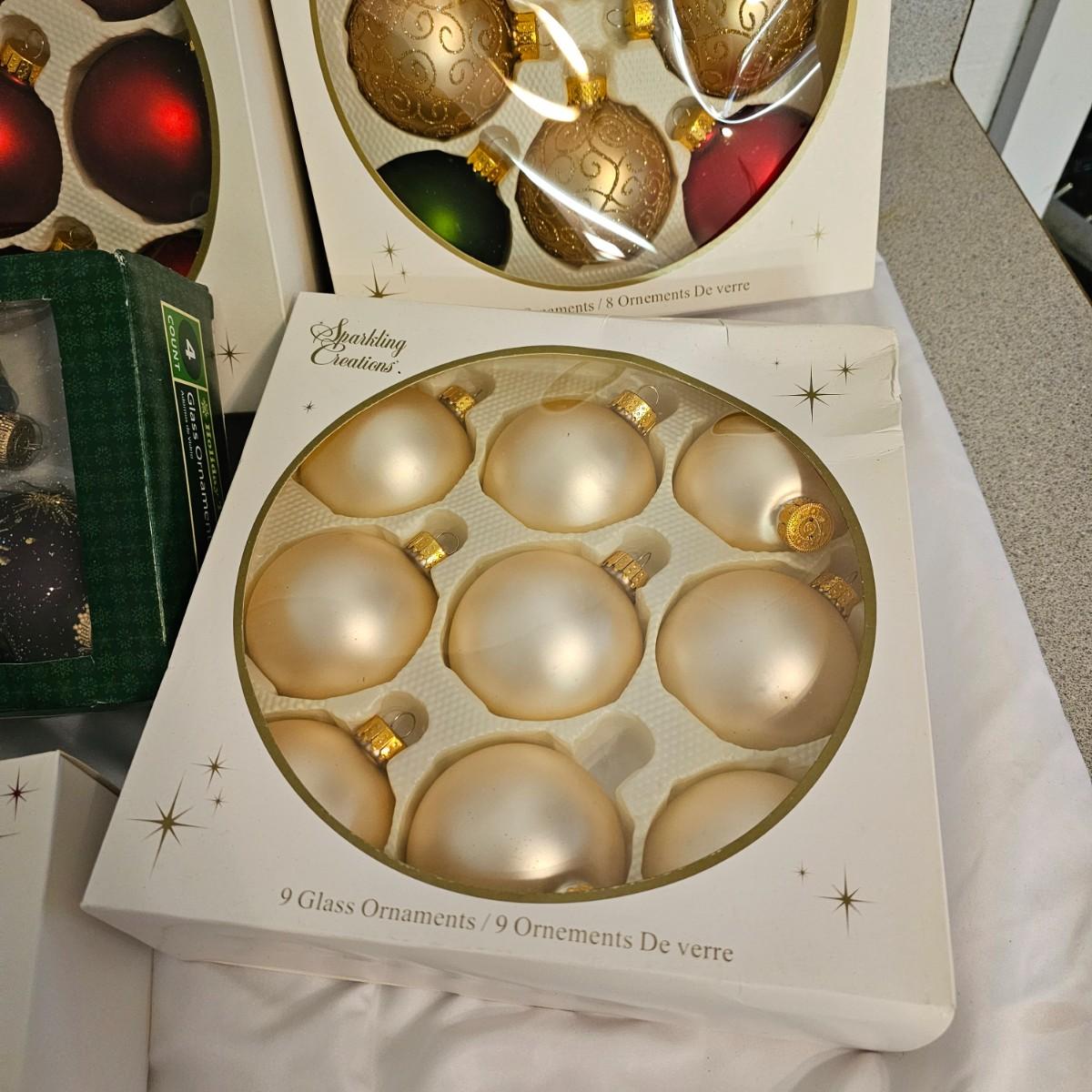 Fifteen boxes of glass Christmas ornaments, Holiday Time and Sparkling Creations brands. All in original boxes, various colors and patterns. See photos for details. Shipping available.