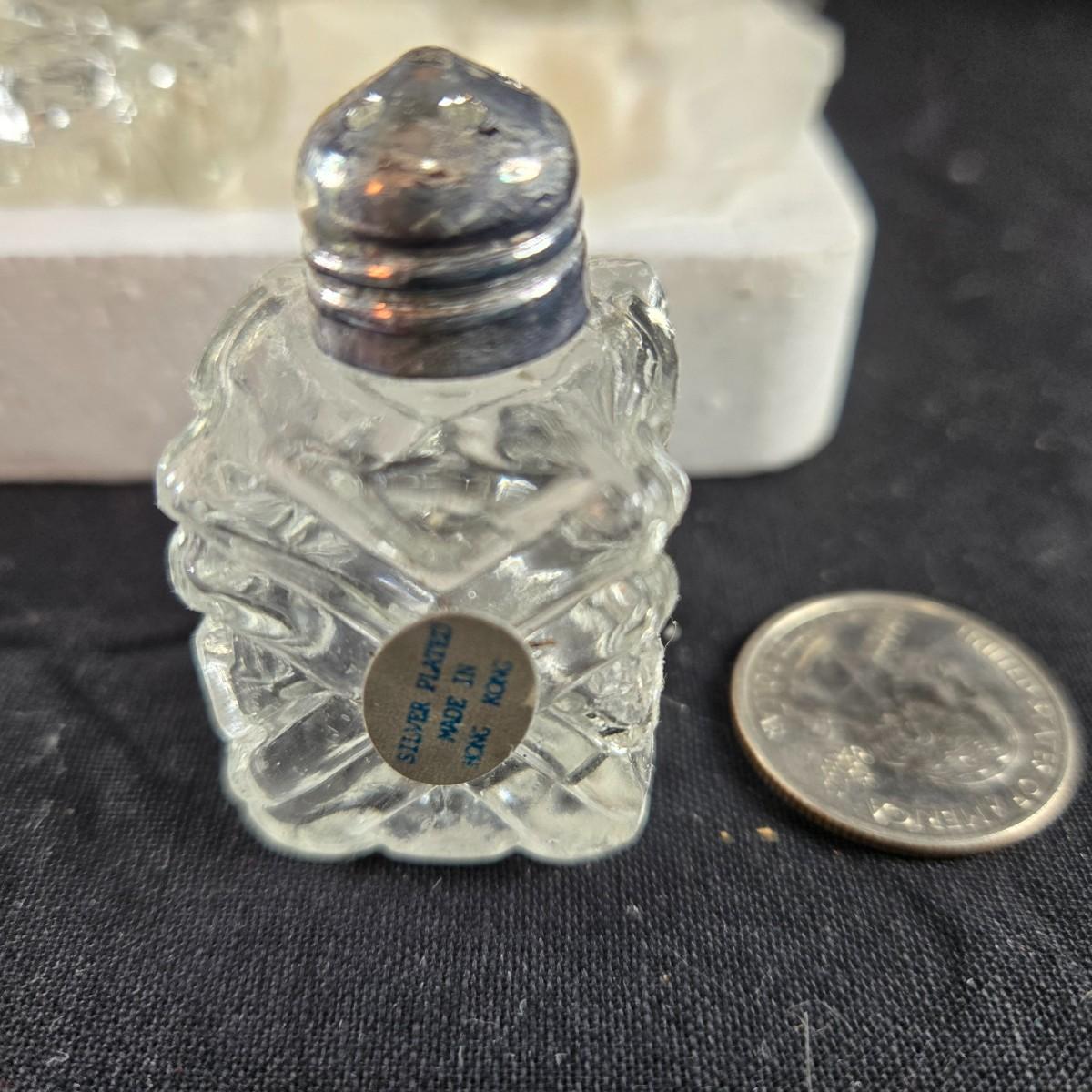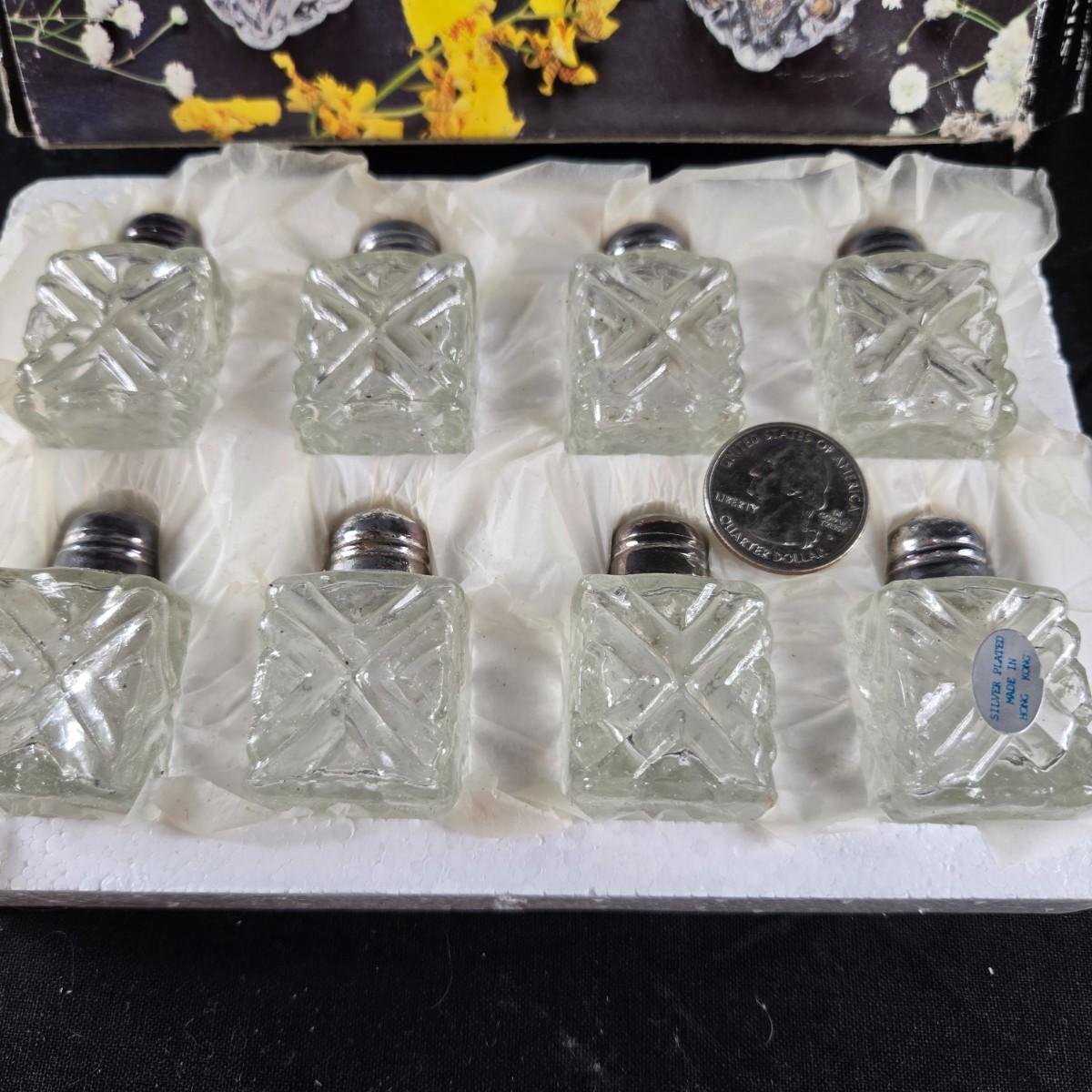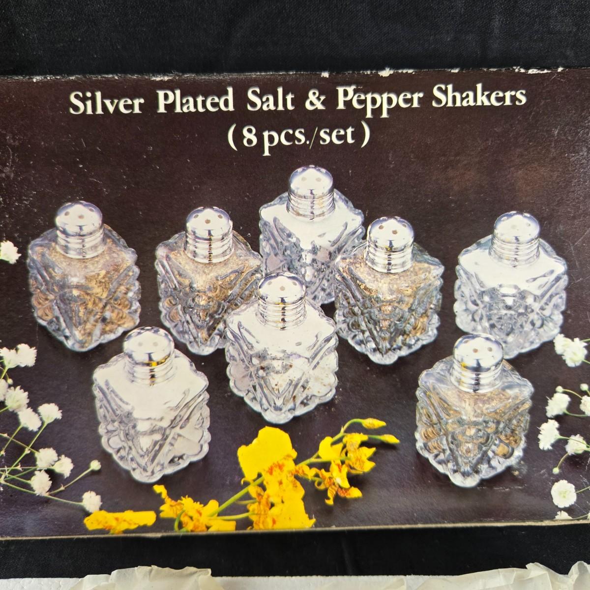 This auction lot is for a Boxed Set of Individual Salt & Pepper Shakers. This boxed set includes 8 pairs of silver-plated caps with glass salt and pepper shakers. The box is a tad tattered but the shakers have never been used. Perfect for your next dinner party.