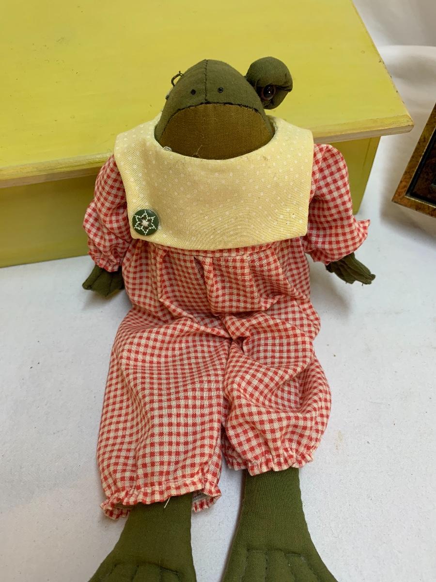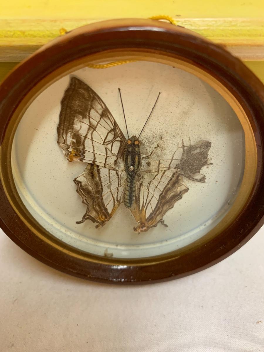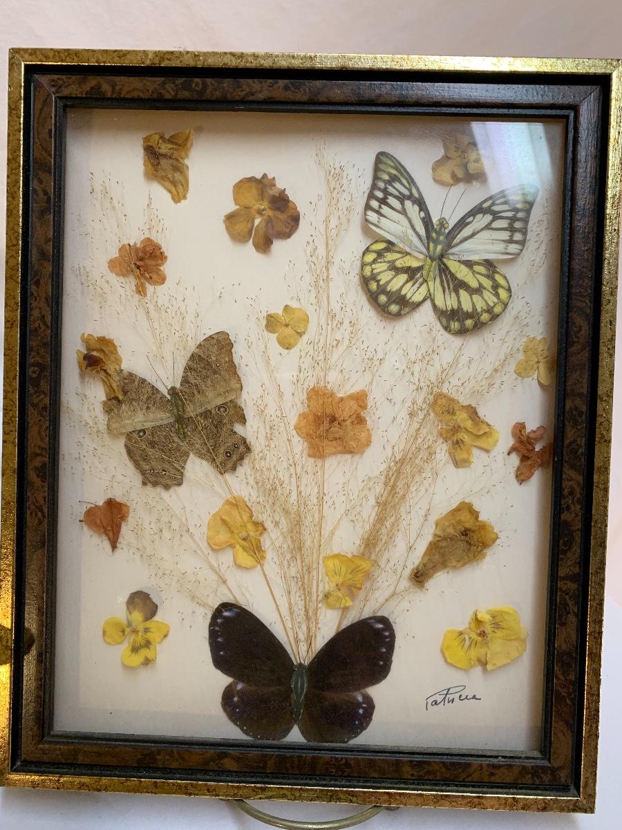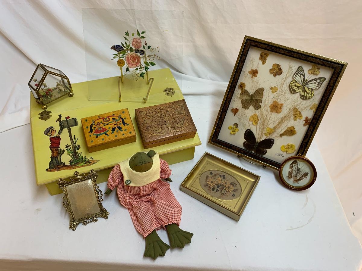 Framed butterflies, darling yellow letter box, hand-painted glass, tiny brass and glass terrarium, hand-carved box, hand-painted trinket box (both from world travels), etc...oh, and the frog!