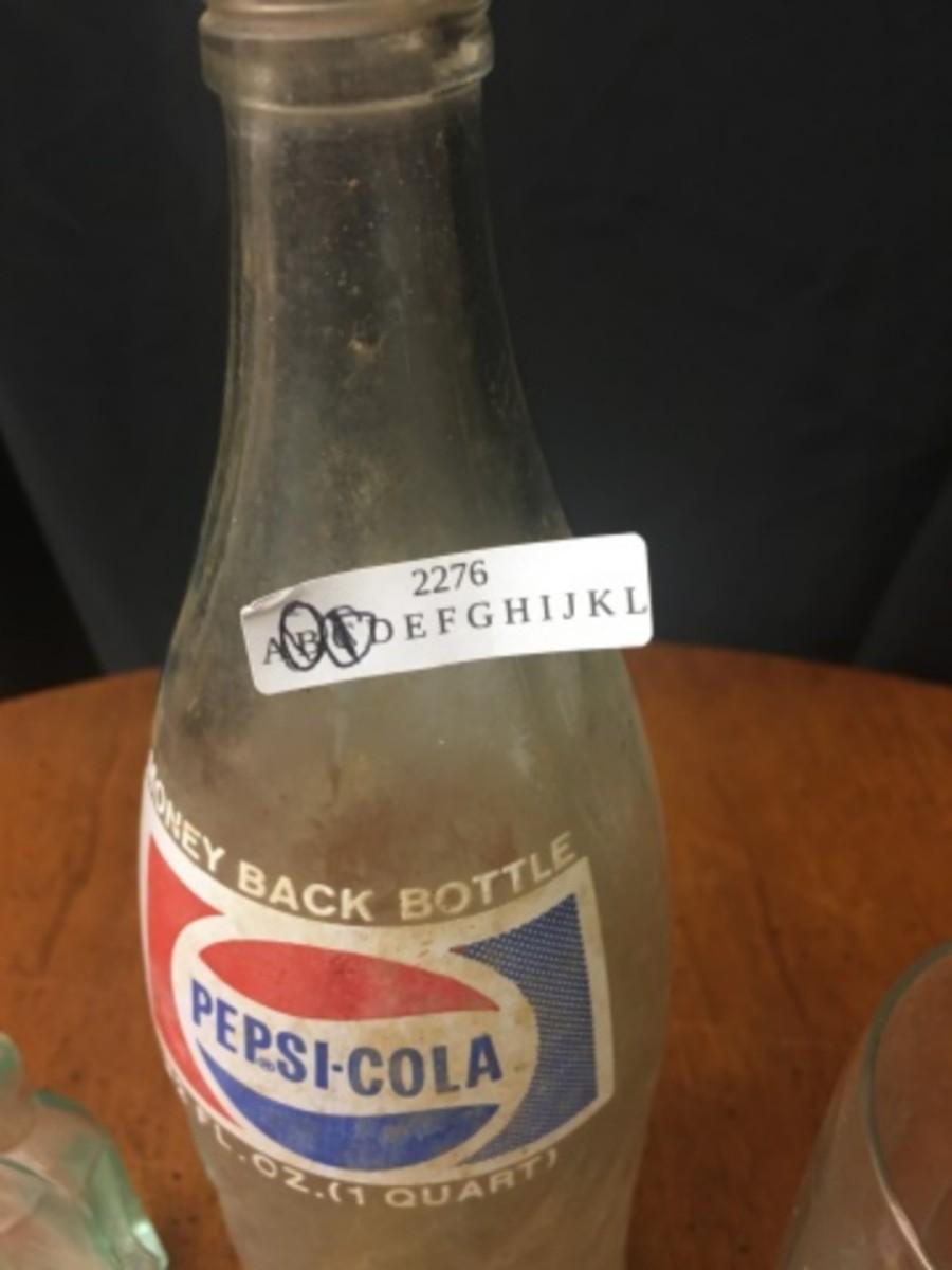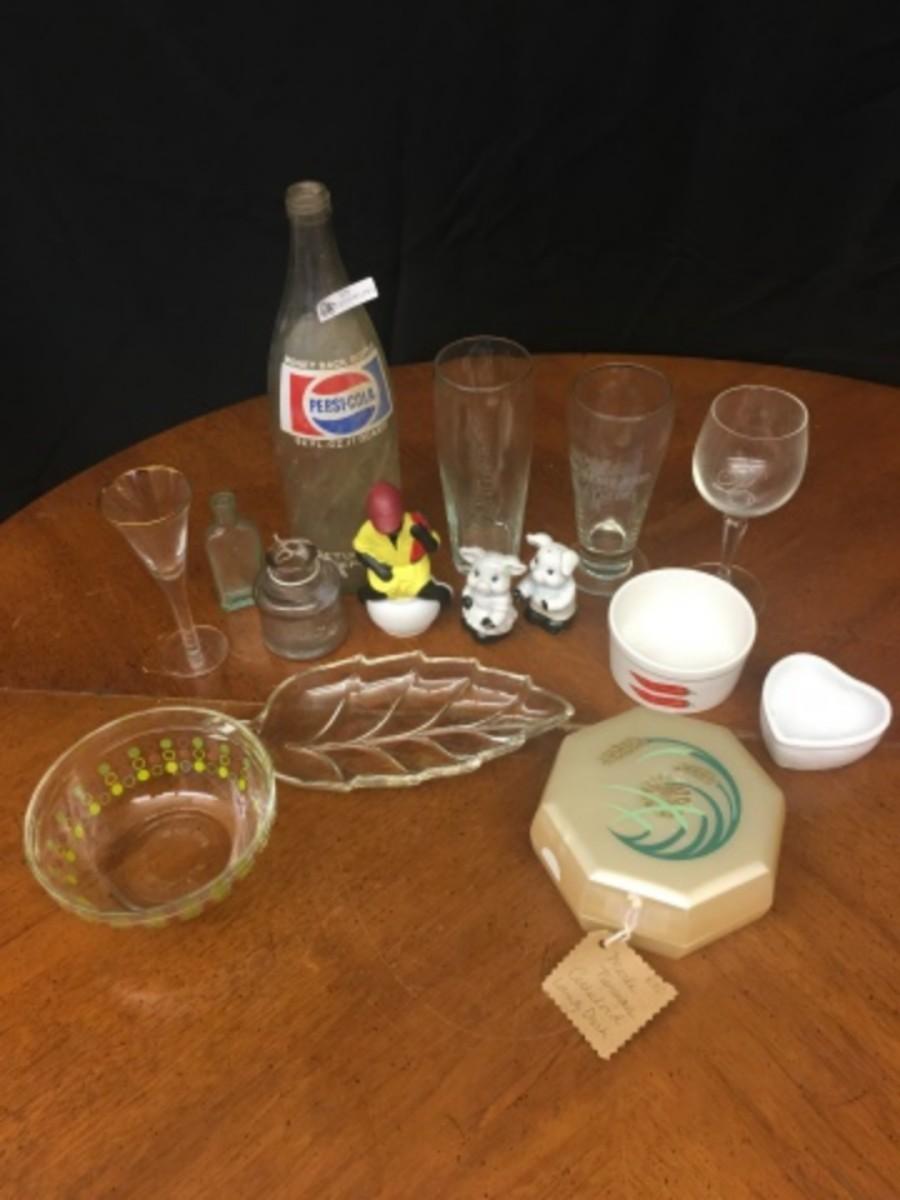 vintage glassware:lot sherry glass, (2) small apothecary bottle, pig s & p, americana figurine, 2 beer glasses, wine glass, pepsi bottle, leaf dish, salsa dish, heart trinket dish, MCM glass bowl, vintage Merle Norman celluloid covered vanity dish;