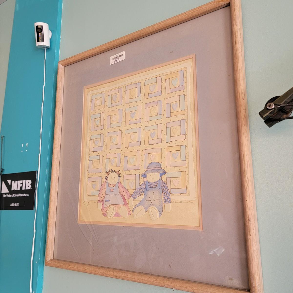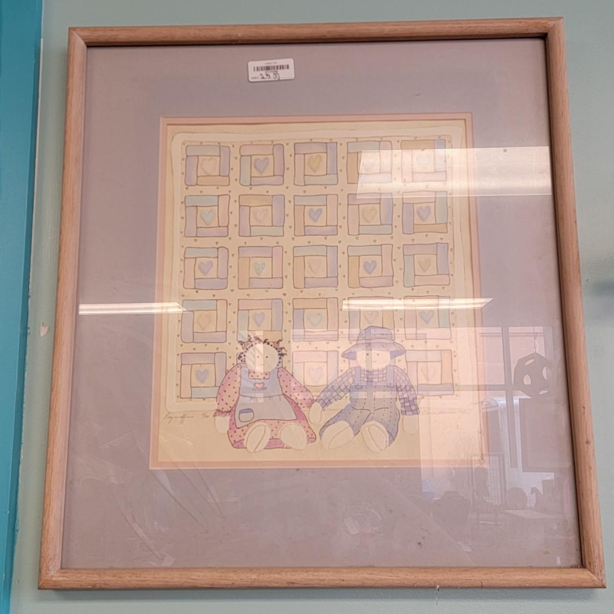 Boy and Girl Doll Framed Print with Hearts in the background.