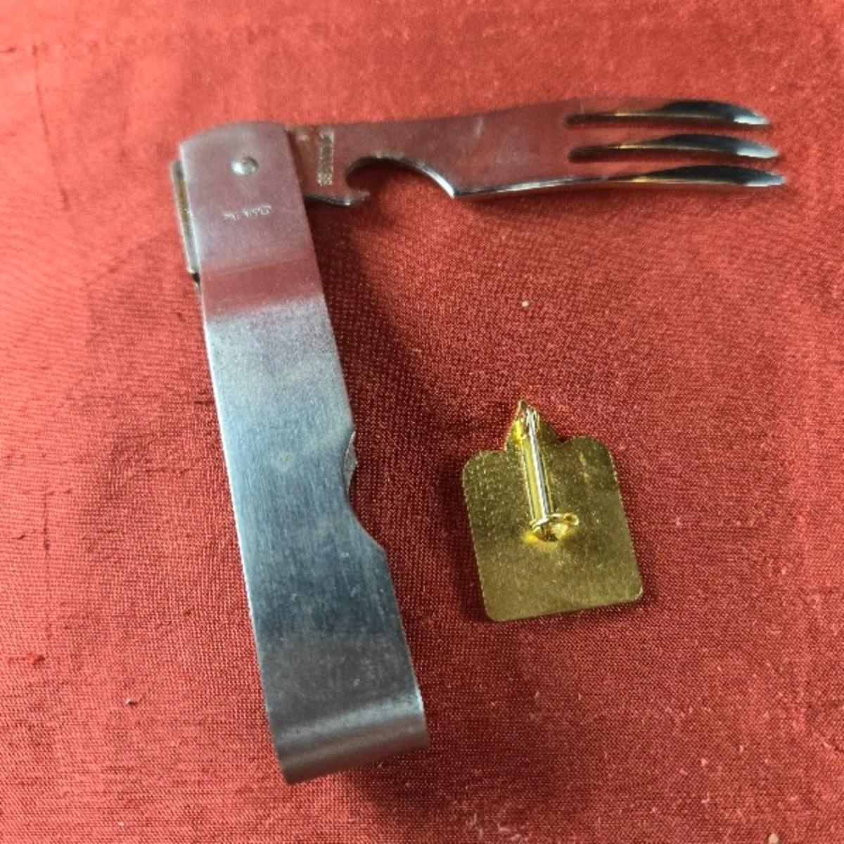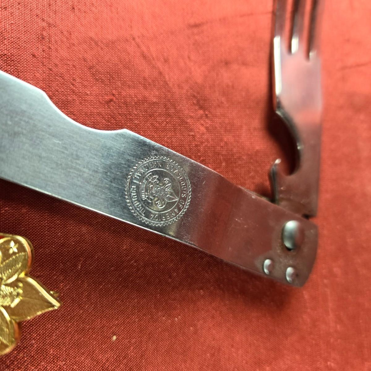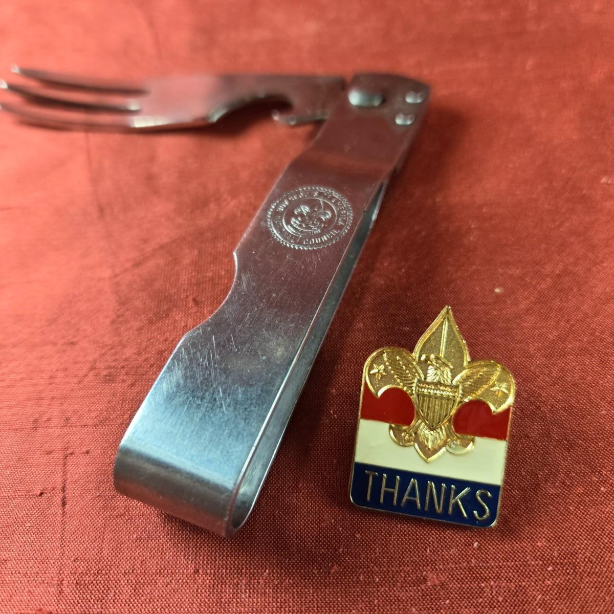 This auction lot is for a couple of Boy Scout Collectibles. This lot has a Boy Scout Travel Fork and a Lapel Pin. You never know when you might need a fork. Nice vintage Scout collectible items.