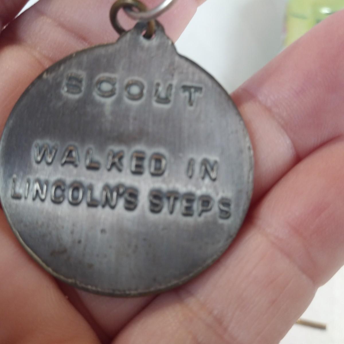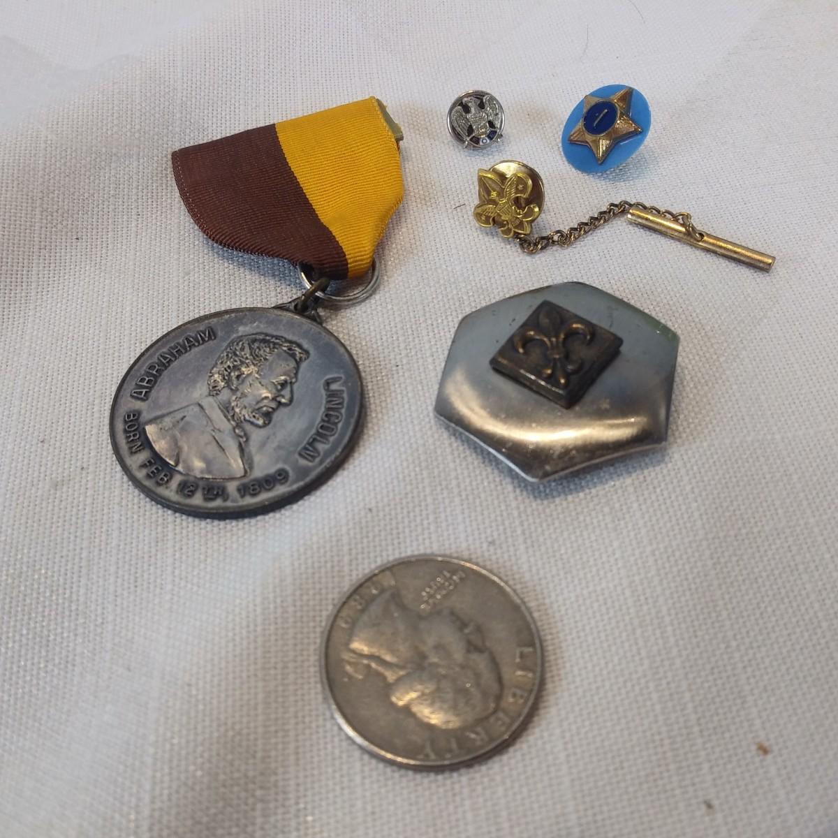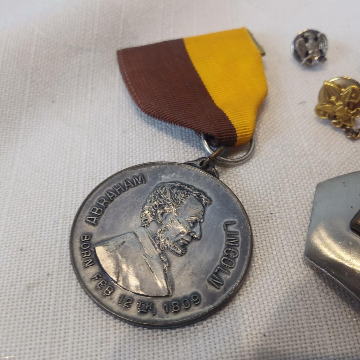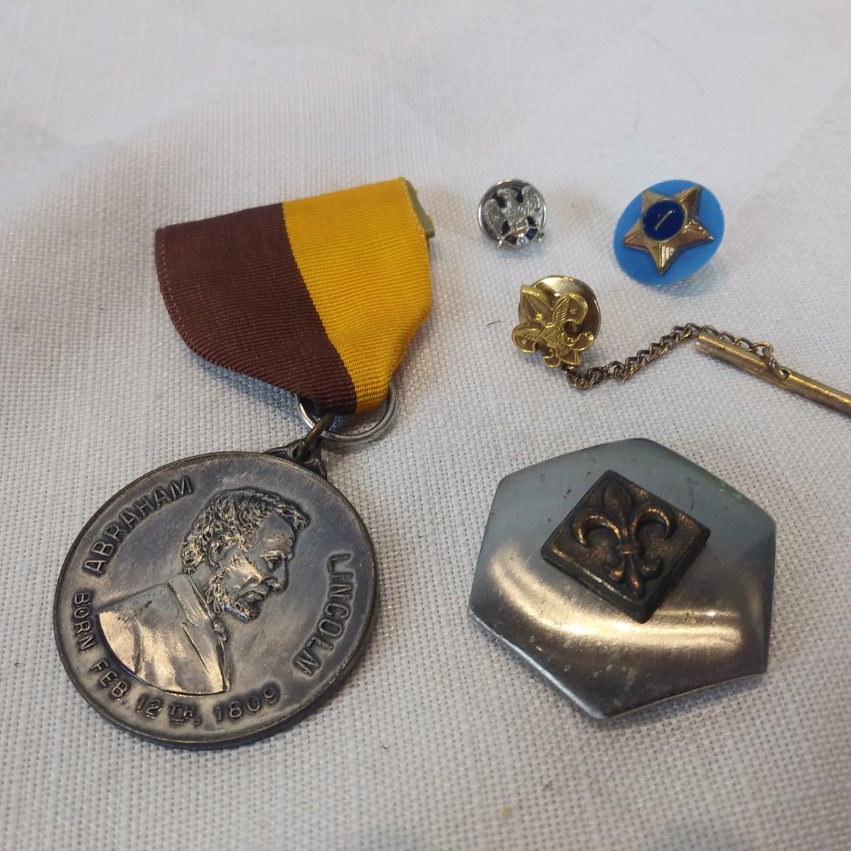 This auction lot is a grouping of Boy Scout "Lincoln Trail" Memorabilia. Most notable is the metal for completing the Lincoln Trail - the owner said it was tough. Also included is a neckerchief clip, a one year pin, an eagle pin and a tie pin. Nice collectibles.