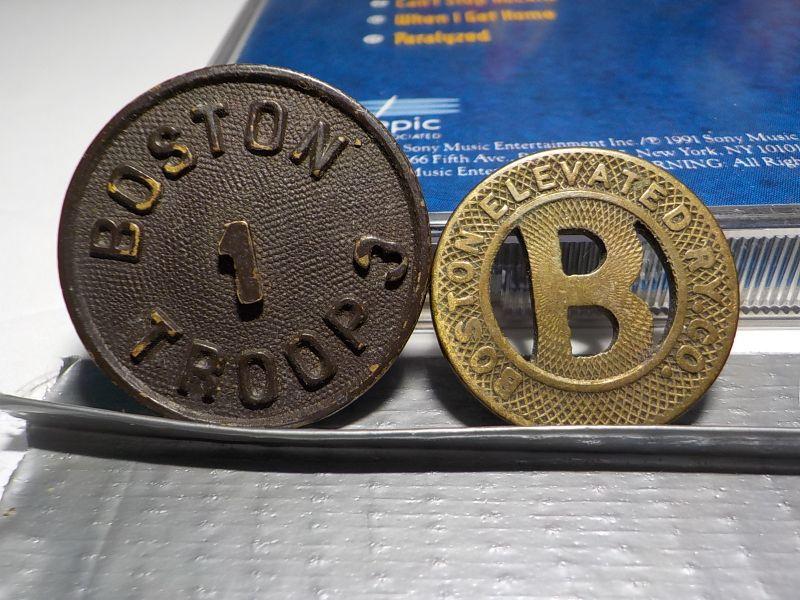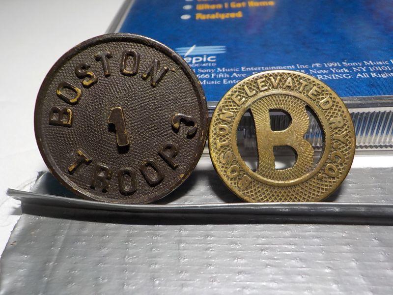 Boy Scouts of America "Boston 1st. Troop 3 pin, and 1950's Boston Elevated Trolly coin.