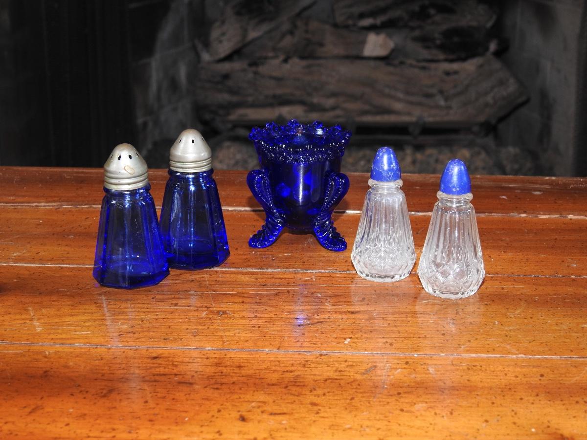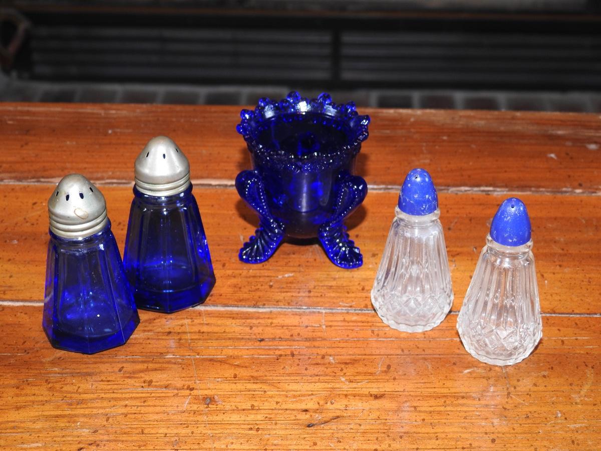 Perfect for any kitchen collection. BOYD art glass cobalt blue three footed, forget me not toothpick holder. In great condition. Hazel Atlas glass company, Ritz blue salt and pepper shaker set. In great used condition. and clear art glass with a blue lid salt and pepper shakers.