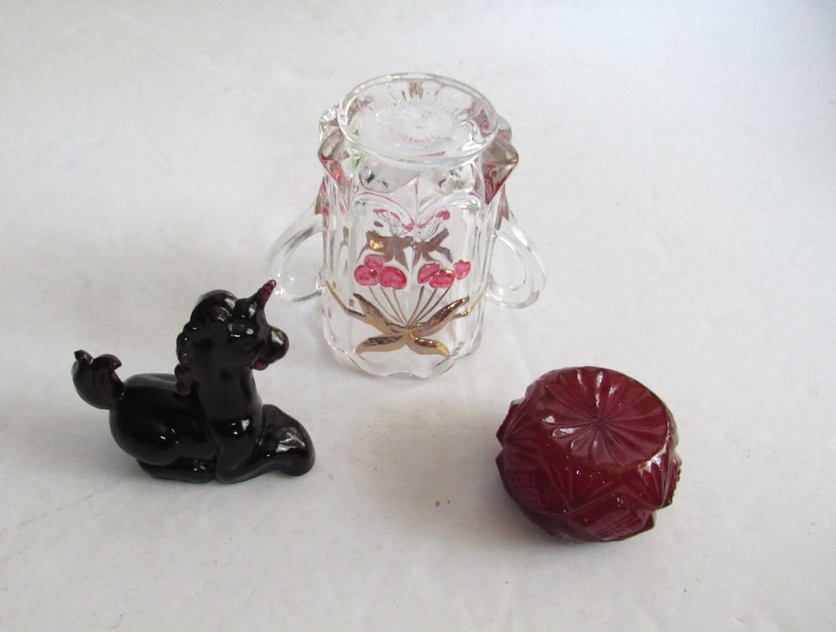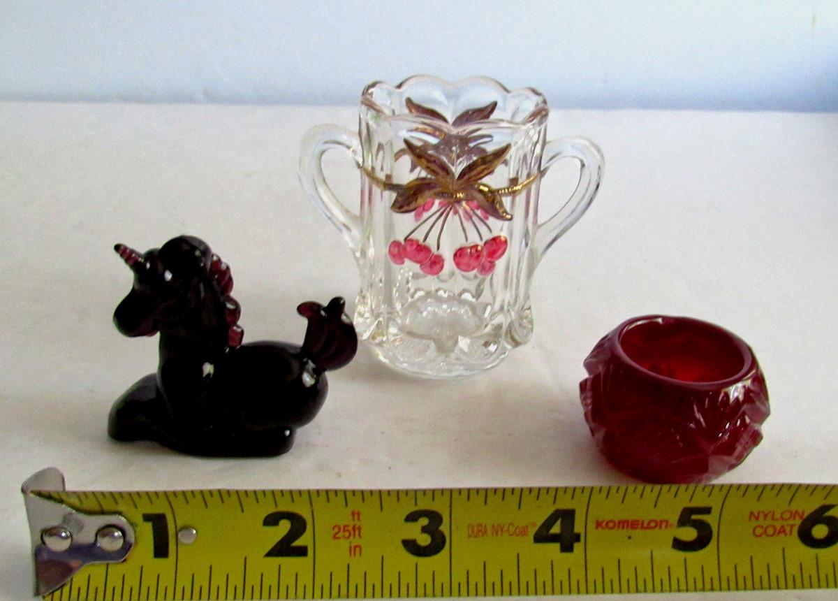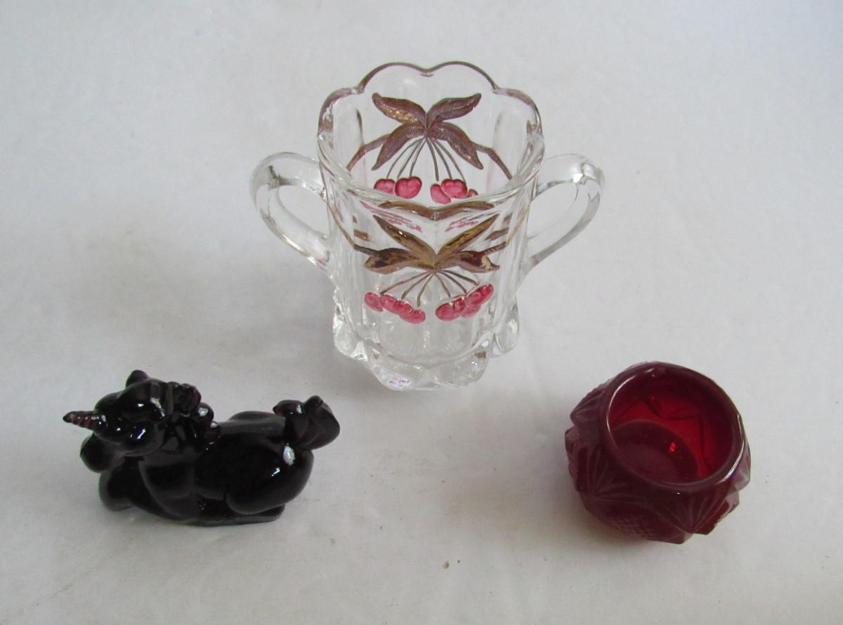 Boyd Small Amethyst Unicorn, Red Salt and Mosser Glass Childs Hand Painted Spooner