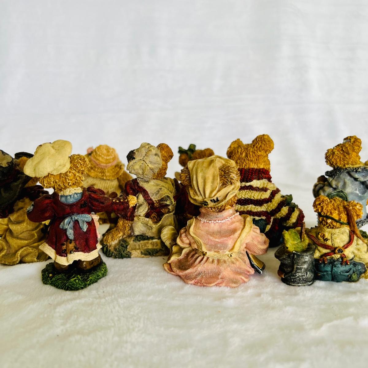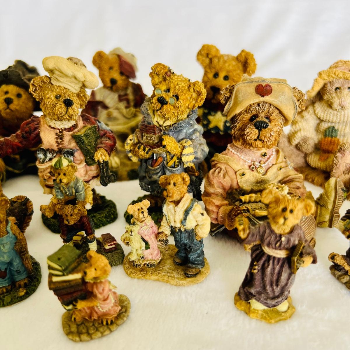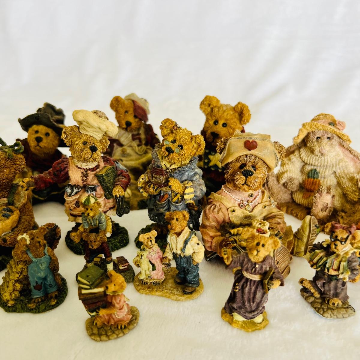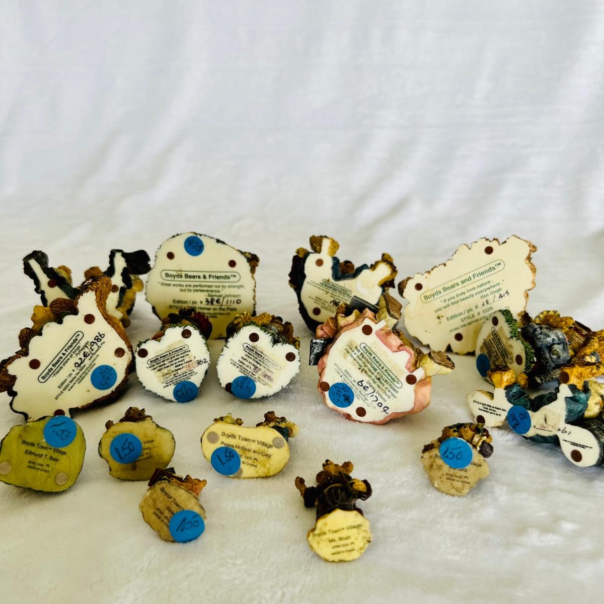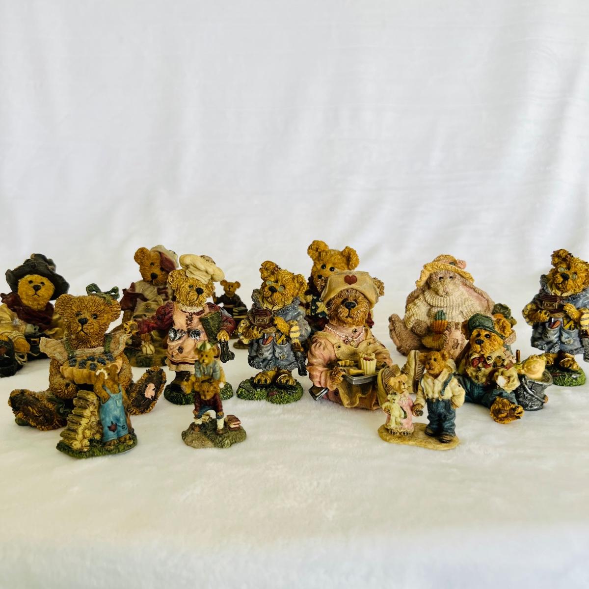 Lot includes 16 Boyds Bears and Friends figurines including six miniature figurines (tallest mini meas. 2”h). Two bears have chipped paws shown in last picture. No boxes.