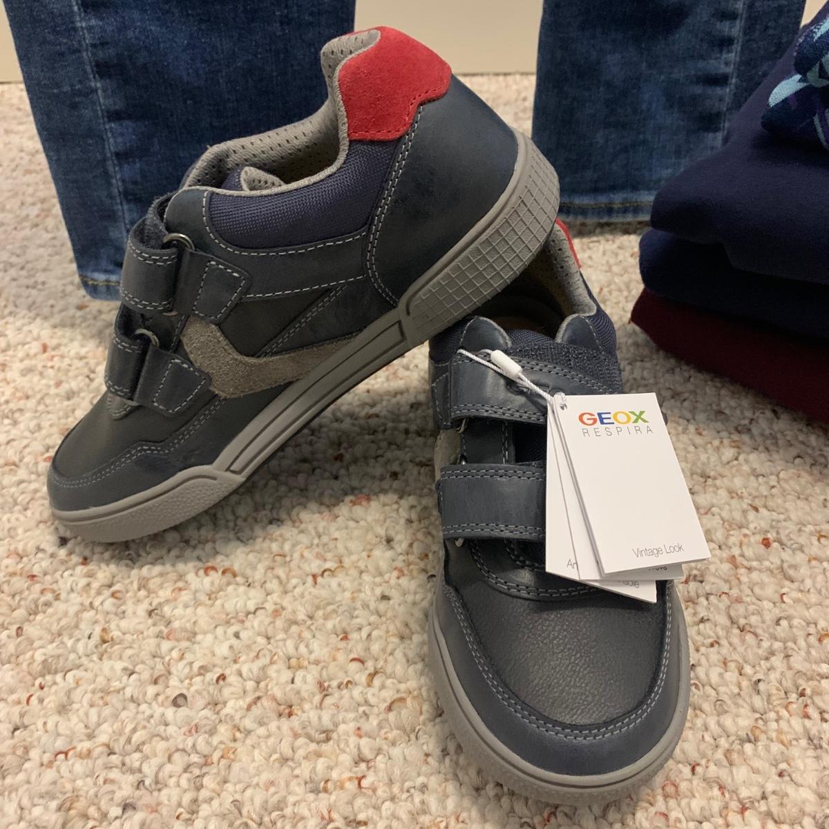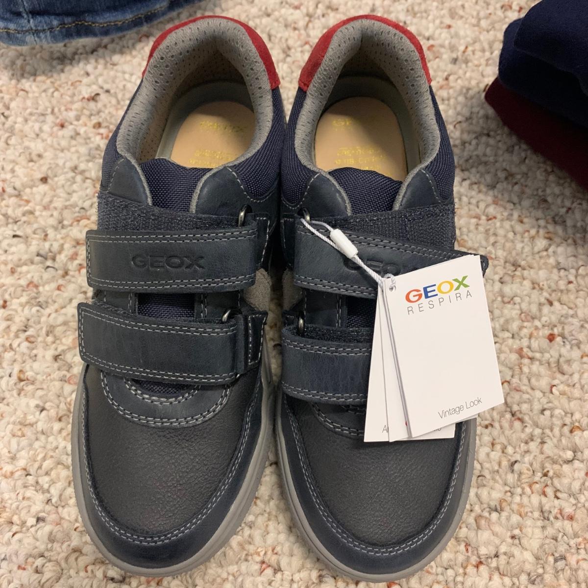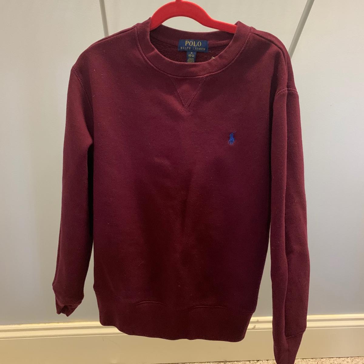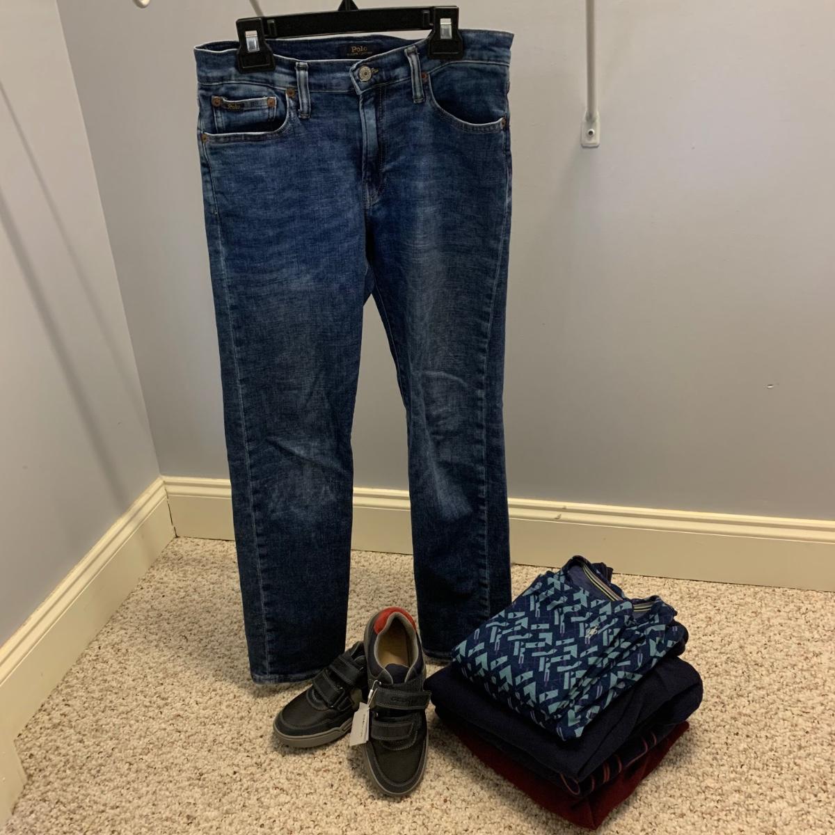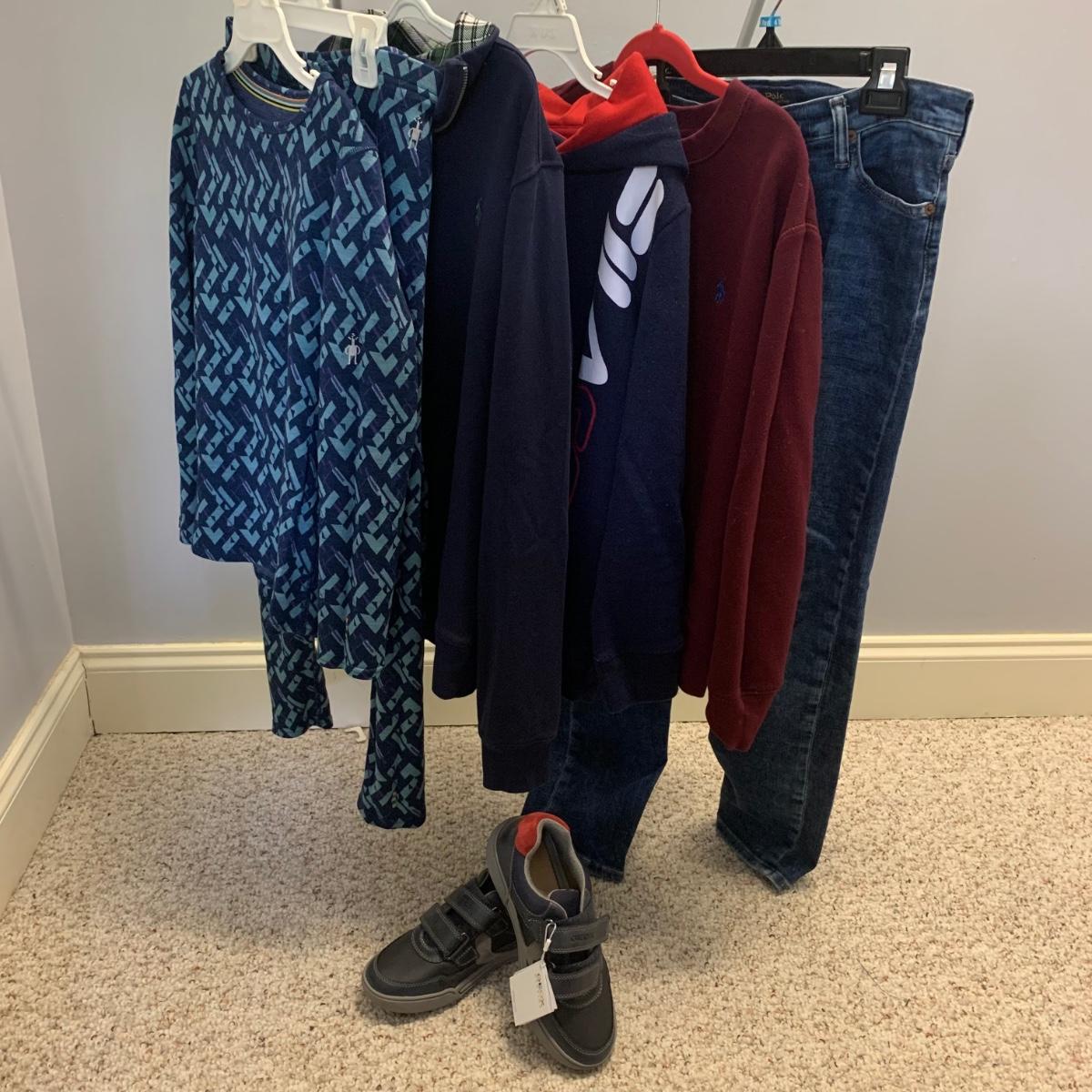 Selection of boys clothing including one medium wine colored Polo Ralph Lauren sweater, one large Polo Ralph Lauren sweater, one large FILA sweater, Polo Jeans, Smart Wool pajamas, and GEOX Respira size 4 shoes. Shoes are new with tags, please see photos for more details. Shipping available.