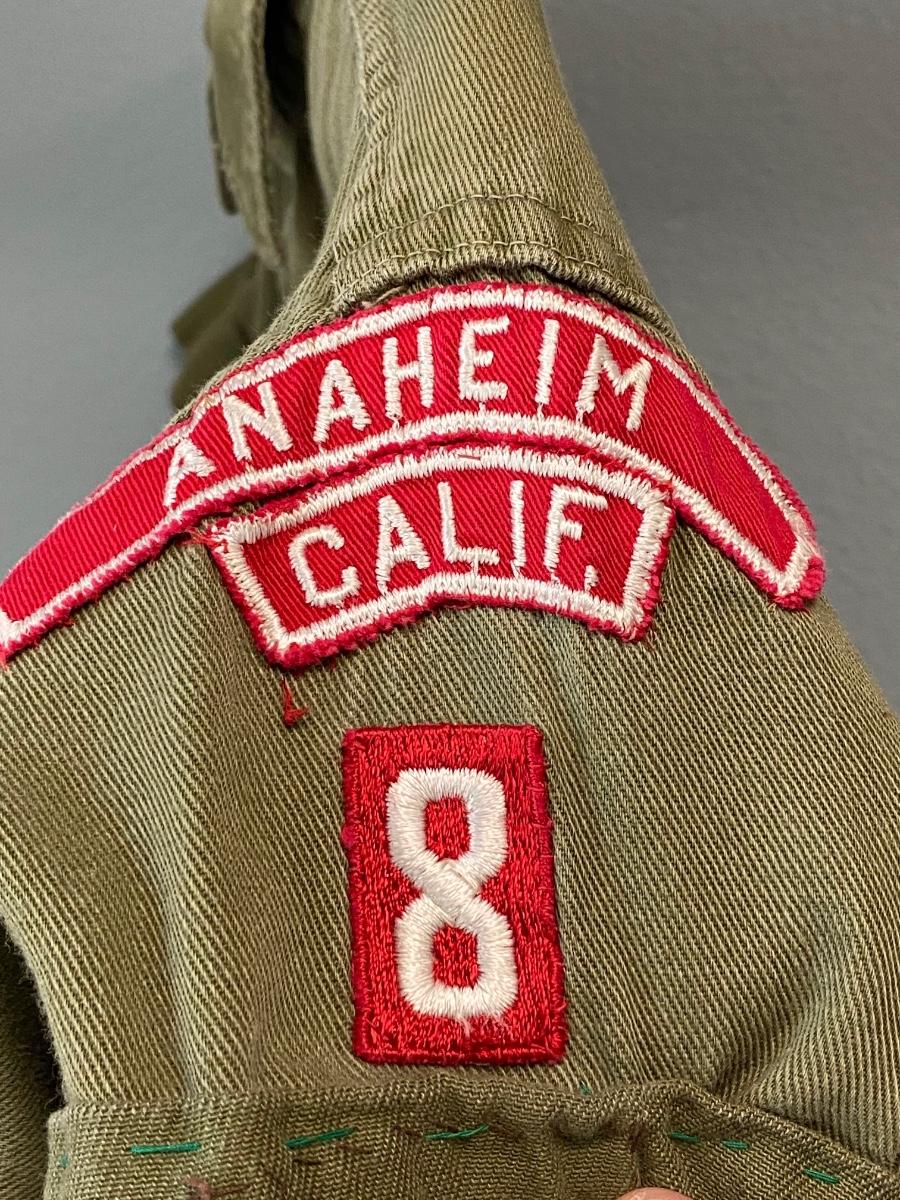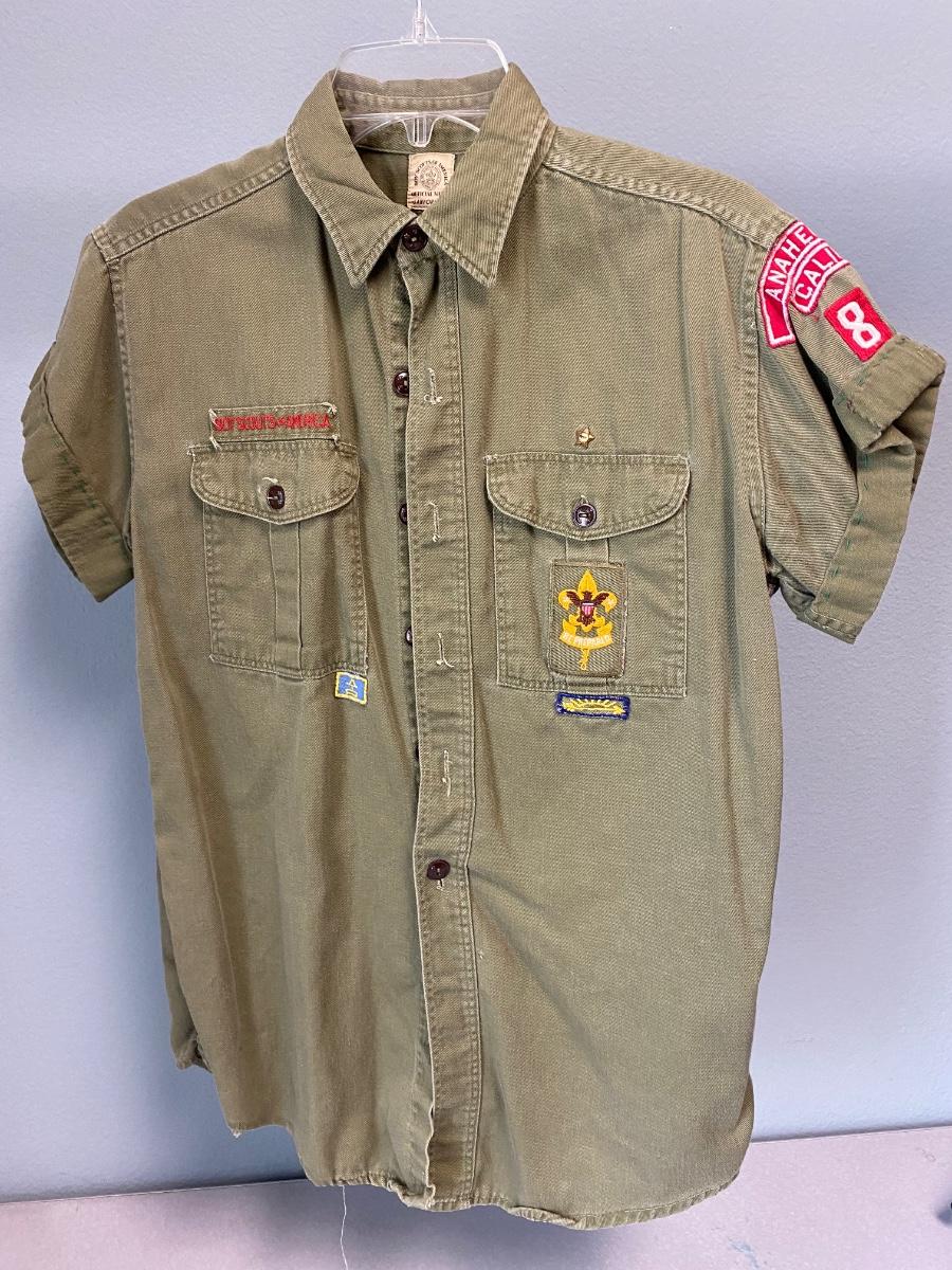 Boy Scouts of America Den 8 from Anaheim, CA uniform shirt. Has a couple patches attached. In good used condition. No size tag, looks like an adult small, maybe medium.