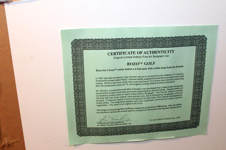 Bozo serigraph cell, framed, with COA, sight size 14" x 11"