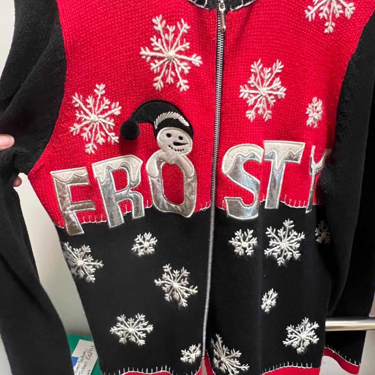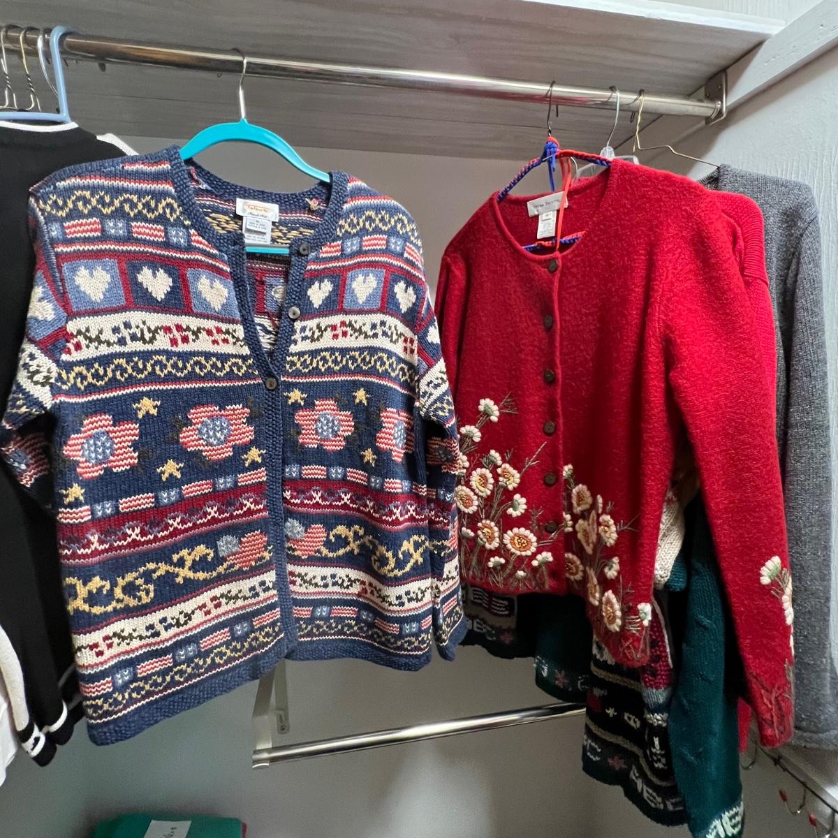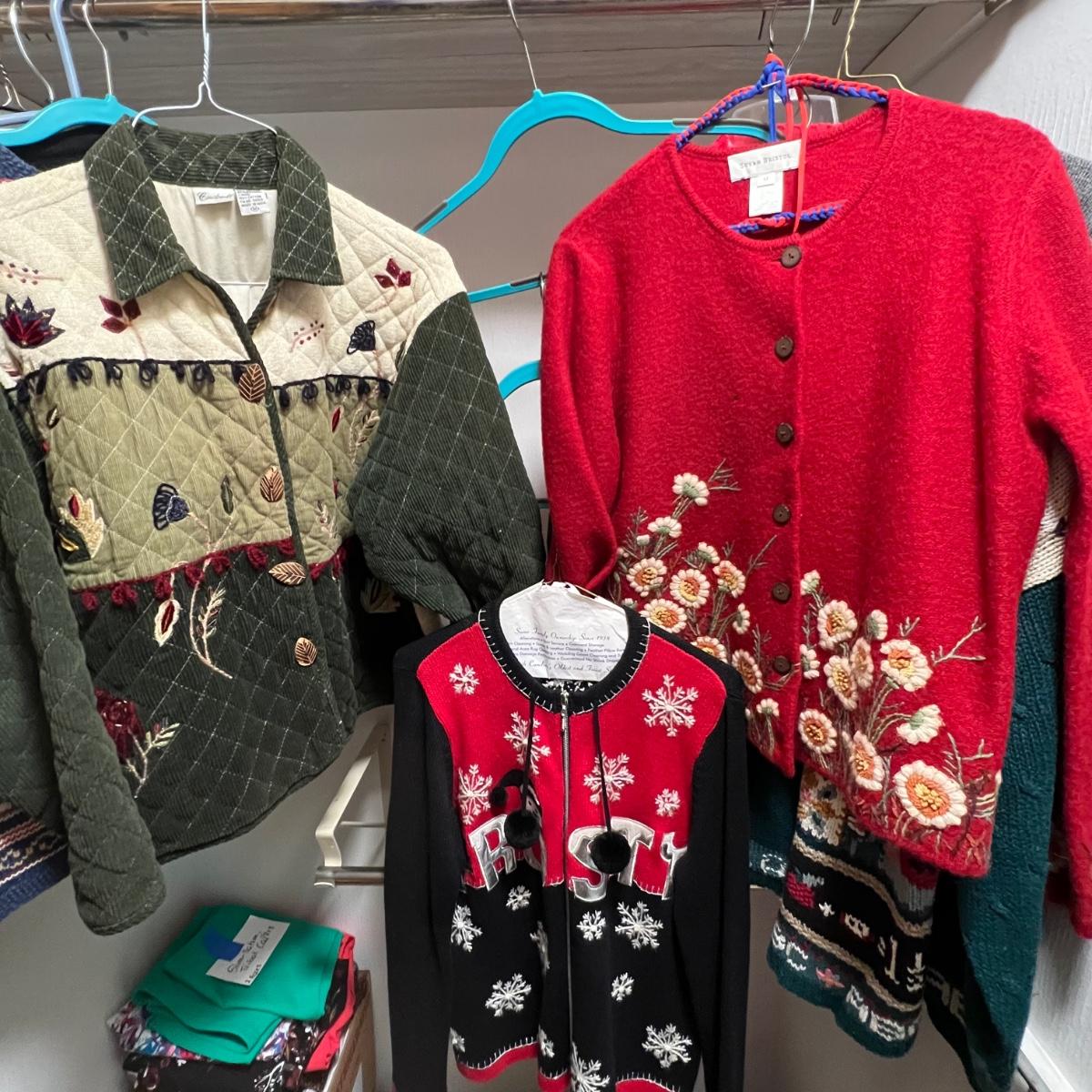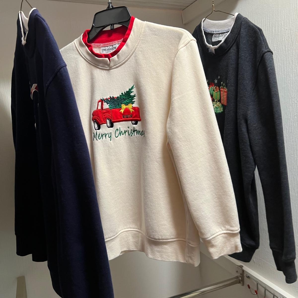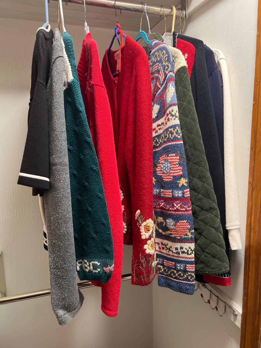A nice selection of 12 cardigans, sweatshirts and sweaters in sizes medium and large with one generously sized small. See images for brands and sizes. Please note the Susan Bristol piece has a small hole. A number of items are holiday themed.