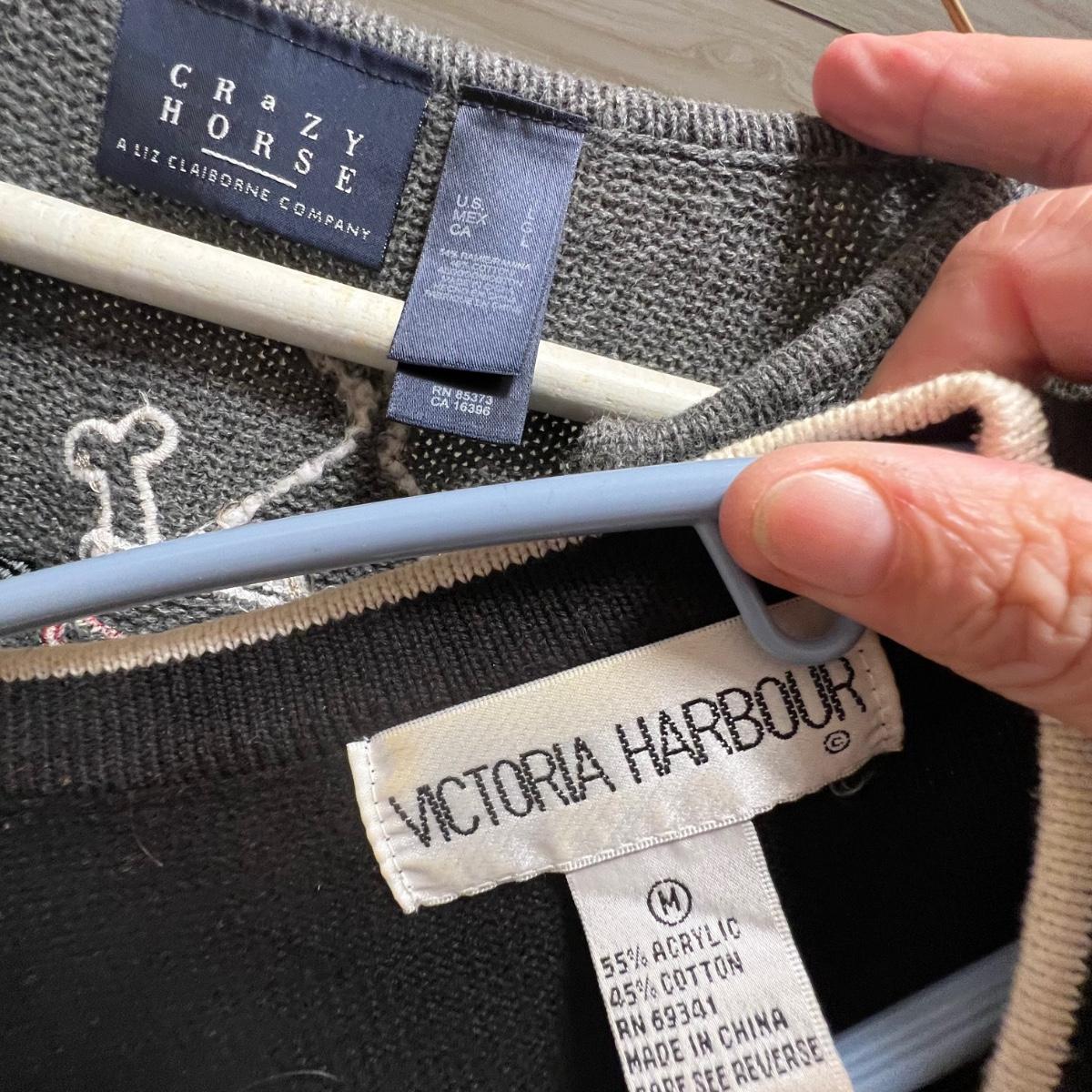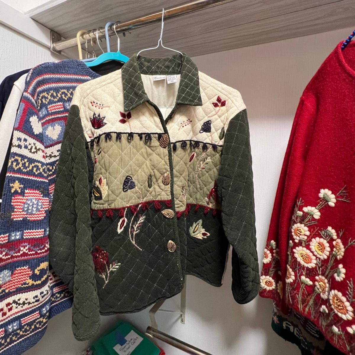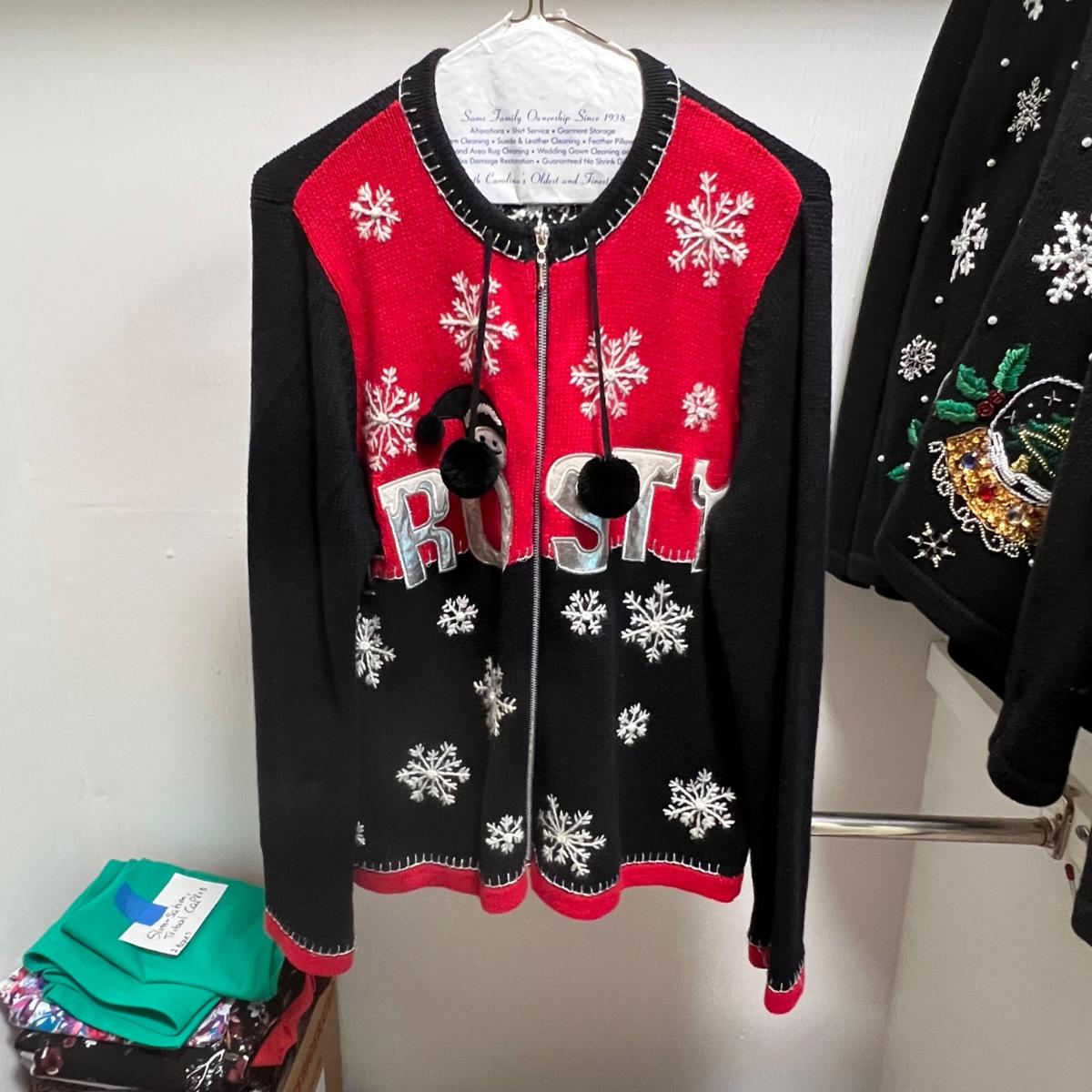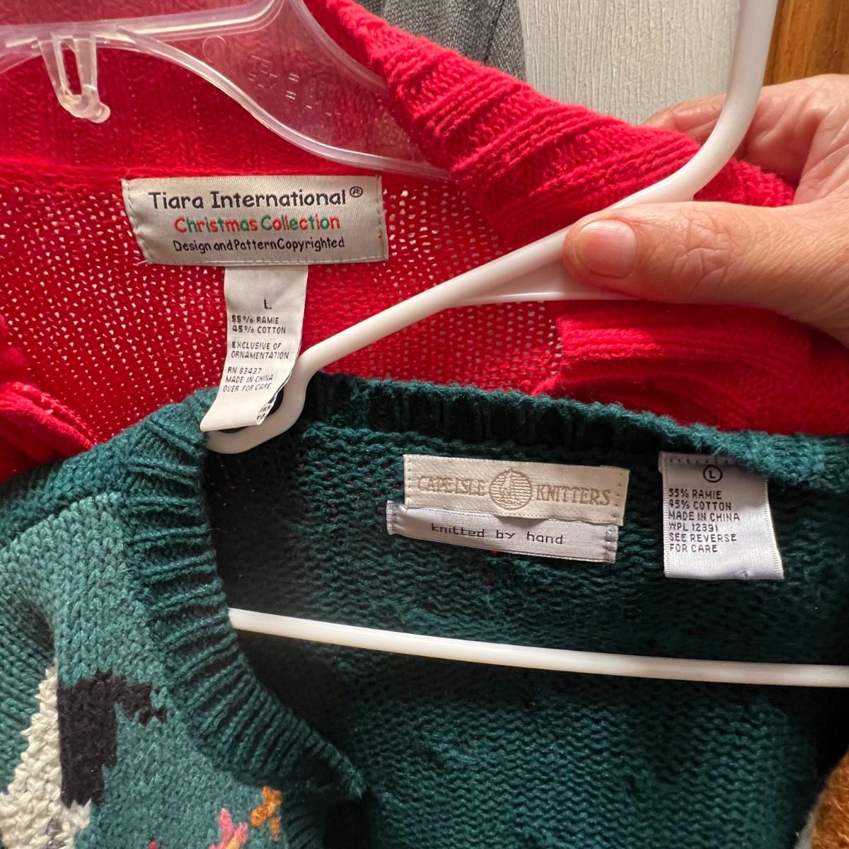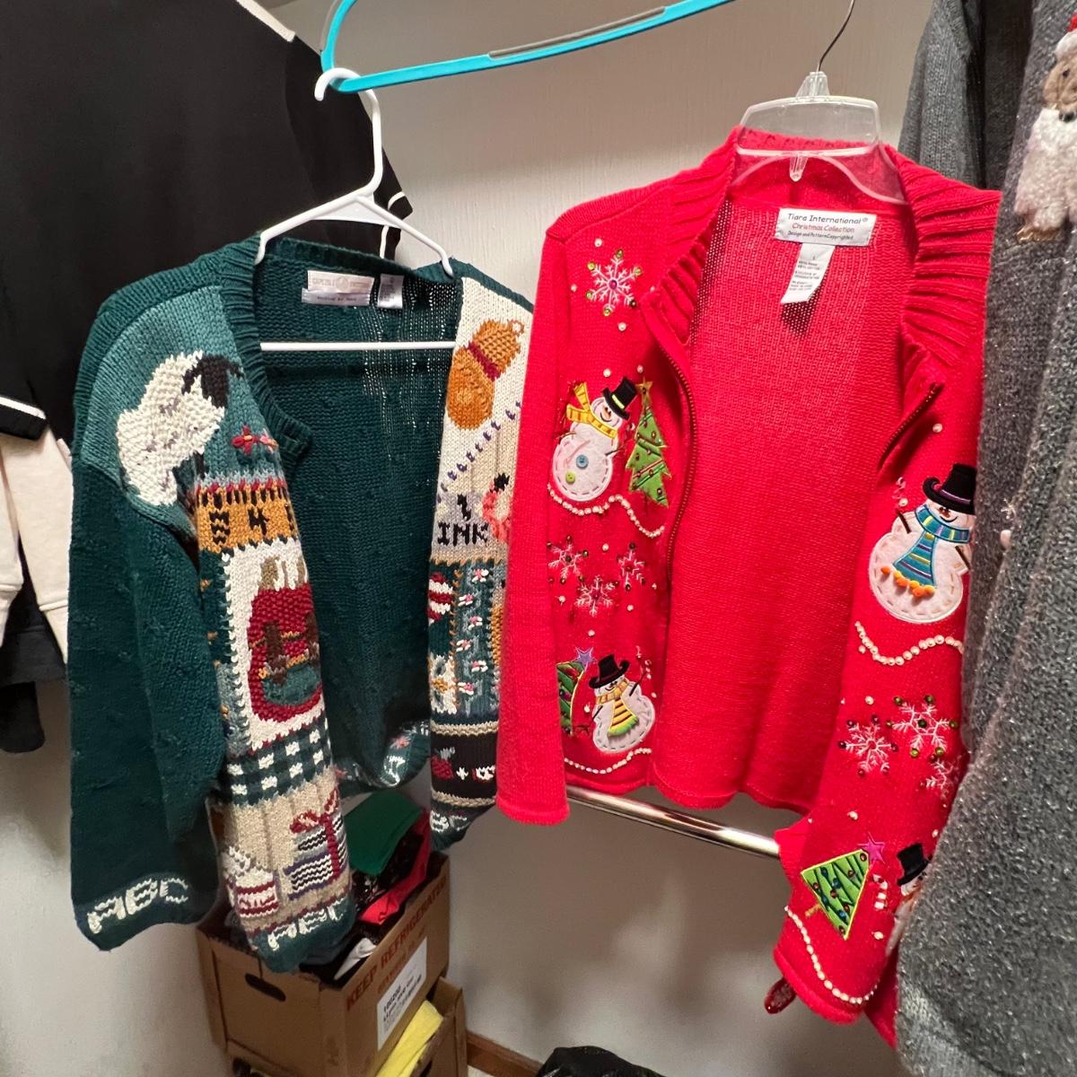 A nice selection of 12 cardigans, sweatshirts and sweaters in sizes medium and large with one generously sized small. See images for brands and sizes. Please note the Susan Bristol piece has a small hole. A number of items are holiday themed.