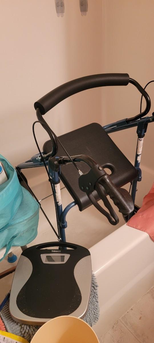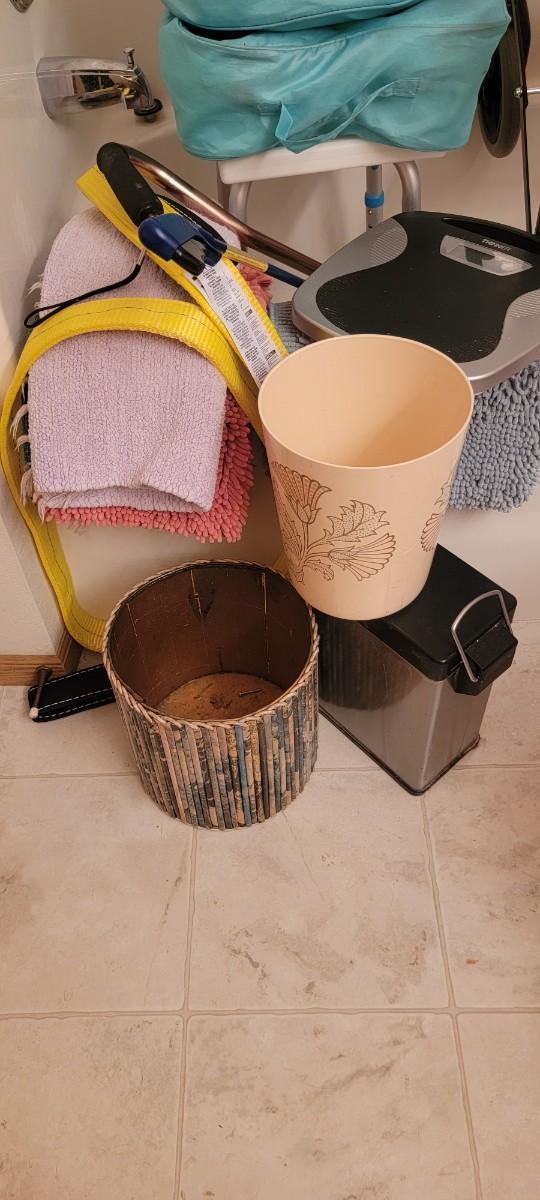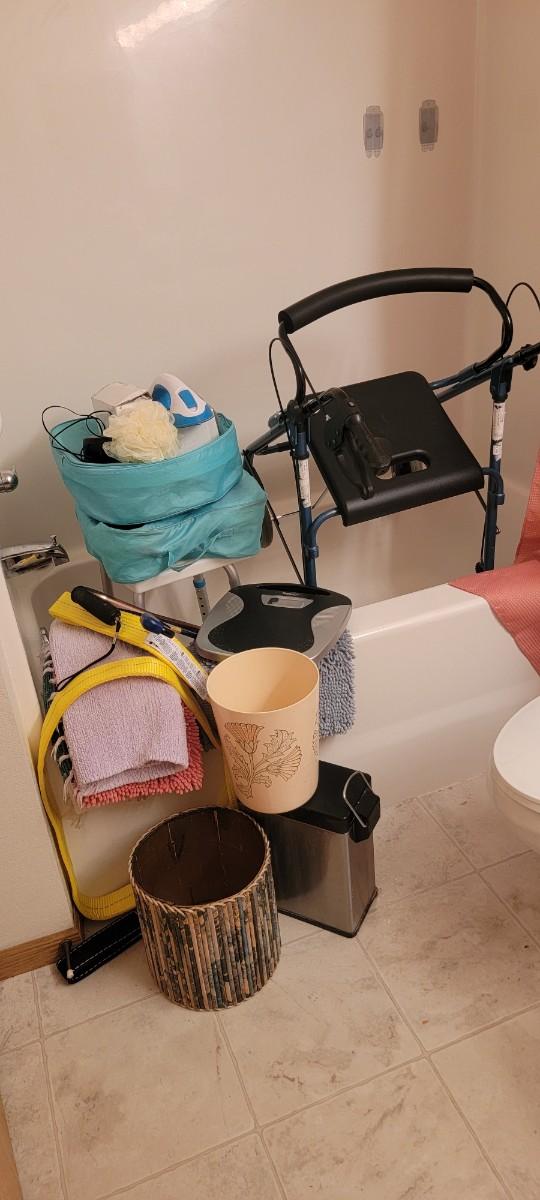 Large lot of miscellaneous health aide items. Includes walker, shower stool, walking aides, waste baskets plus.