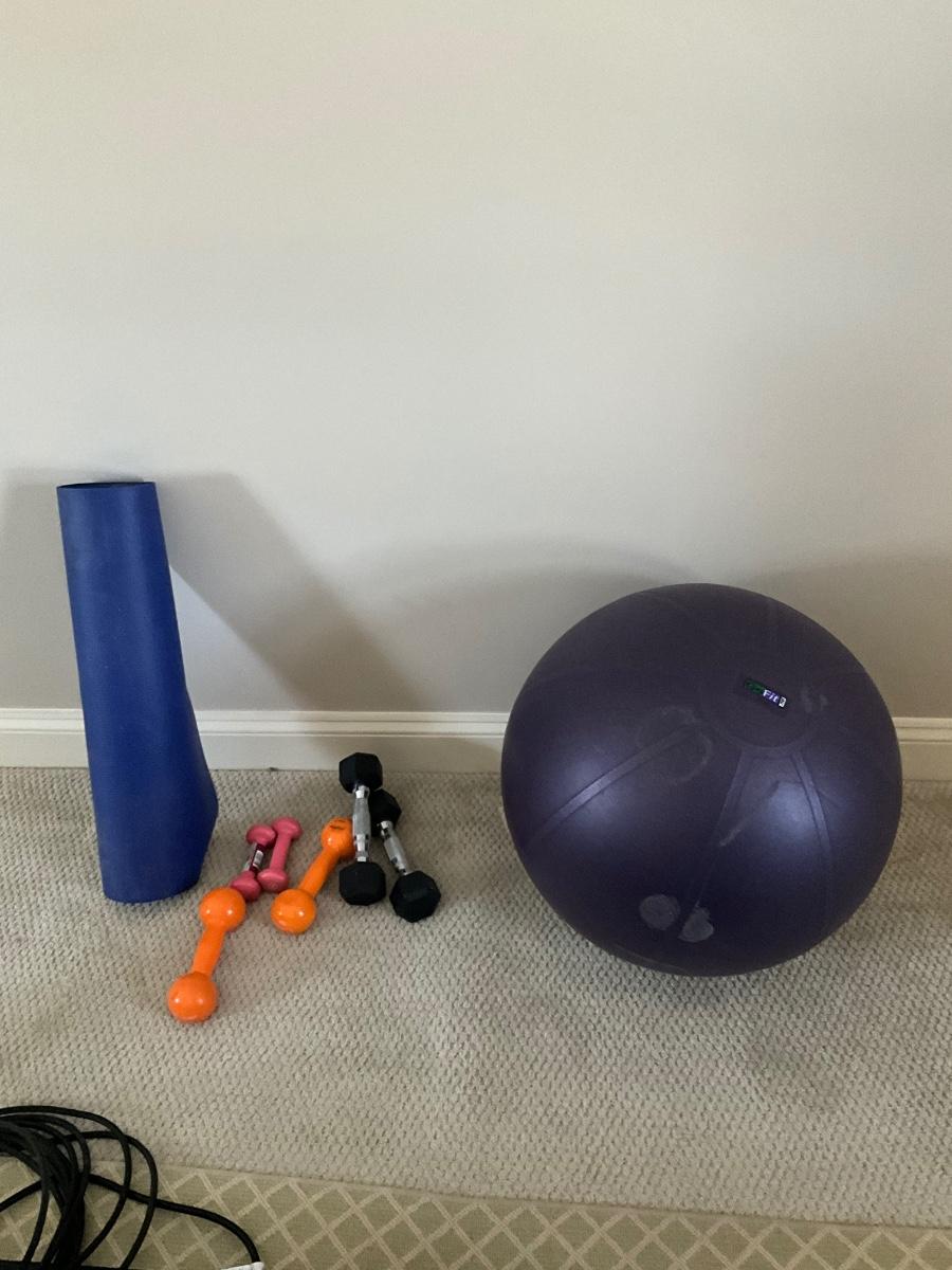 Working condition , comes with 3 pairs of dumbbells, exercise mat, exercise ball, resistance bands
