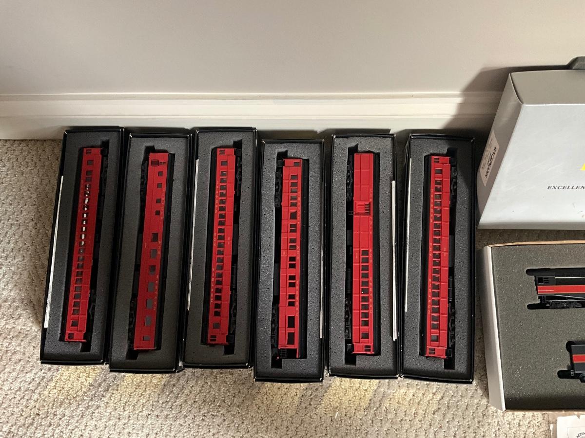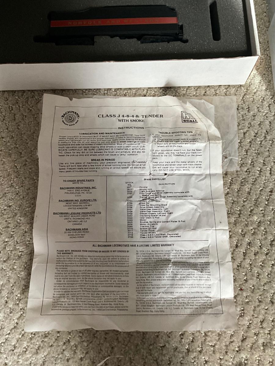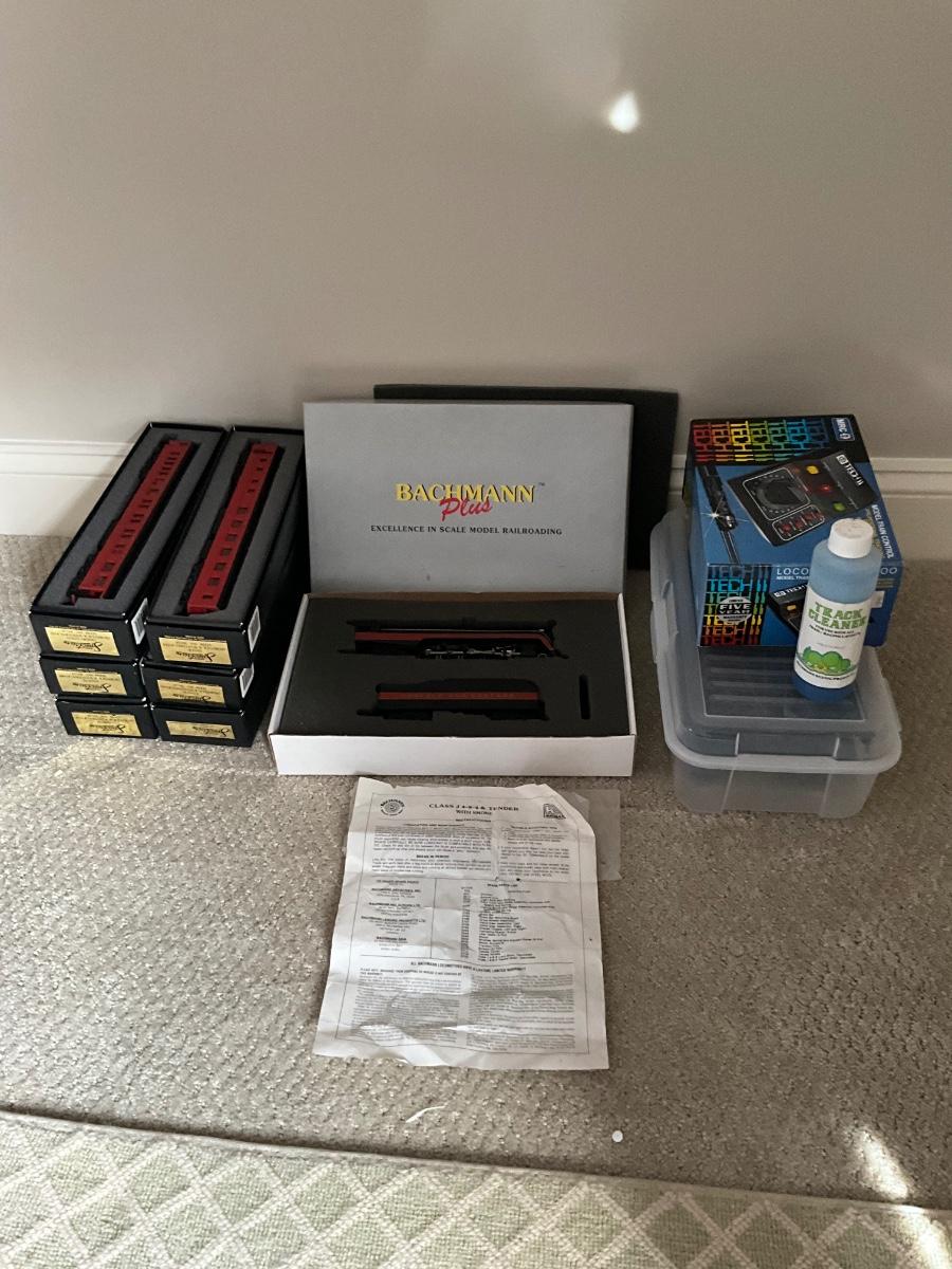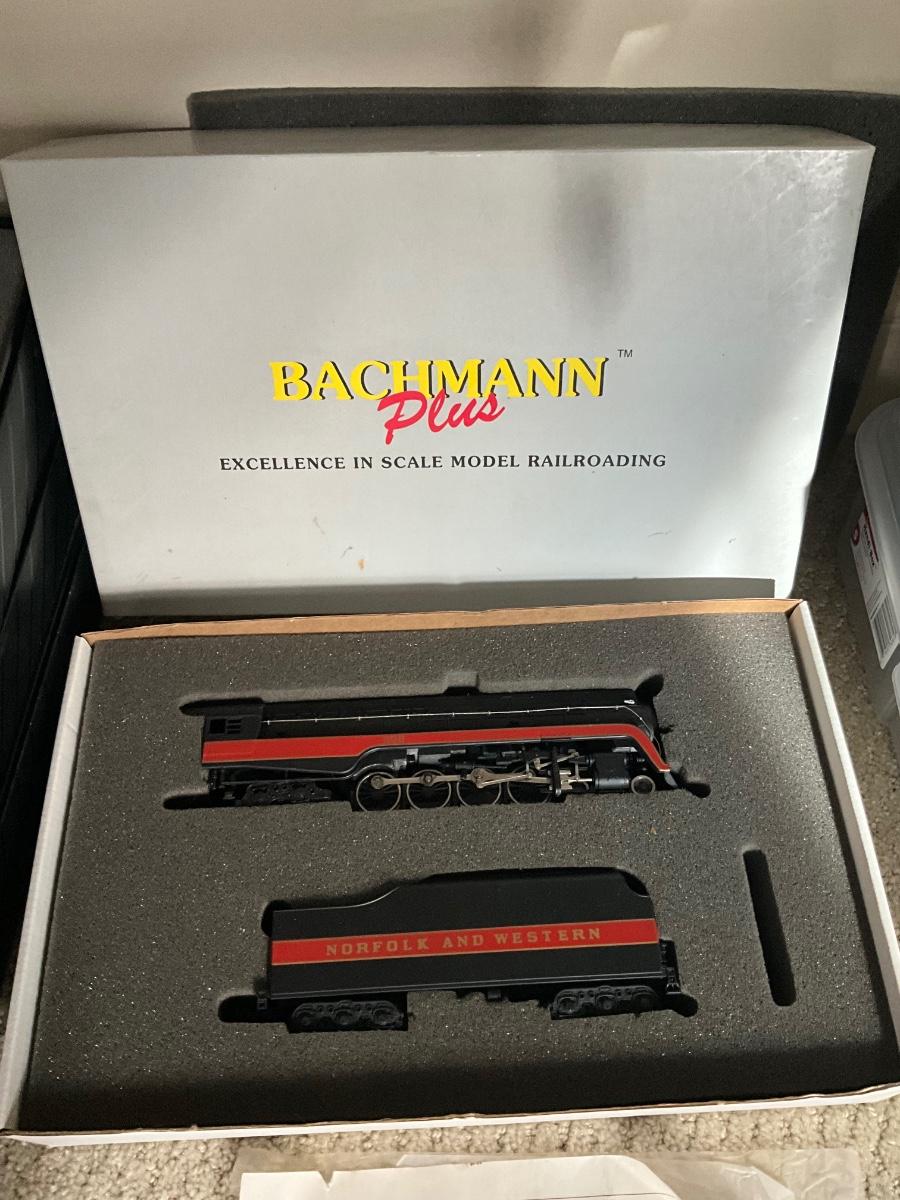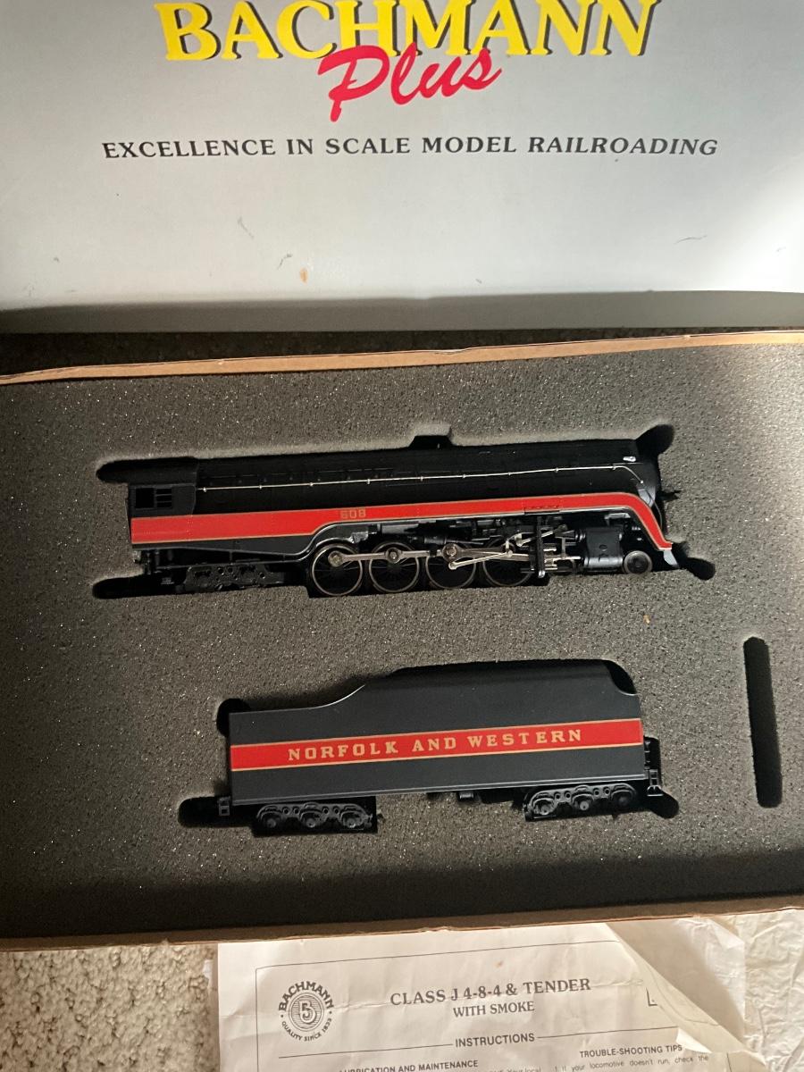 Comes with 6 norfolk & western passenger cars, track cleaner, tech II model train control, Box full of train truck, 8 Class J4848 tender locomotive engine.