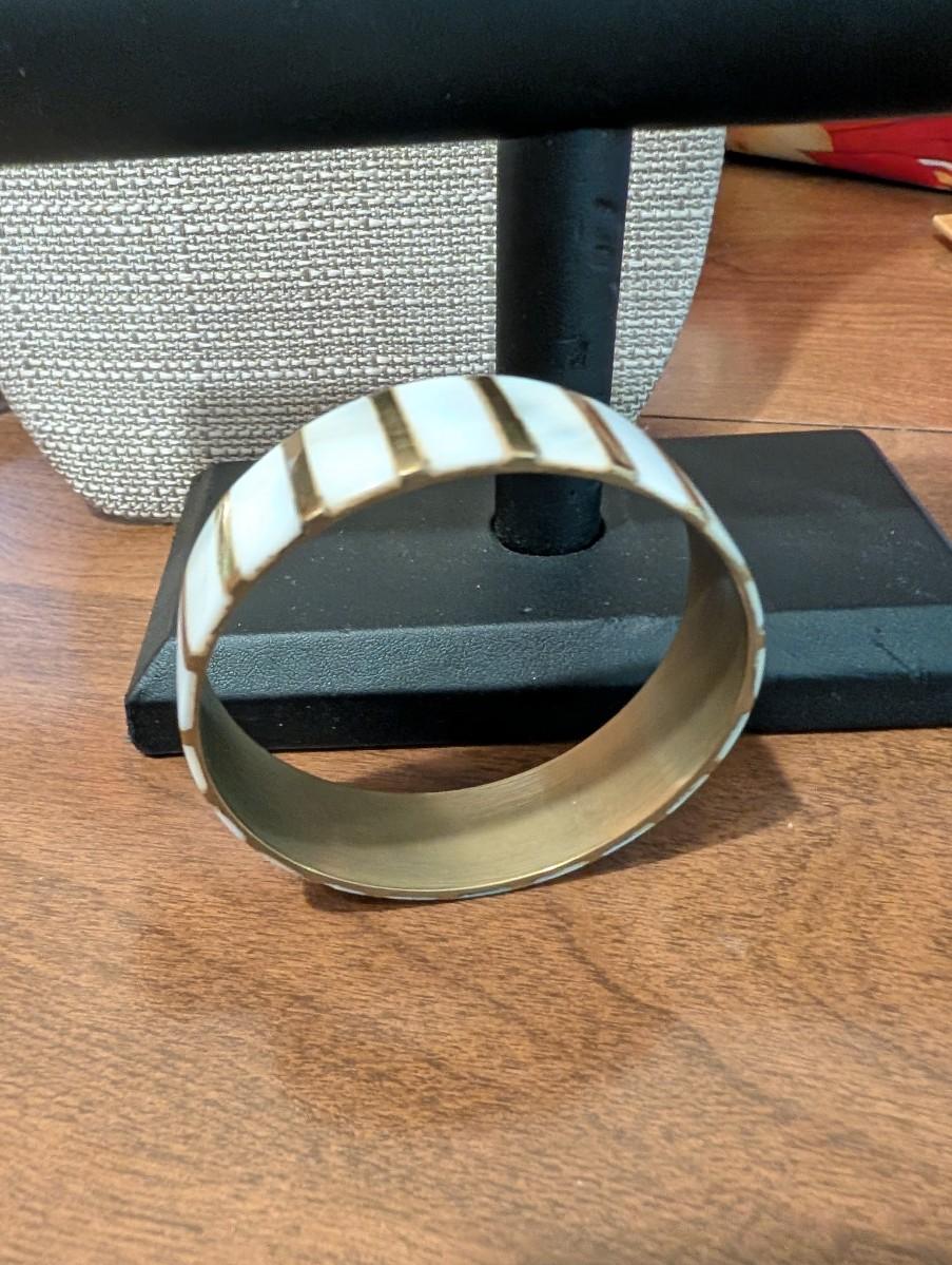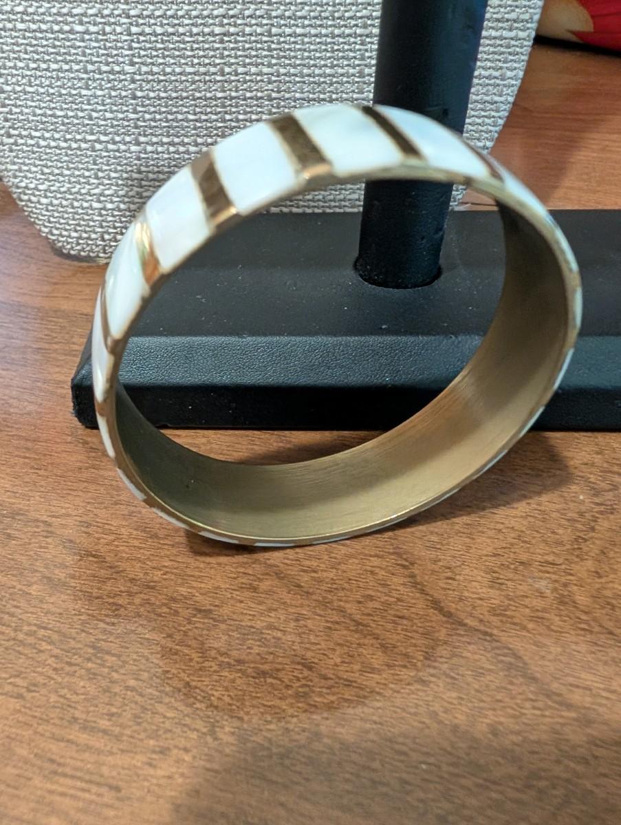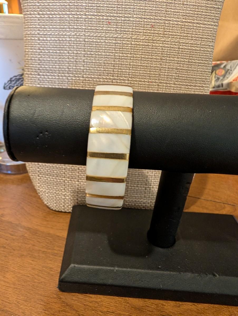 Vintage mother of pearl white shell inlaid panel bangle bracelet