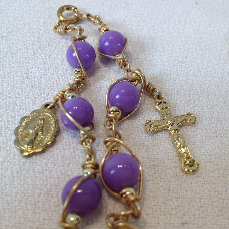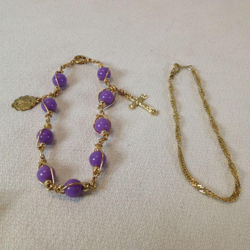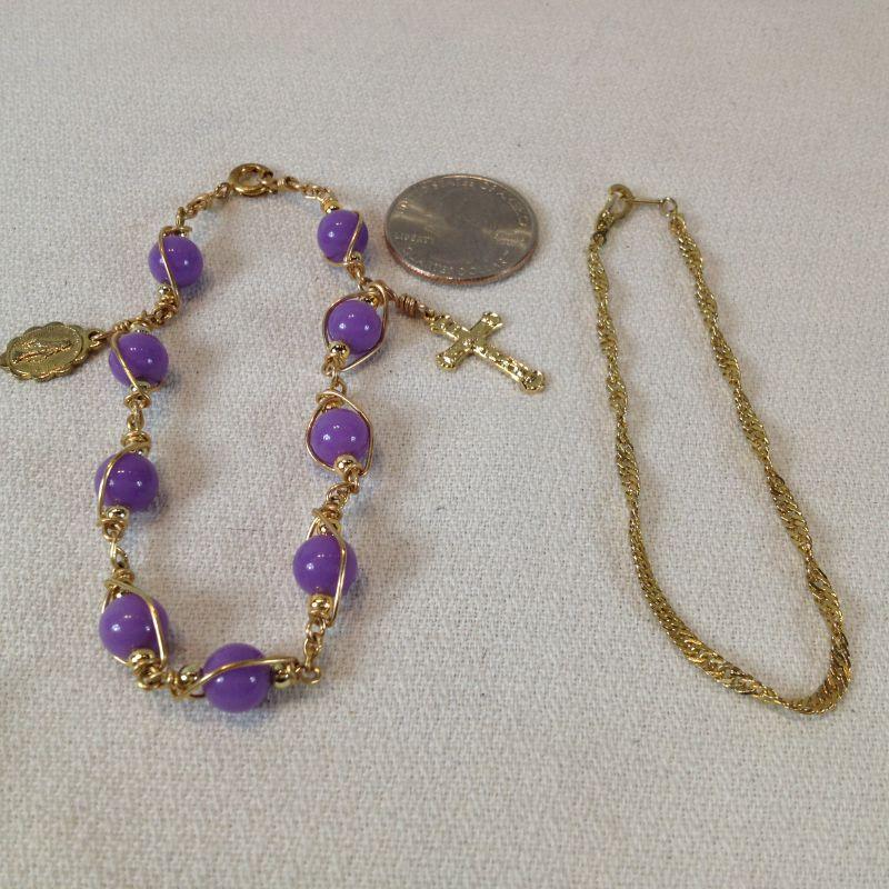 This lot is for a set of Bracelets which include a Purple Stone and Gold-Toned Metal Bracelet adorned with two religious charms. The other gold bracelet is marked 14K gold-filled. Both appear unworn and ready for your wrist.