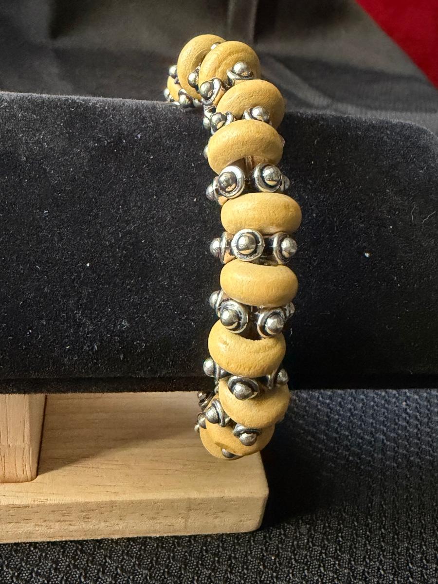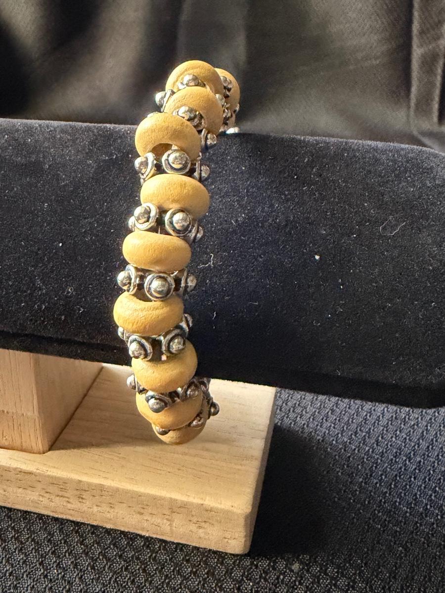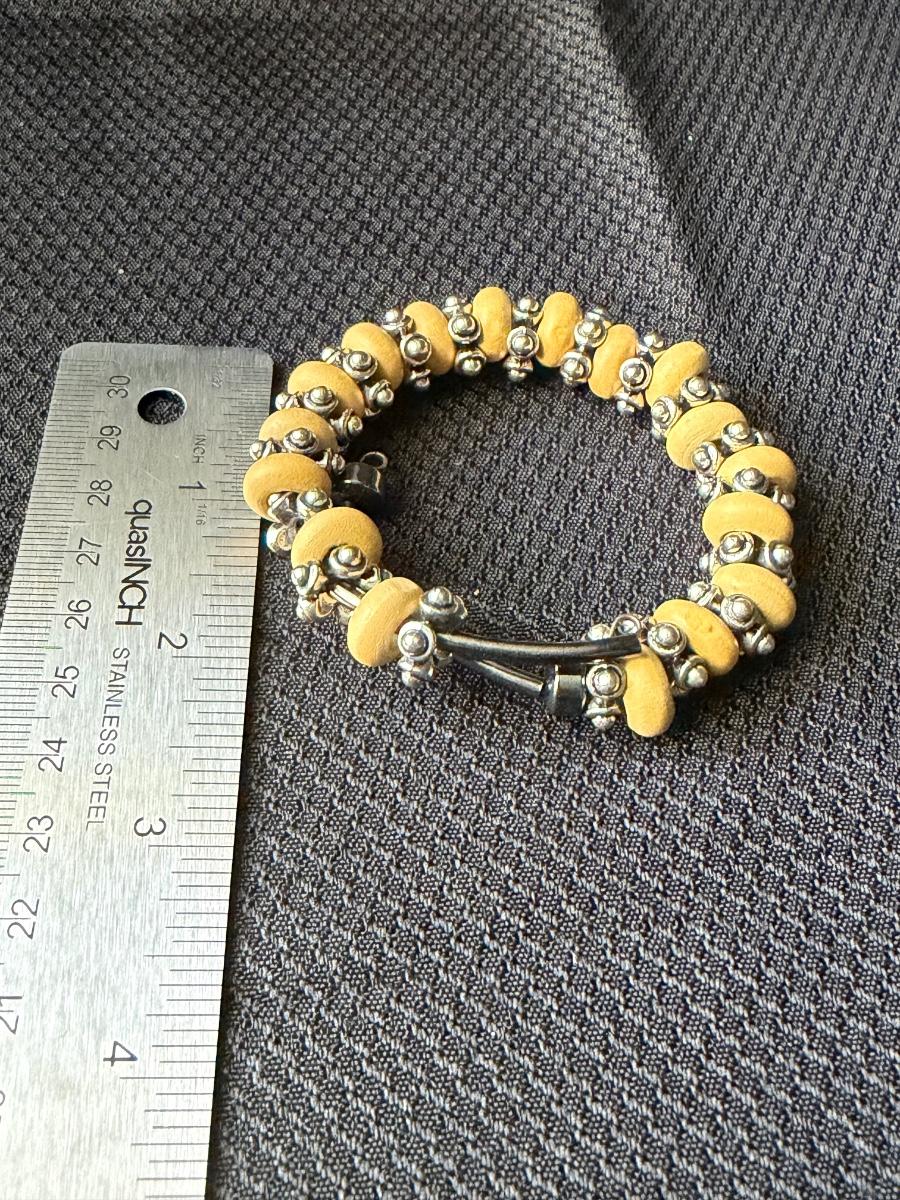 bracelet featuring yellow wooden beads and silvertone accents on a wire wrap.