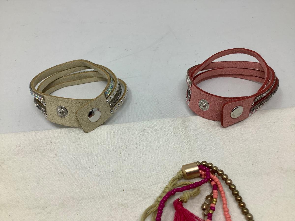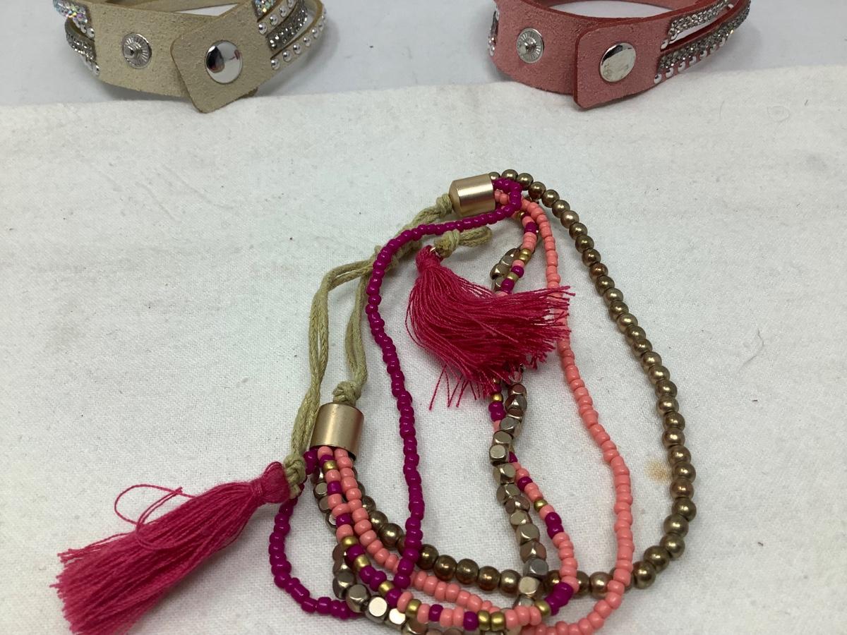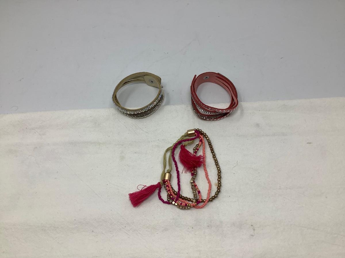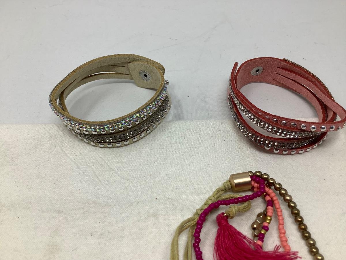 You get two leather with snaps and rhinestones and another cloth and beads.