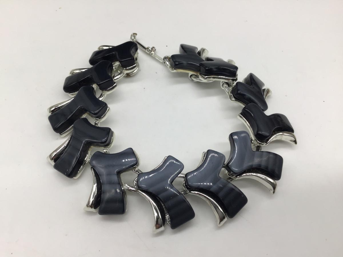 bracelet-Frosty Charcoal plastic thermoset chevron check-silver tone metal