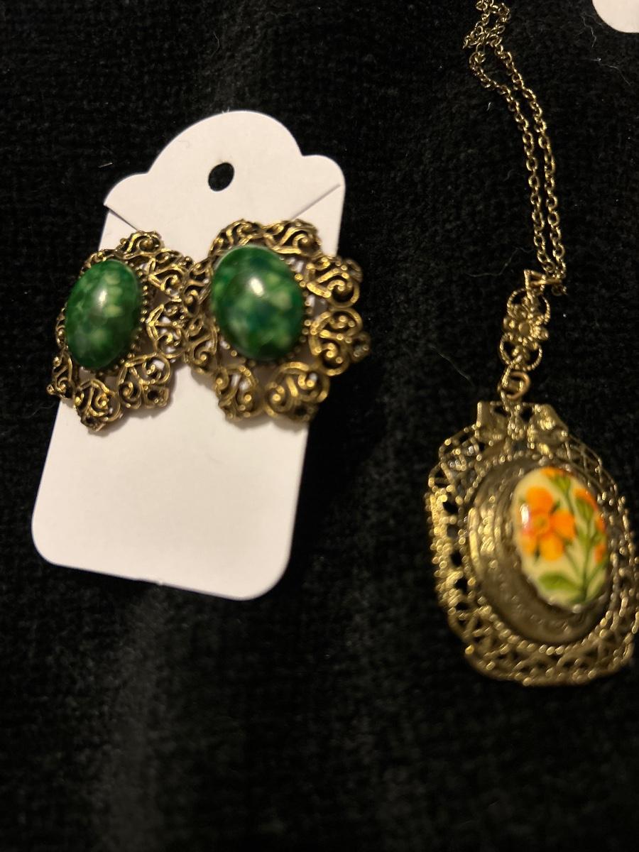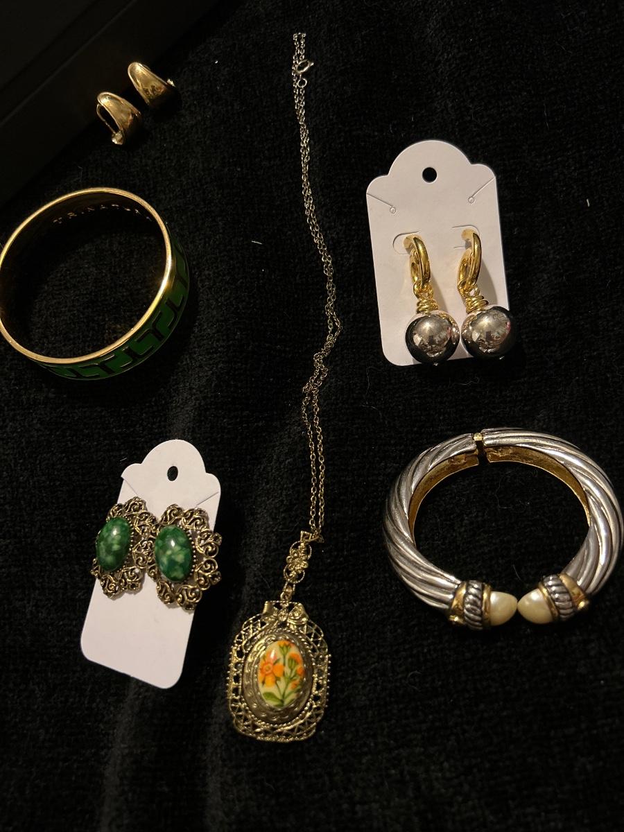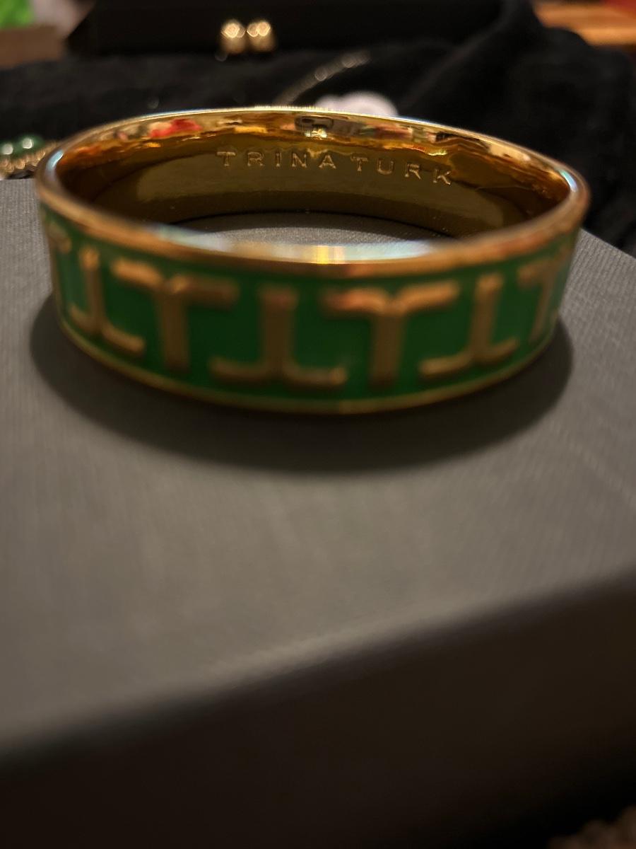 The green bangle is Trina Turk, the green earrings are clip ons. Other 2 are pierced.