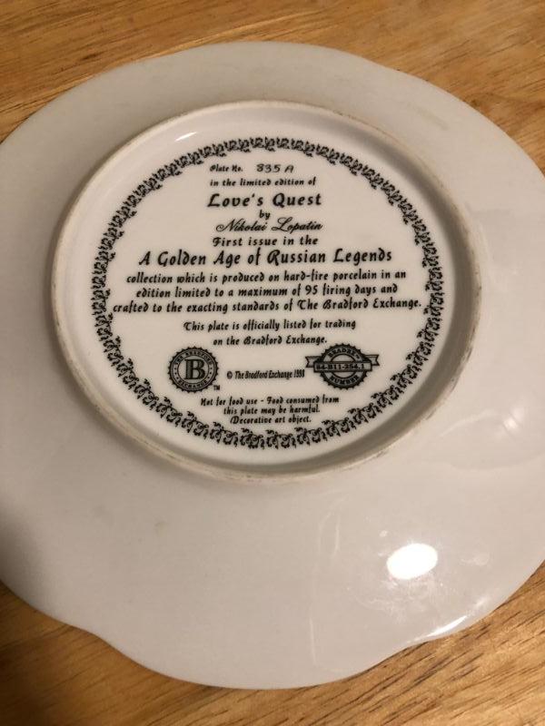 Bradford Exchange Plate - Love's Quest by Nikolai Lopatin, 8". **Please read Terms and Conditions before placing a bid. Pick up is Thursday, August 15, 2019 from 4pm to 7pm or Sunday, August 18 from 11am-2pm in Mullica Hill. All sales are final. All sales are as is, where is. Please review all photos. Any props included in photos are not included in listing. All measurements are approximate.