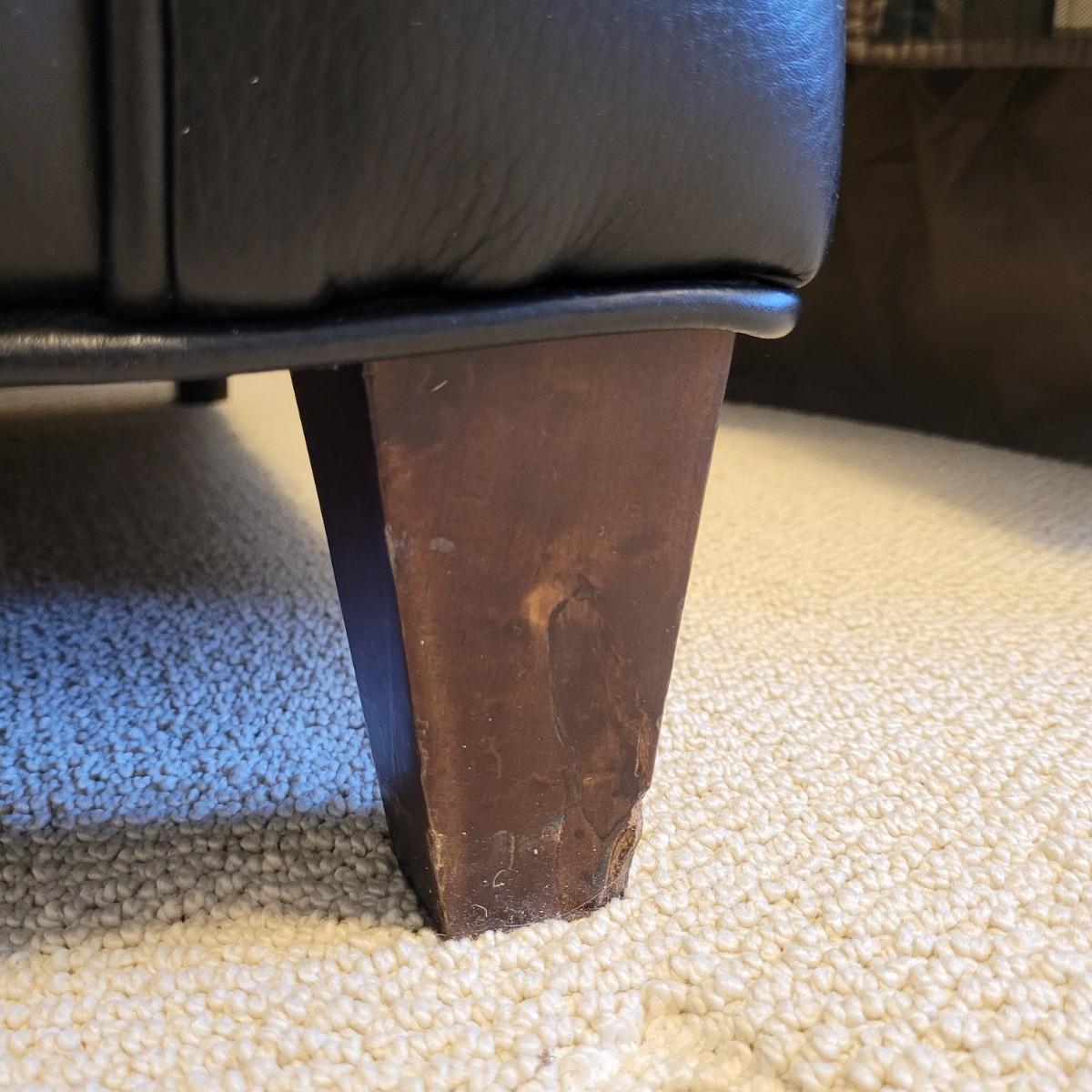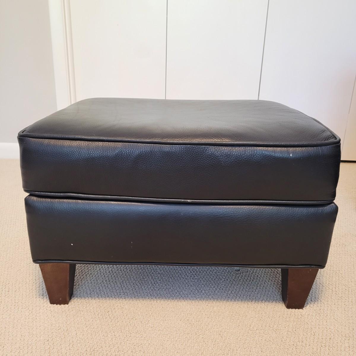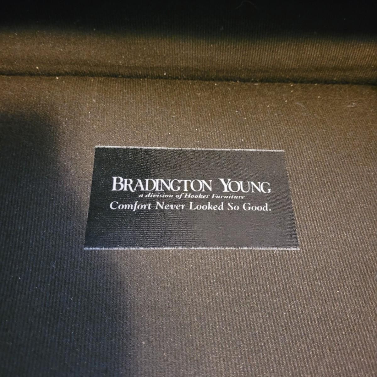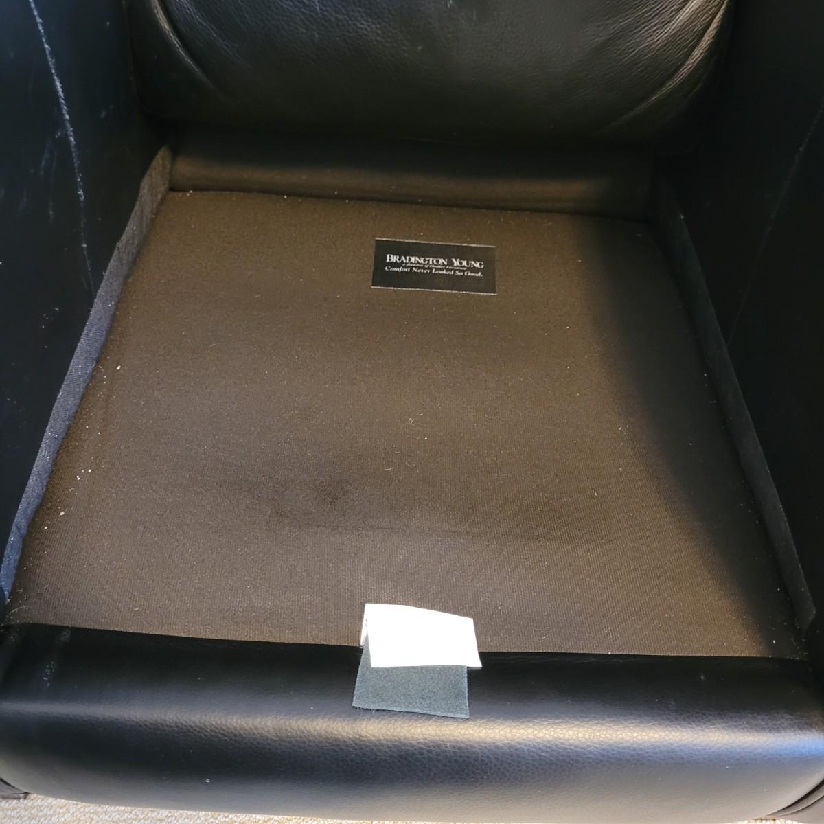 This Bradington Young armchair and ottoman is made of faux leather, with removable seat and back cushions and wooden legs. The chair is black. Some scuff marks throughout (see photos). Chair measures approximately 32" x 33" x 33" with seat height 17", ottoman 25" x 19" x 16." Local pickup only. Winning bidder must bring assistance to help move and load this item due to its weight and/or size and will need to be moved down the stairs to exit the home.