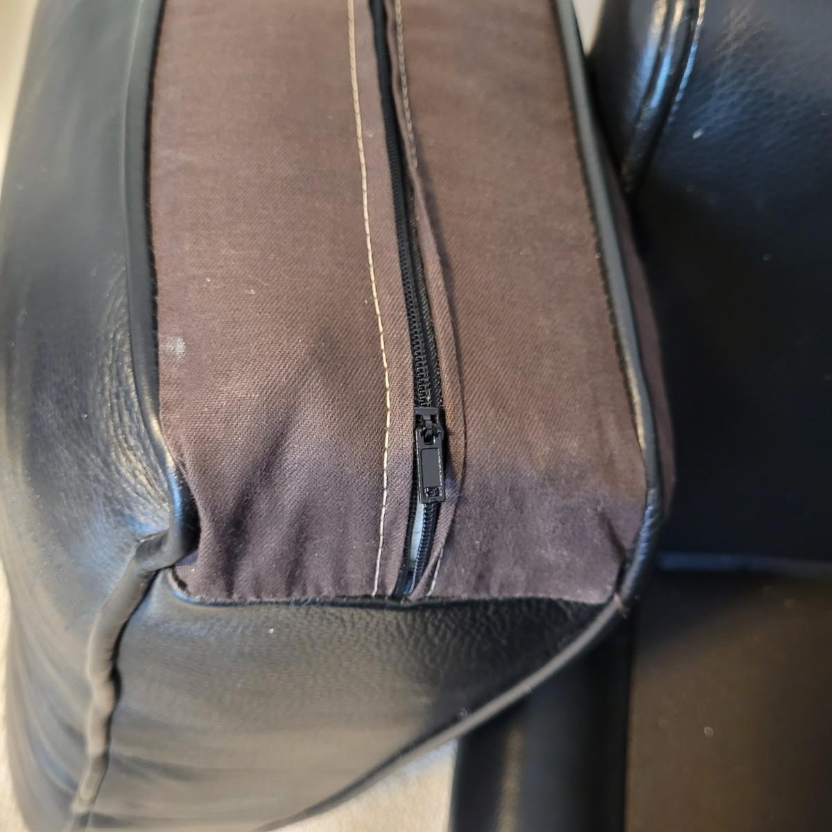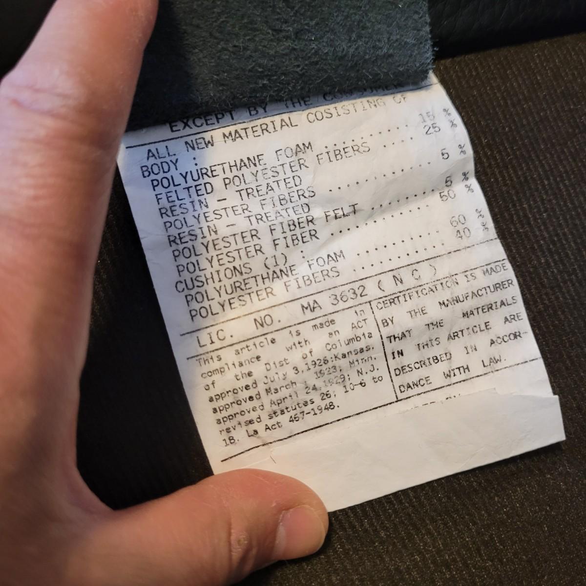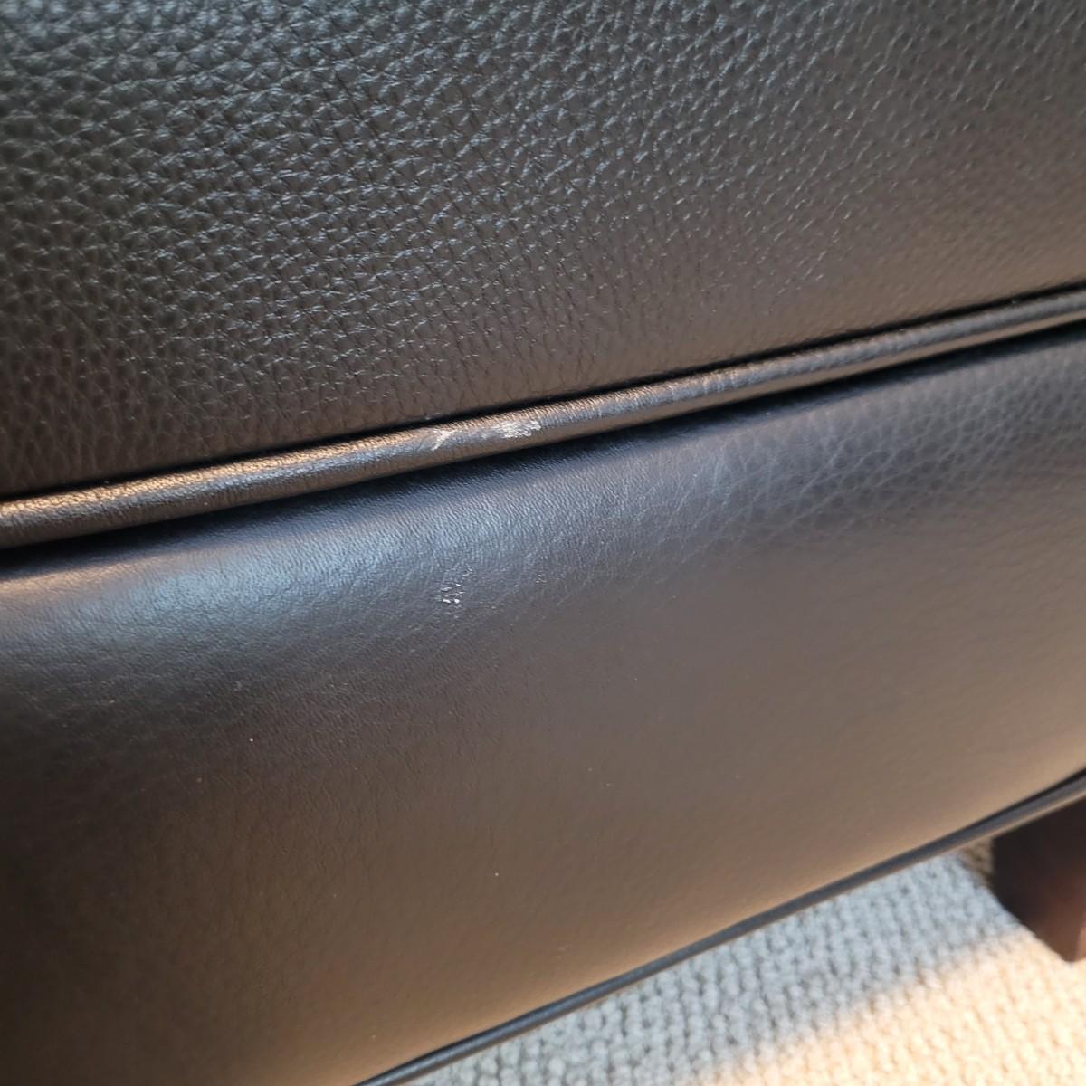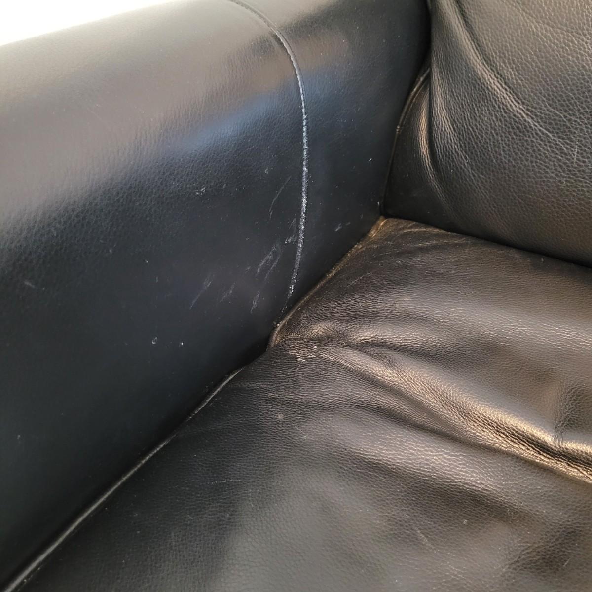 This Bradington Young armchair and ottoman is made of faux leather, with removable seat and back cushions and wooden legs. The chair is black. Some scuff marks throughout (see photos). Chair measures approximately 32" x 33" x 33" with seat height 17", ottoman 25" x 19" x 16." Local pickup only. Winning bidder must bring assistance to help move and load this item due to its weight and/or size and will need to be moved down the stairs to exit the home.
