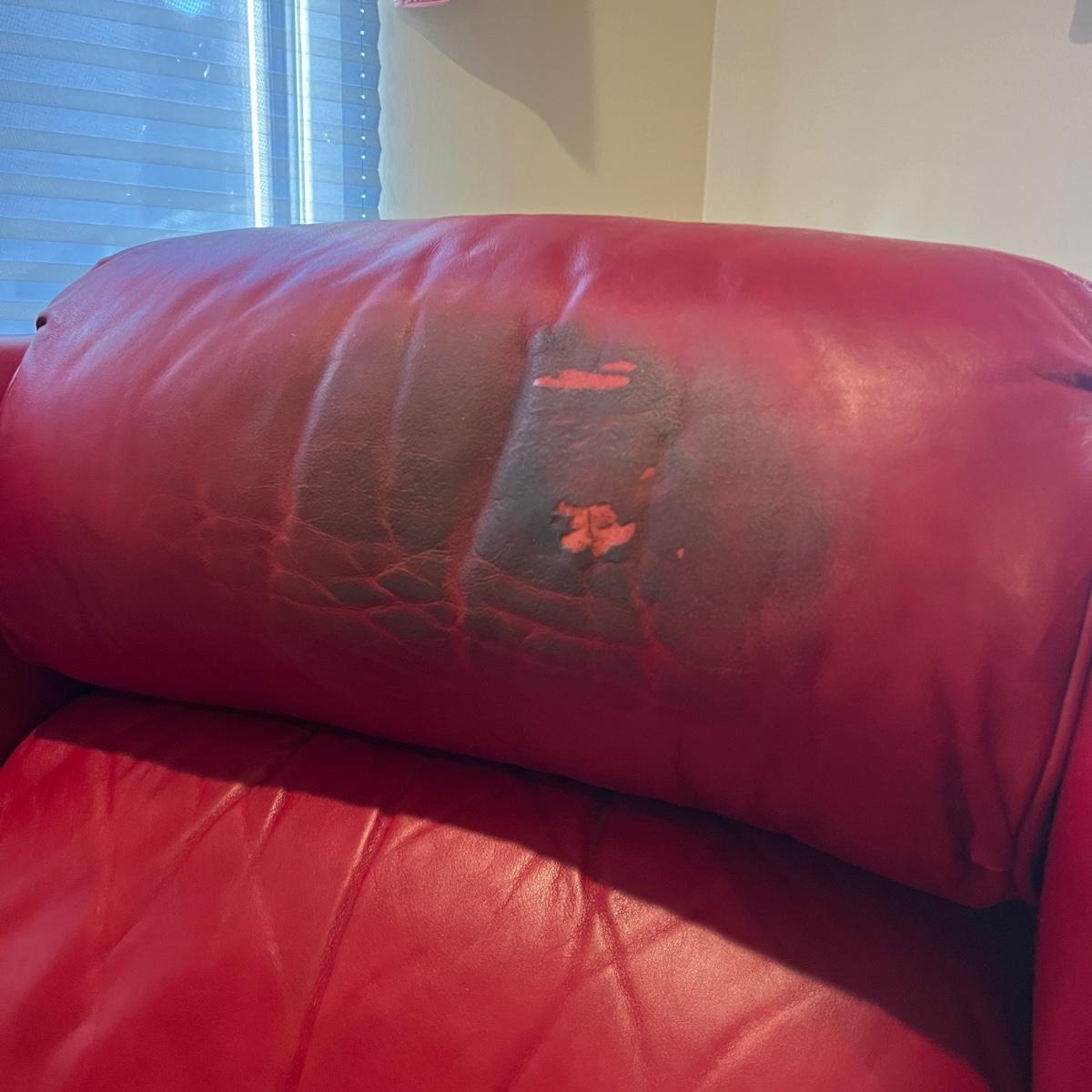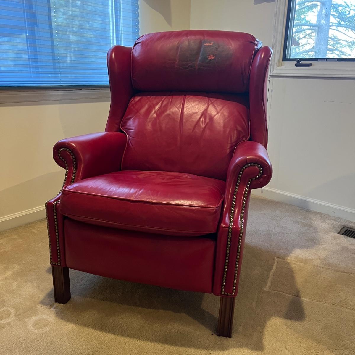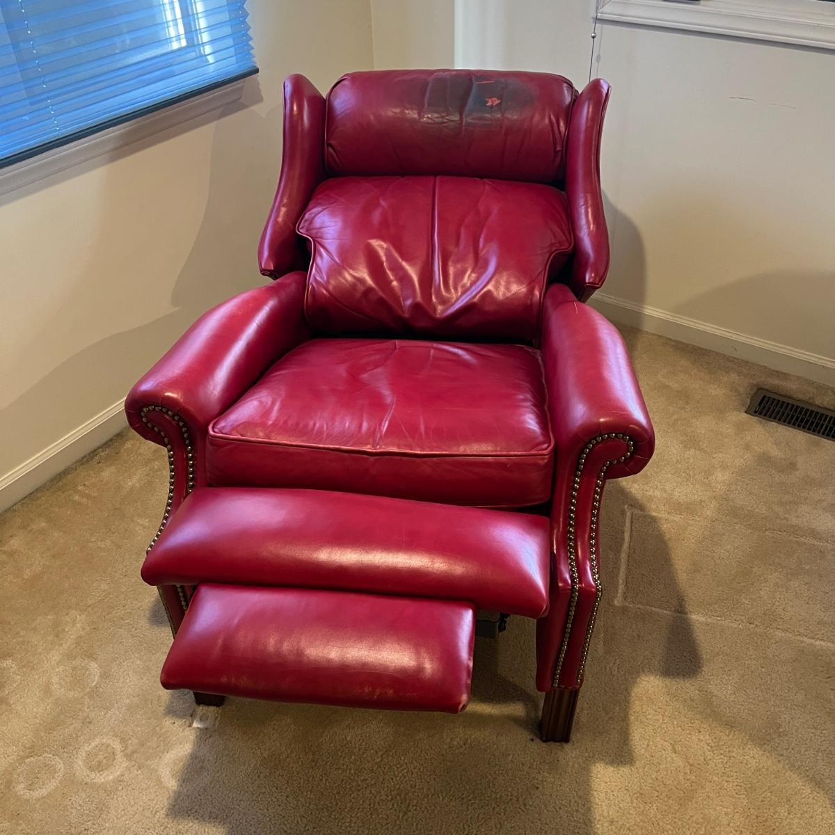 Lot includes a Bradington Young red leather recliner with brass tack on the front. Chair measures 34” x 36” x 41” with a 21” seat height. Chair has notable wear on the head rest, see pictures. It is possibly cleanable with a bit of effort.