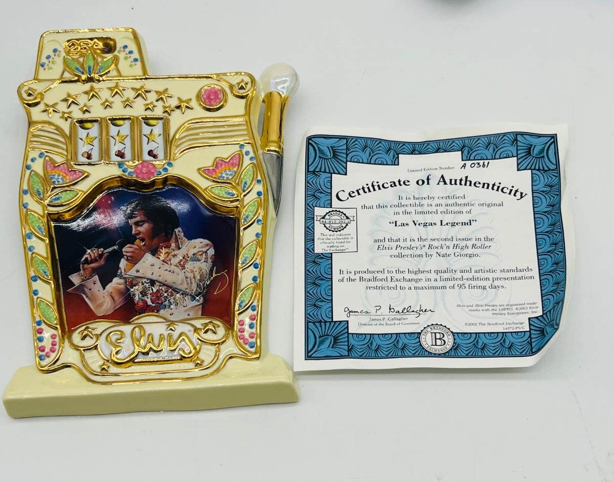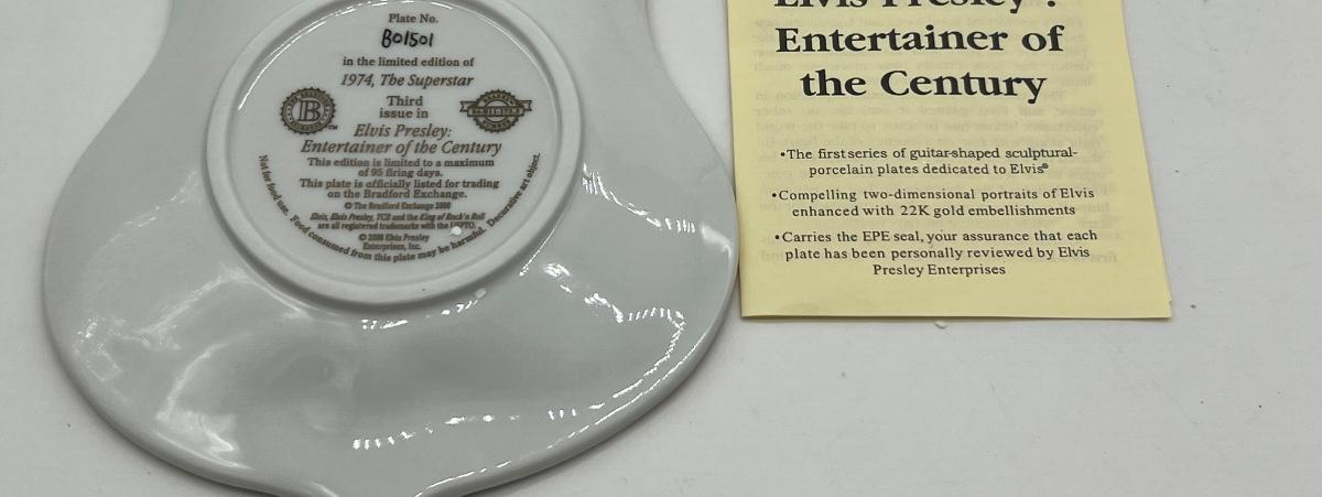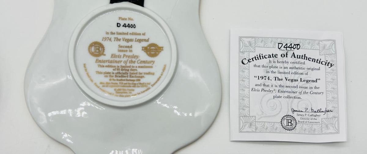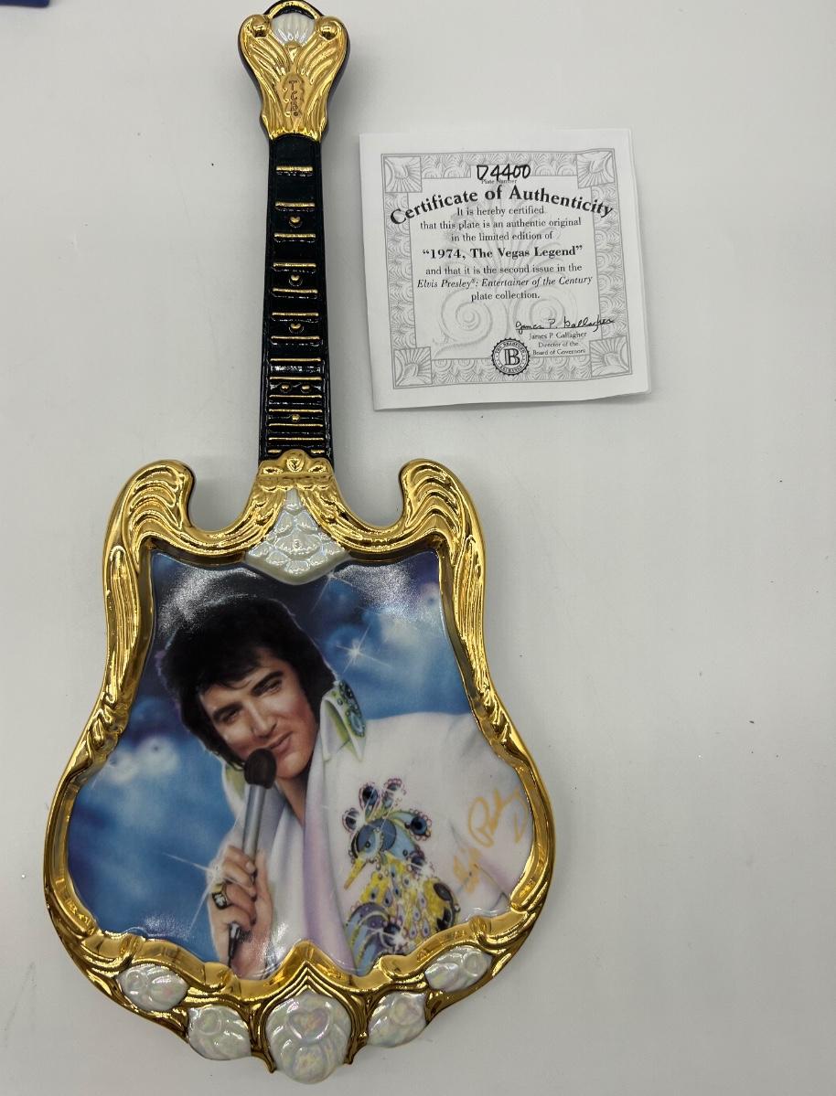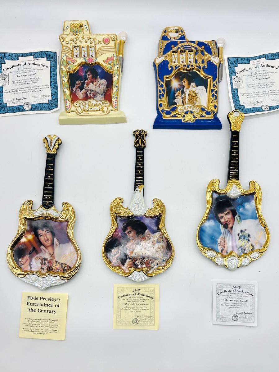 6 total pieces of Bradford exchange, Elvis wall hangers 5/6 have their certificate of authenticity. Three guitars and two slot machines. Guitars measure approximately 12 inches tall. Slot machine measure approximately 8 inches tall