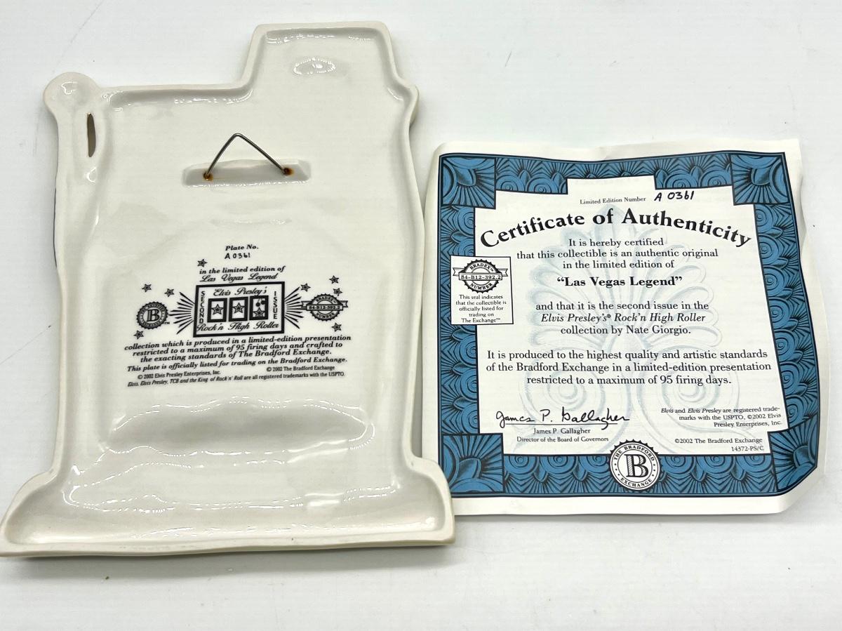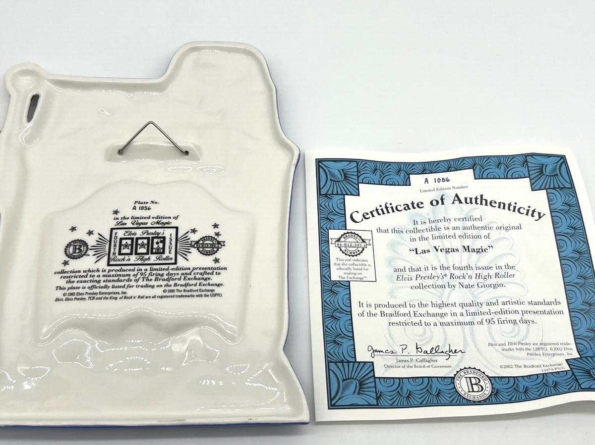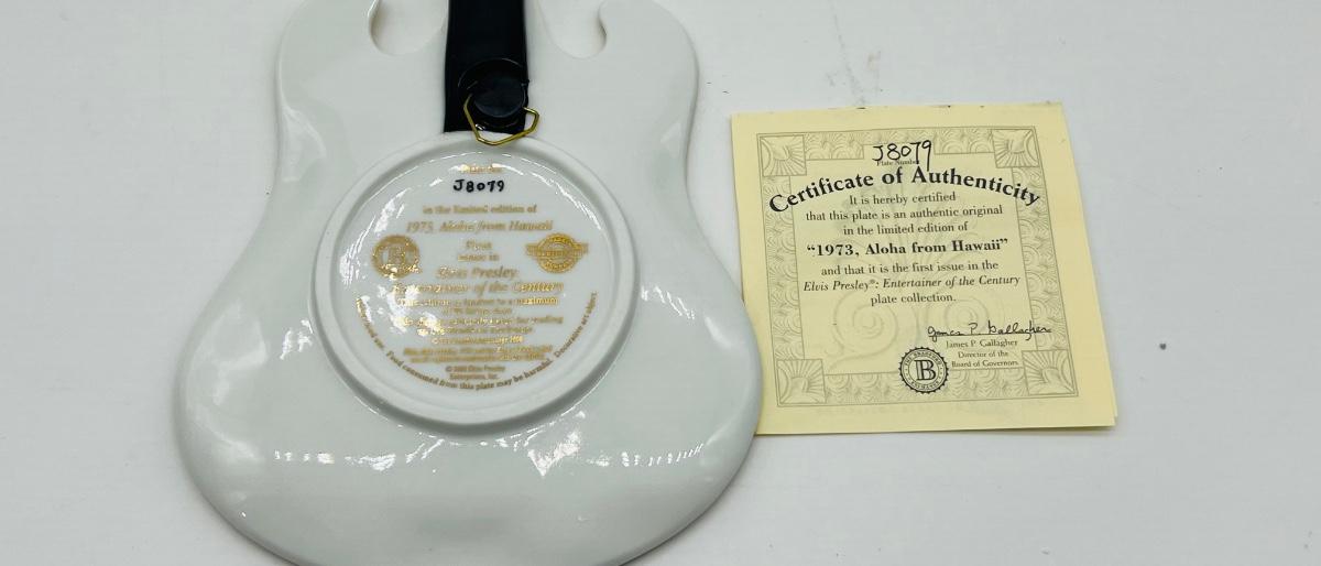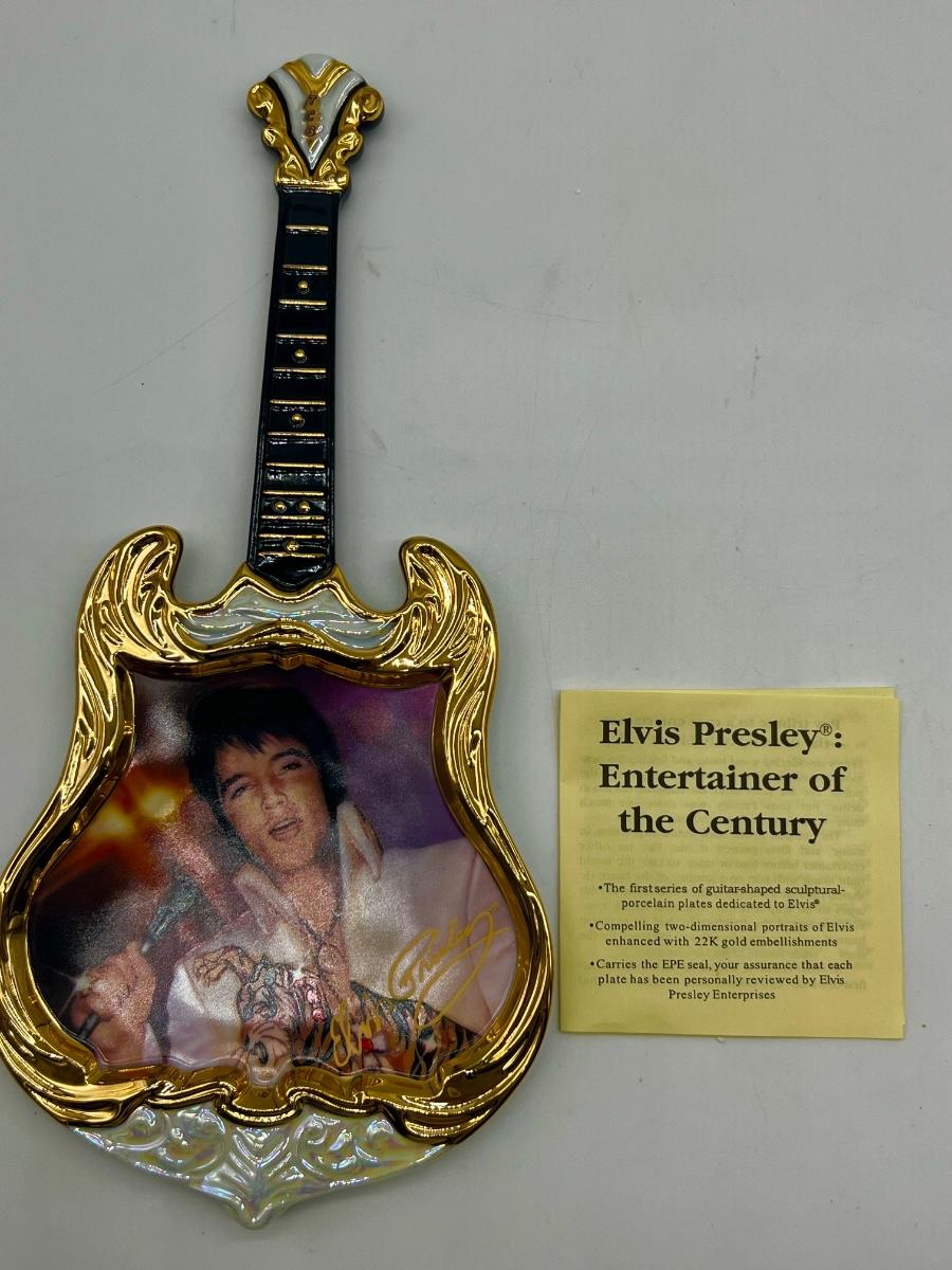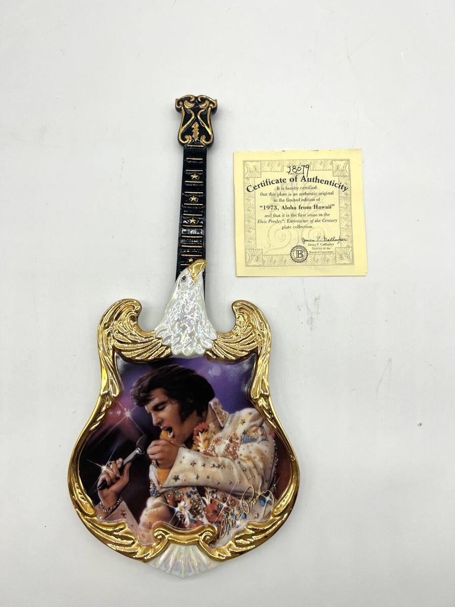 6 total pieces of Bradford exchange, Elvis wall hangers 5/6 have their certificate of authenticity. Three guitars and two slot machines. Guitars measure approximately 12 inches tall. Slot machine measure approximately 8 inches tall