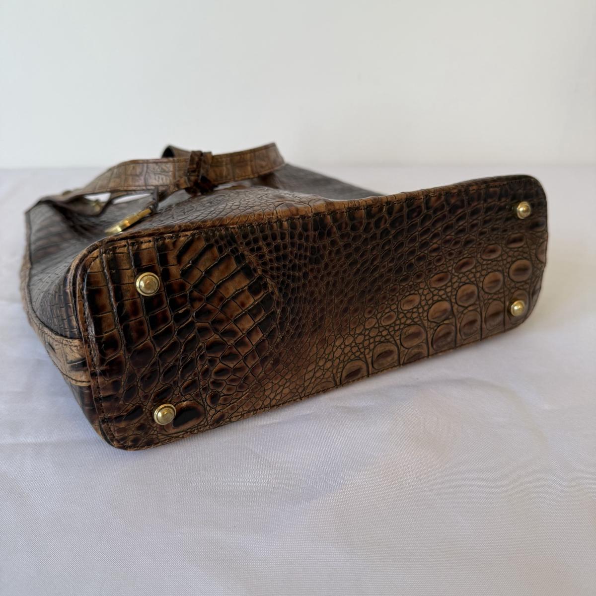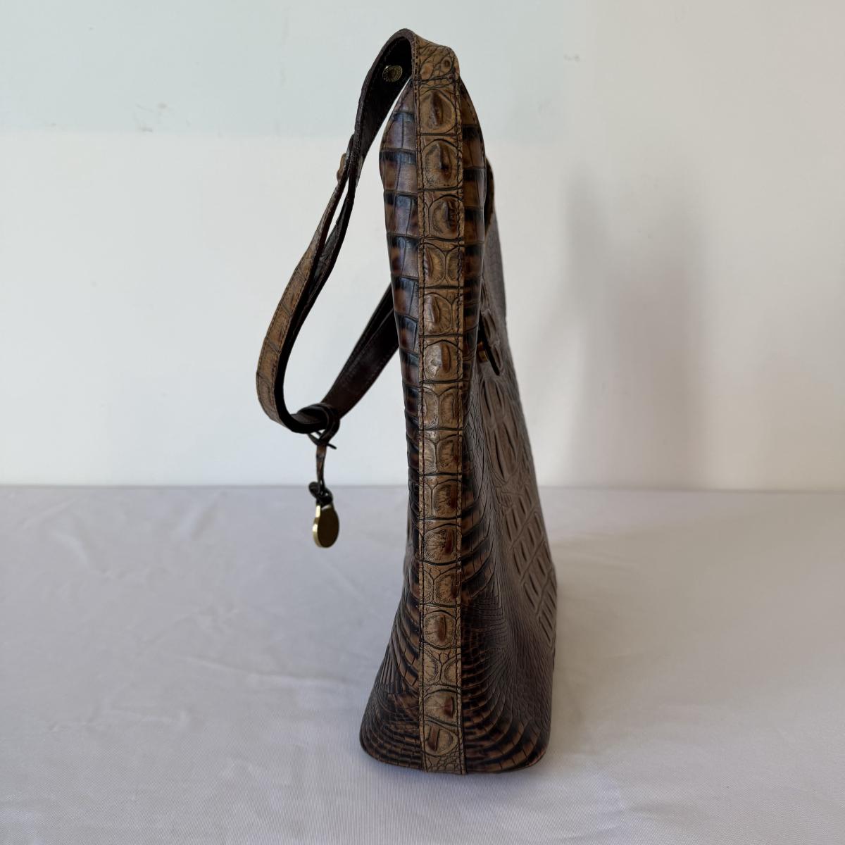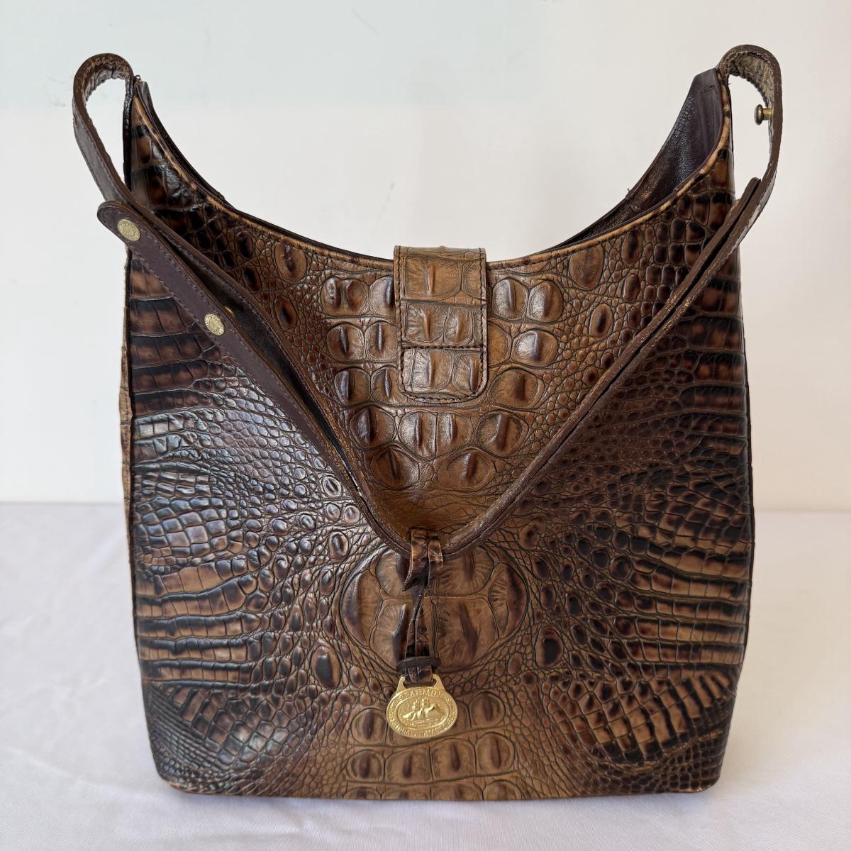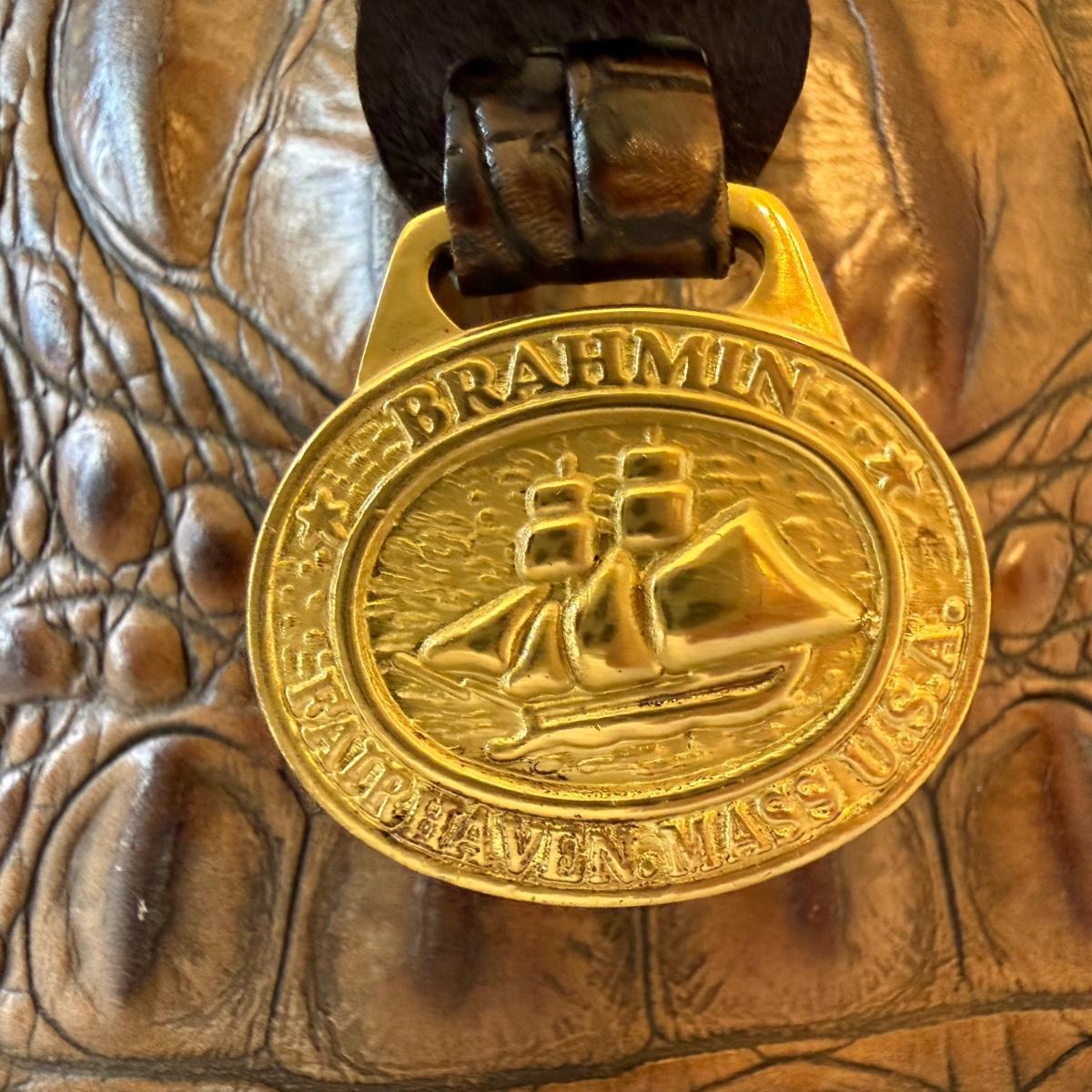 This bag appears to be Brahmin’s toasted almond square leather adjustable shoulder handbag, made of leather with the appearance of crocodile skin. Bag shows minimal wear. It measures approximately 11” x 3.5” x 12”H (to the top of the bag, not including the strap).