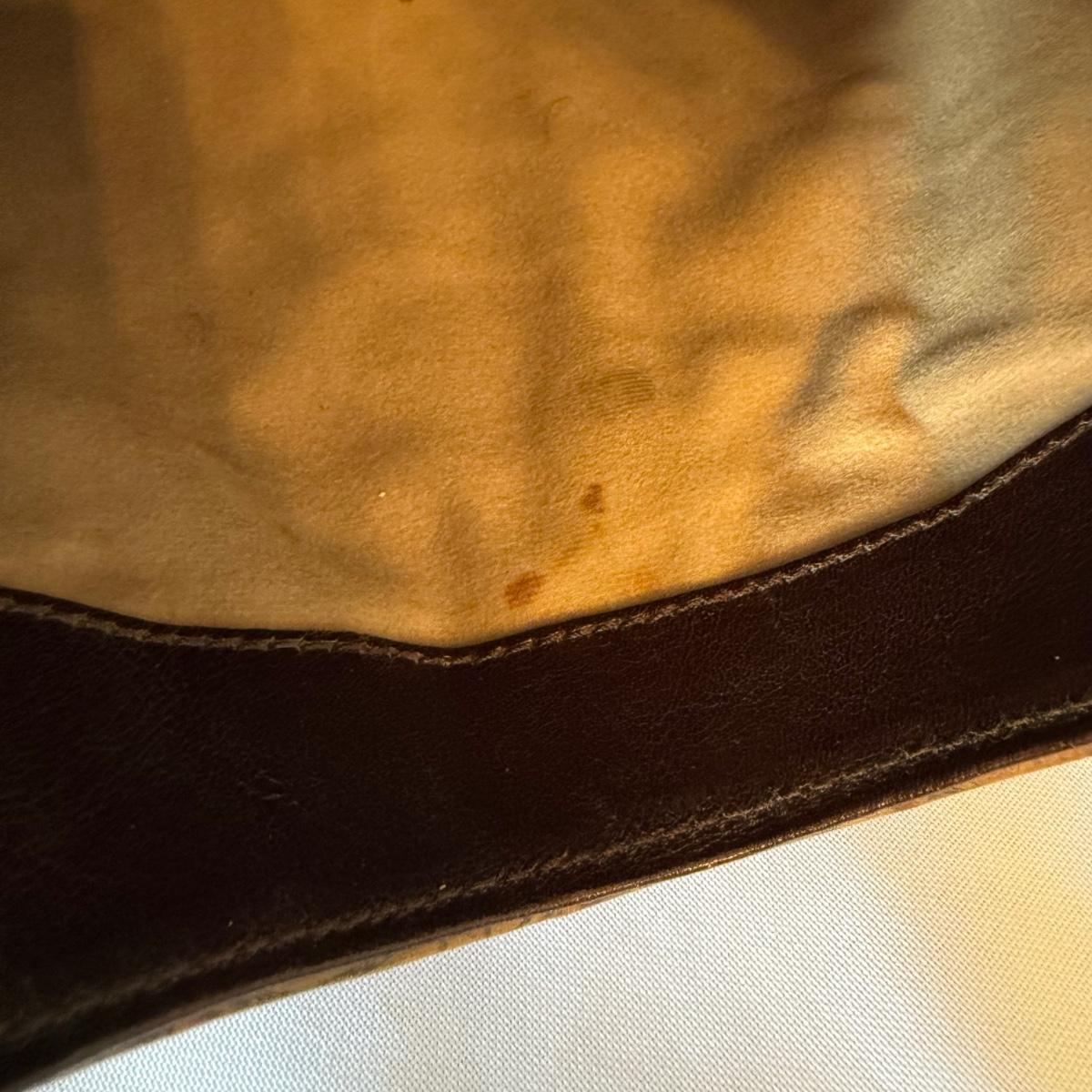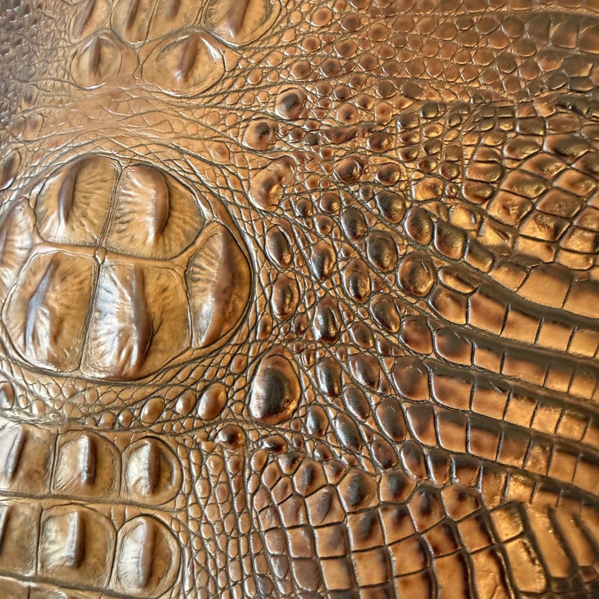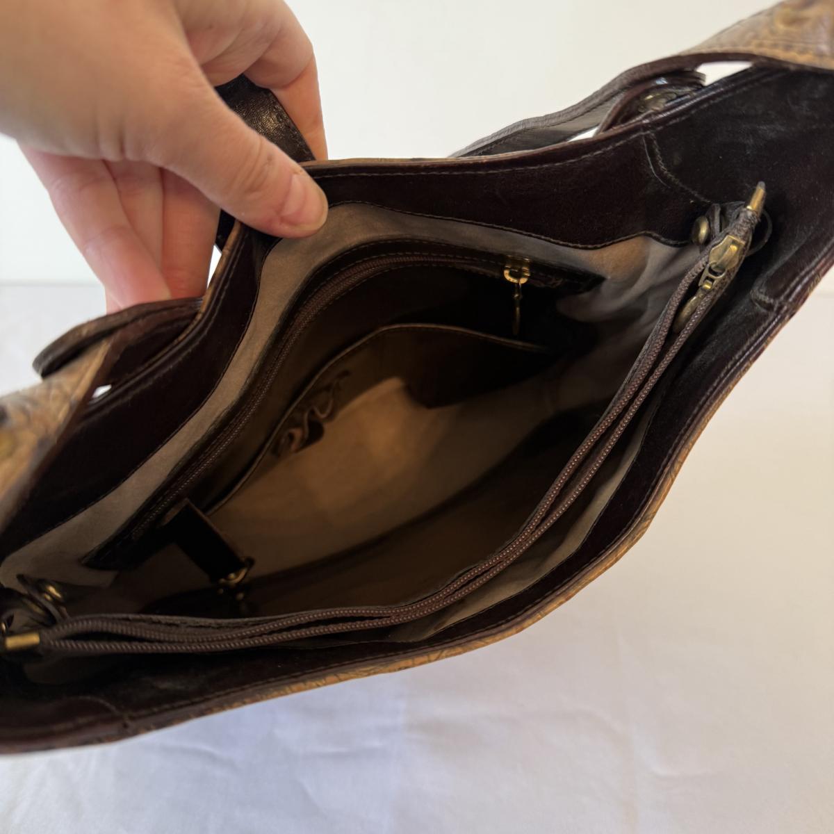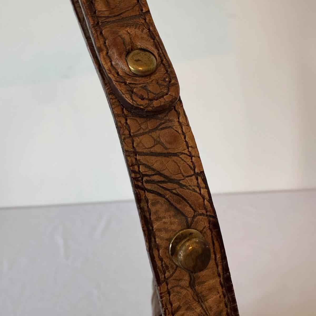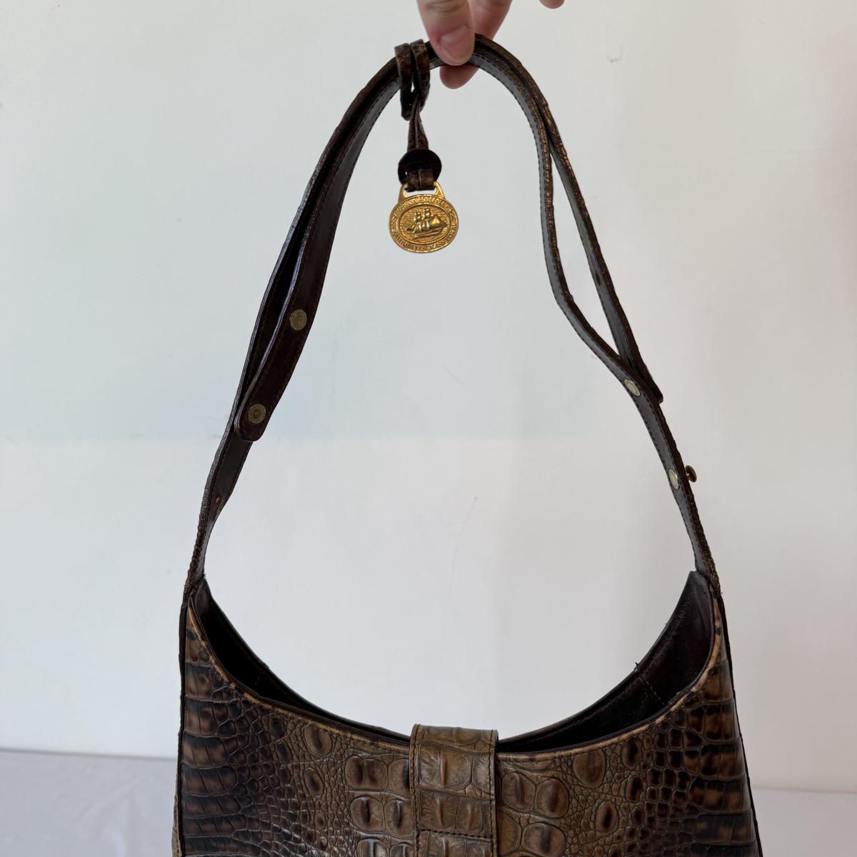 This bag appears to be Brahmin’s toasted almond square leather adjustable shoulder handbag, made of leather with the appearance of crocodile skin. Bag shows minimal wear. It measures approximately 11” x 3.5” x 12”H (to the top of the bag, not including the strap).