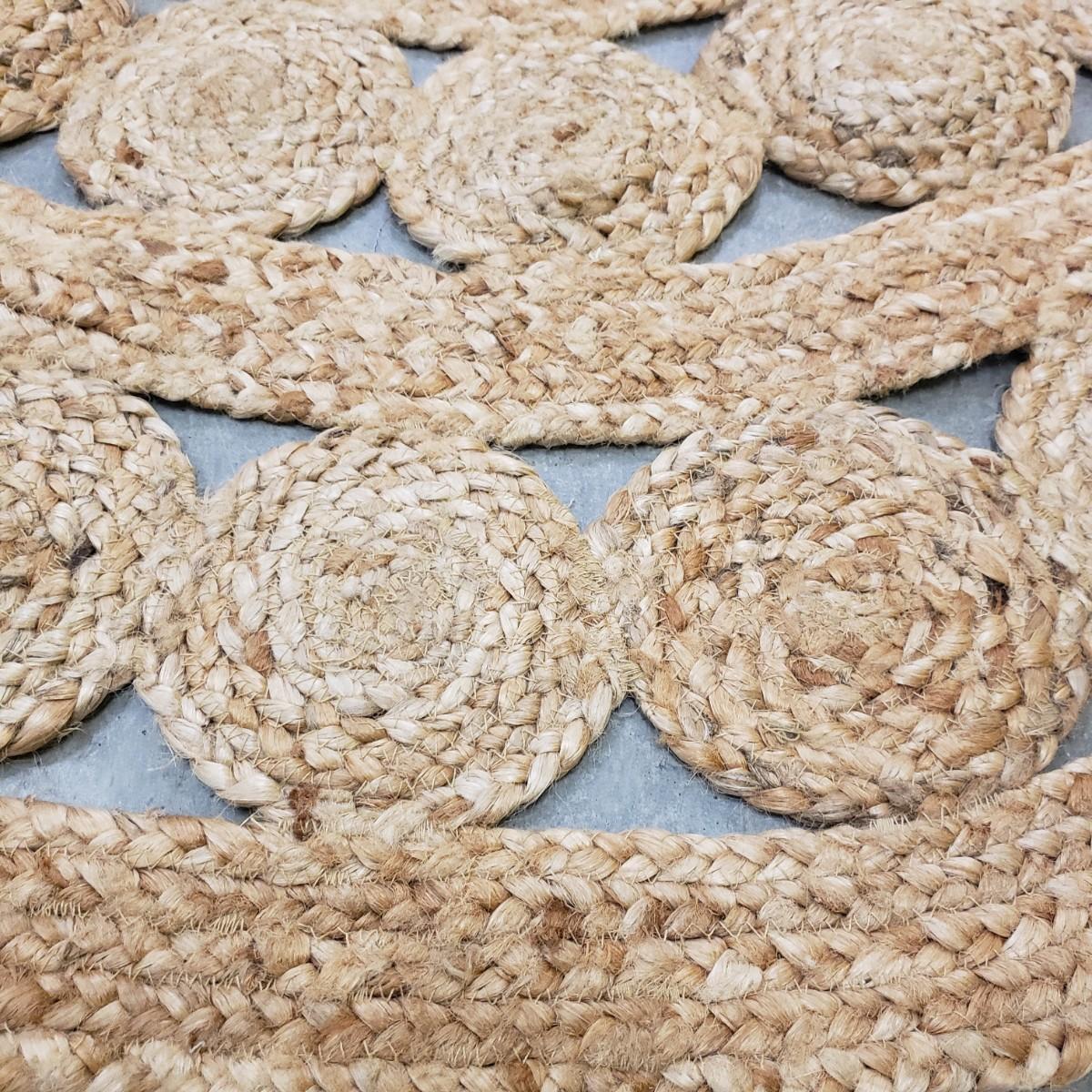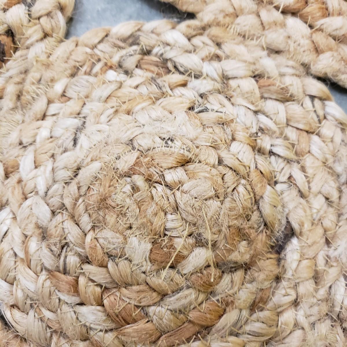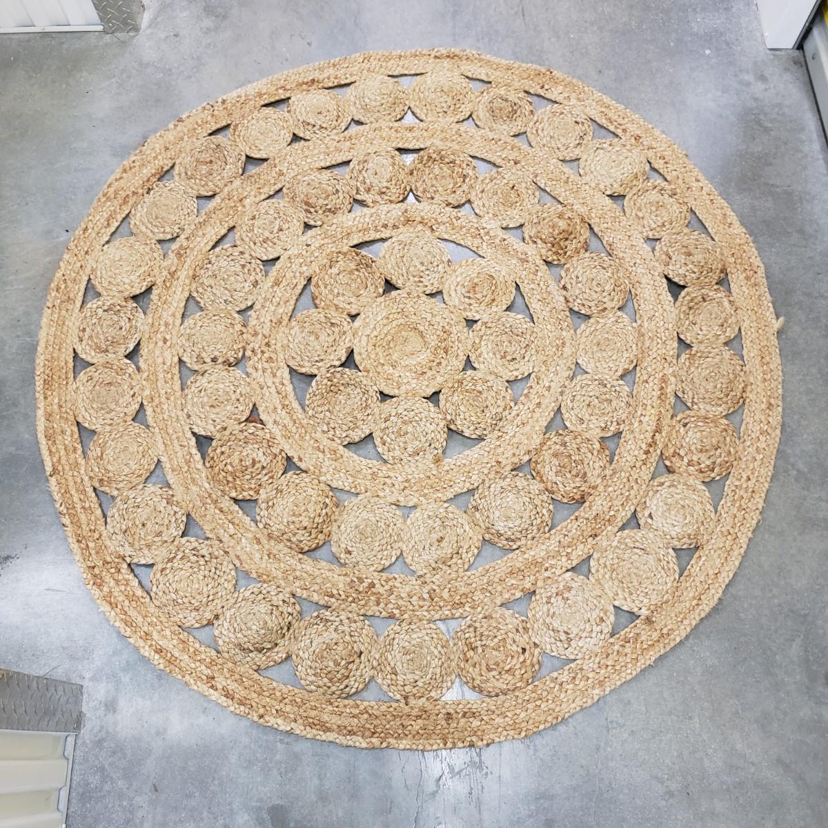 This woven circular rug measures 60"D across. It has a braided circular pattern, perfect for indoor or outdoor use. The braids have been stitched together, see picture. Seller states that this was purchased from Serena and Lily.
