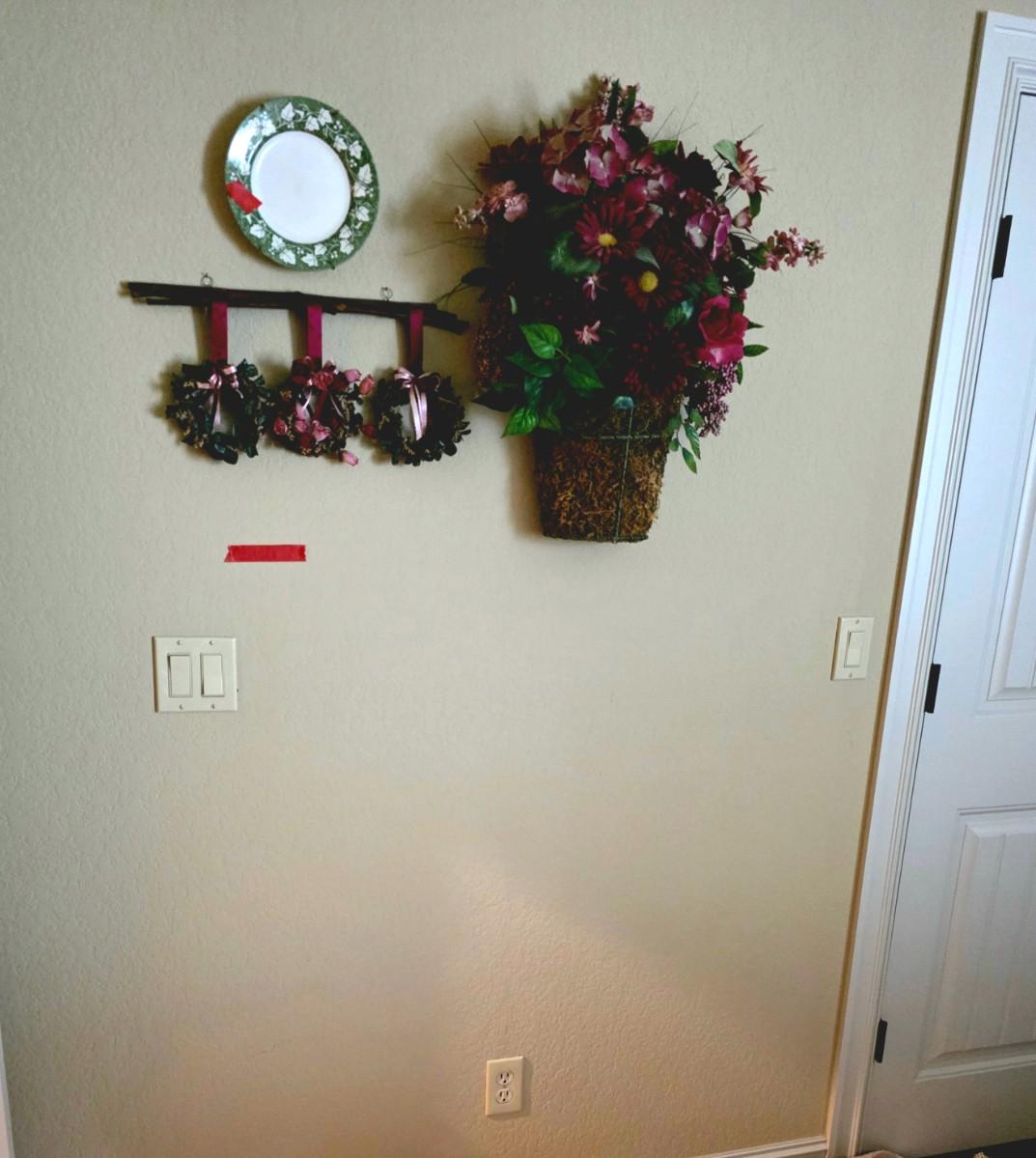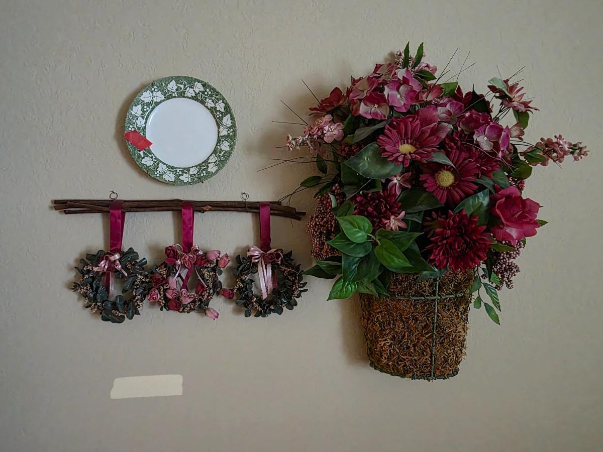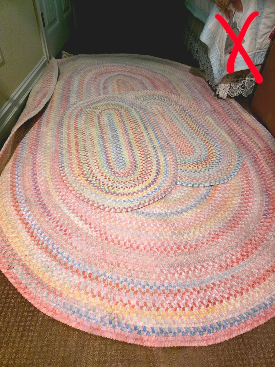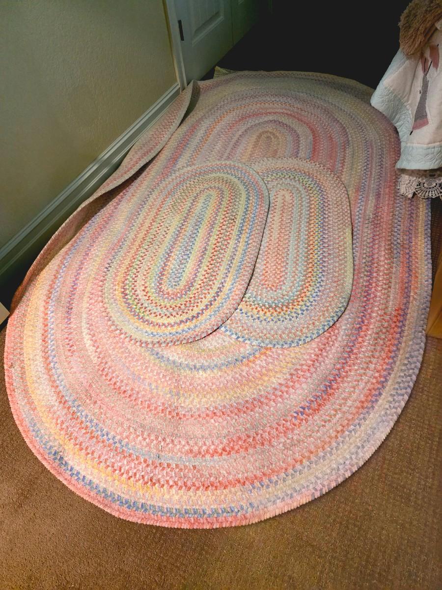 3 braided pastel oval rugs, the largest measuring 95.5"L x 58"W. The other 2 measuring the standard 2x3 door mat size. And 3 decorative wall hangings.