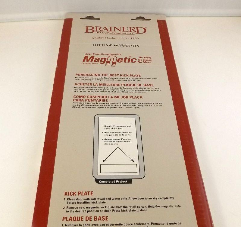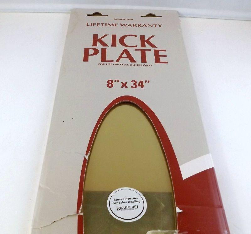 Brass kick plate 8" x 34" This plate is in original box. Box has been in storage, which produced a few scuff marks to plate. Plate is still covered with protective film. This plate is magnetic so installation is easy..