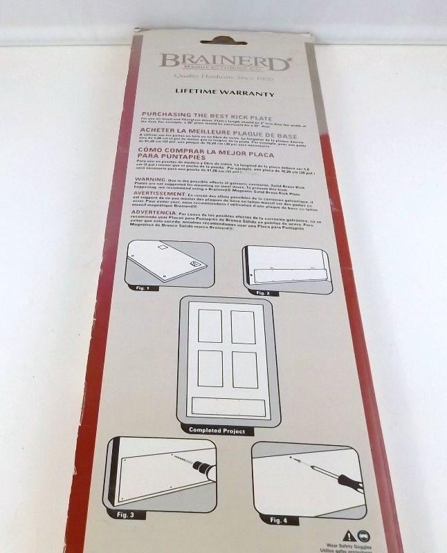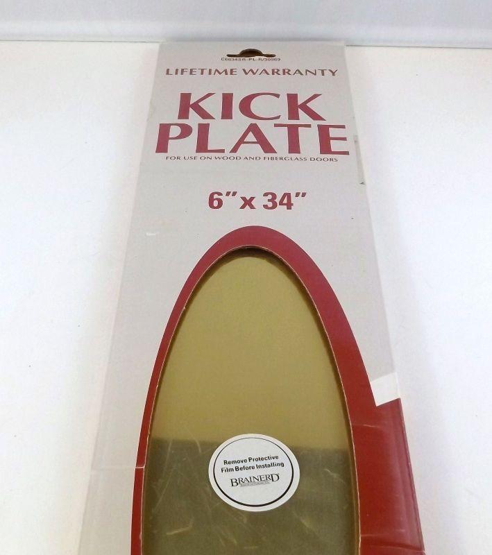 Solid brass kick plate 6" x 34:" Still in original box.. This item has been in storage and has some minor scuffs, Plate is still covered with original protective film. Screws included.