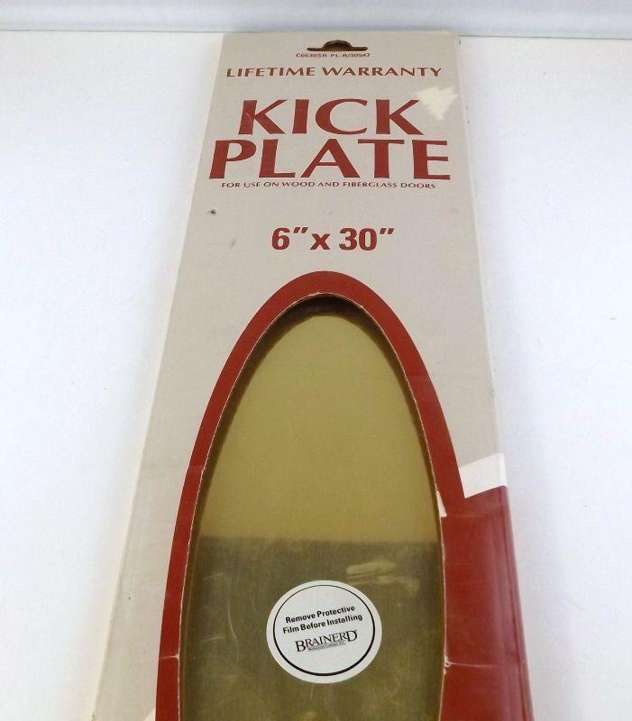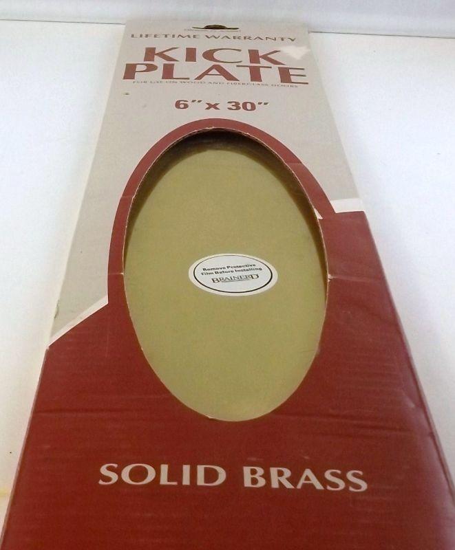 Solid brass kick plate 6" x 30". Still in original box, which has been stored, leaving minor scuff marks on box and product. Plate is still covered with original protective film. Screws included..