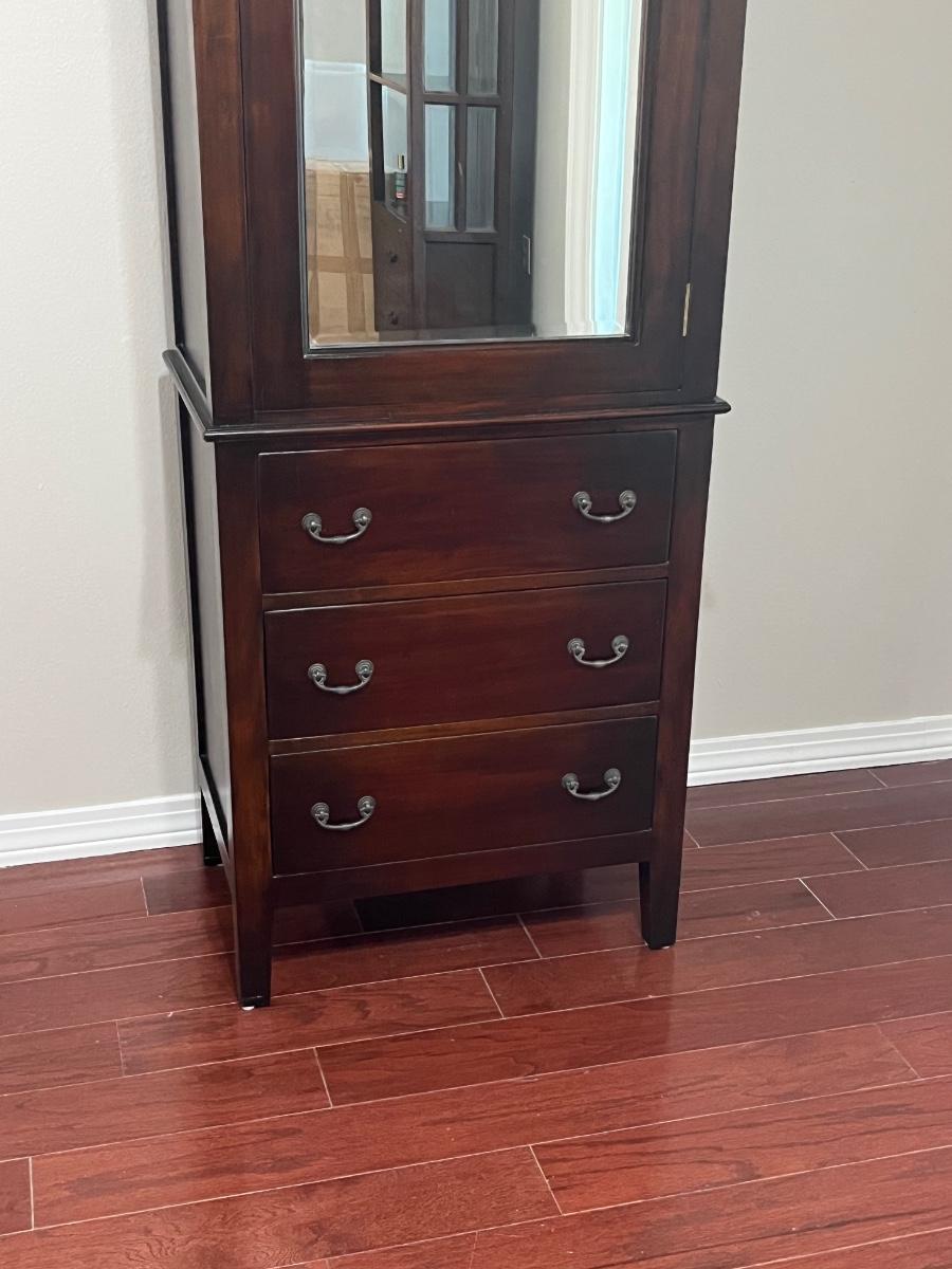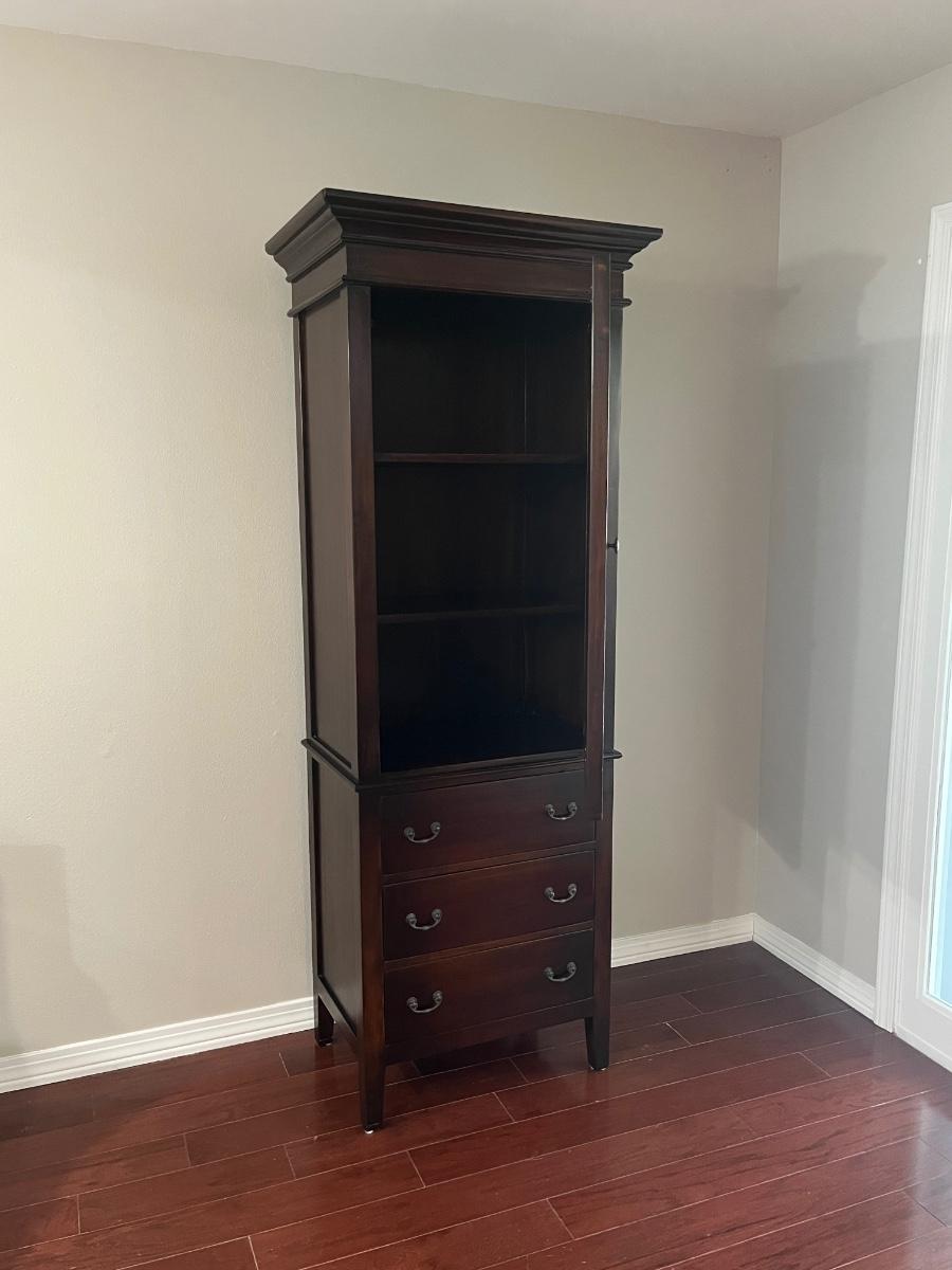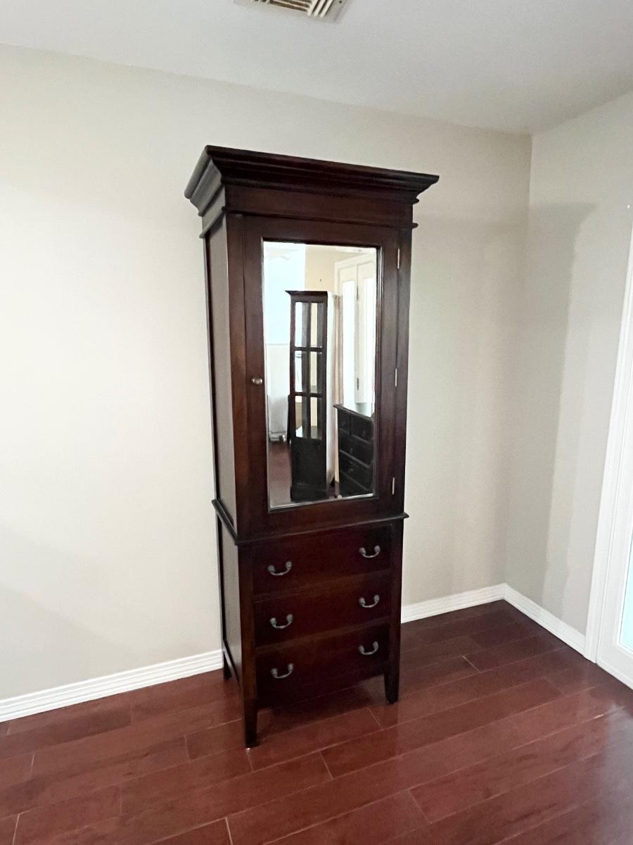 80” H x 30” W x 18” D ~ shelves are removable ~ has a hanging rod ~ located upstairs