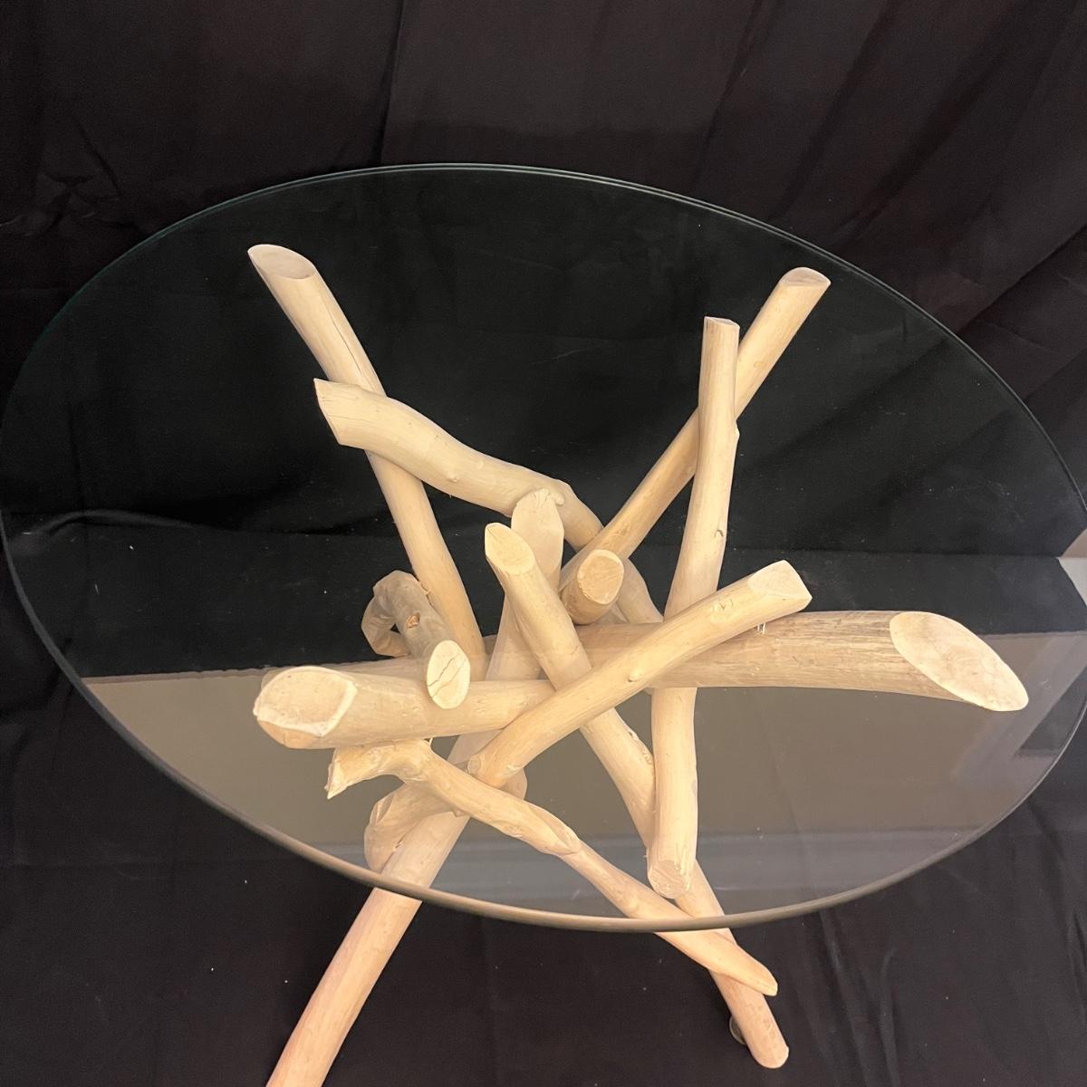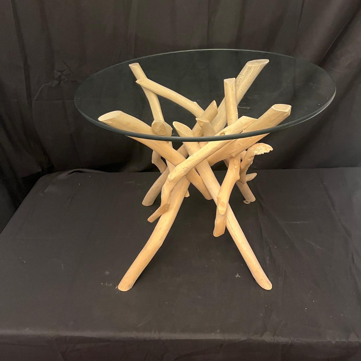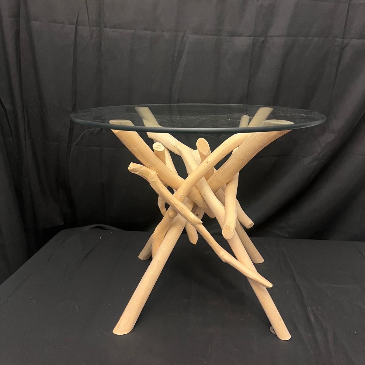 This show stopper branch wood side table has a round glass top. Legs give the appearance of driftwood. Table measures 23.5”D x 20”H.