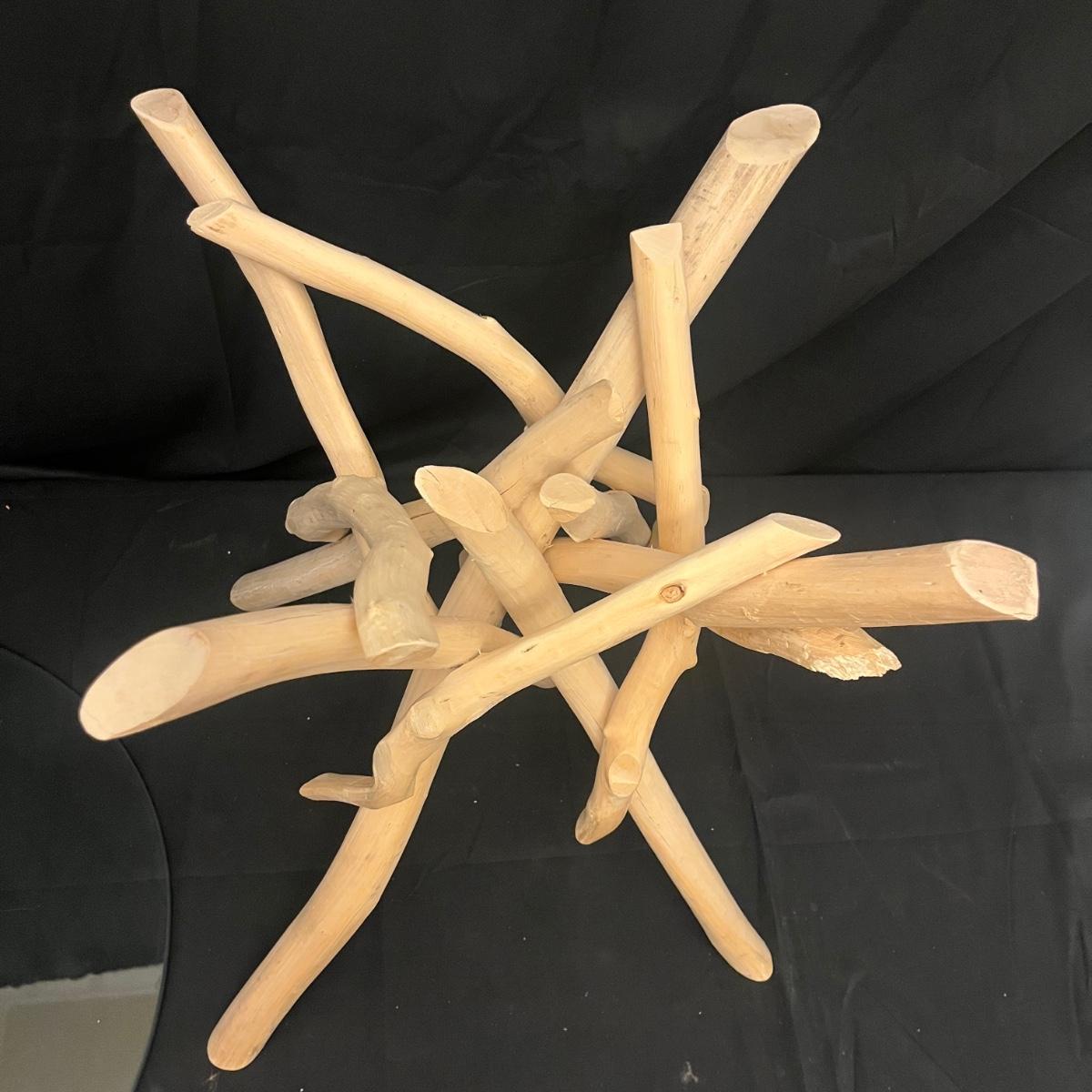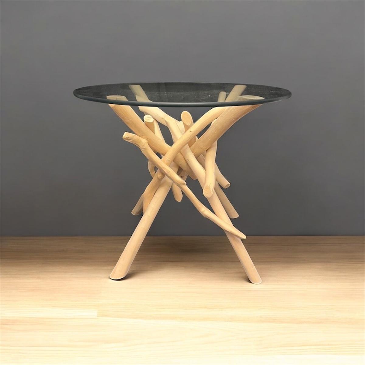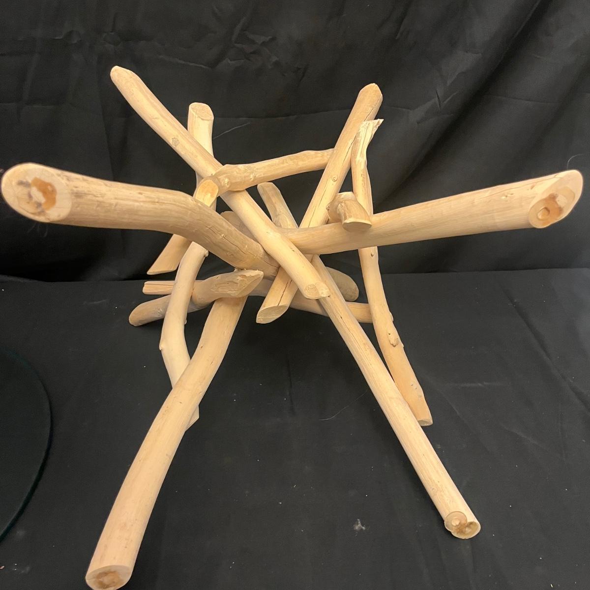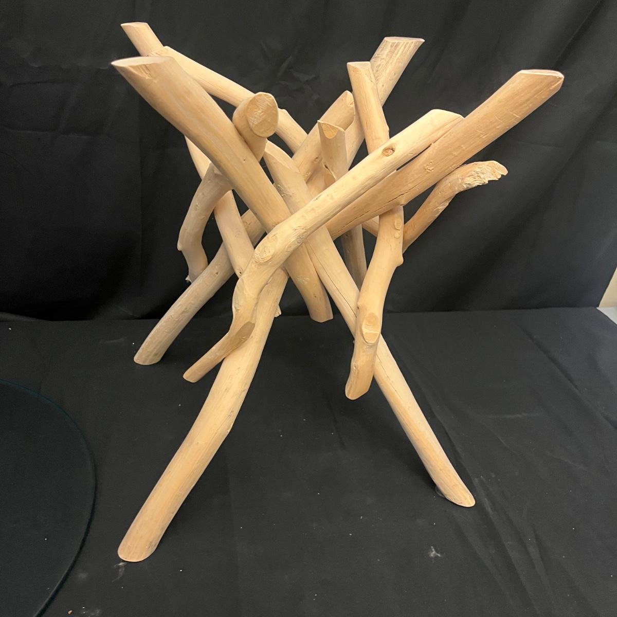 This show stopper branch wood side table has a round glass top. Legs give the appearance of driftwood. Table measures 23.5”D x 20”H.