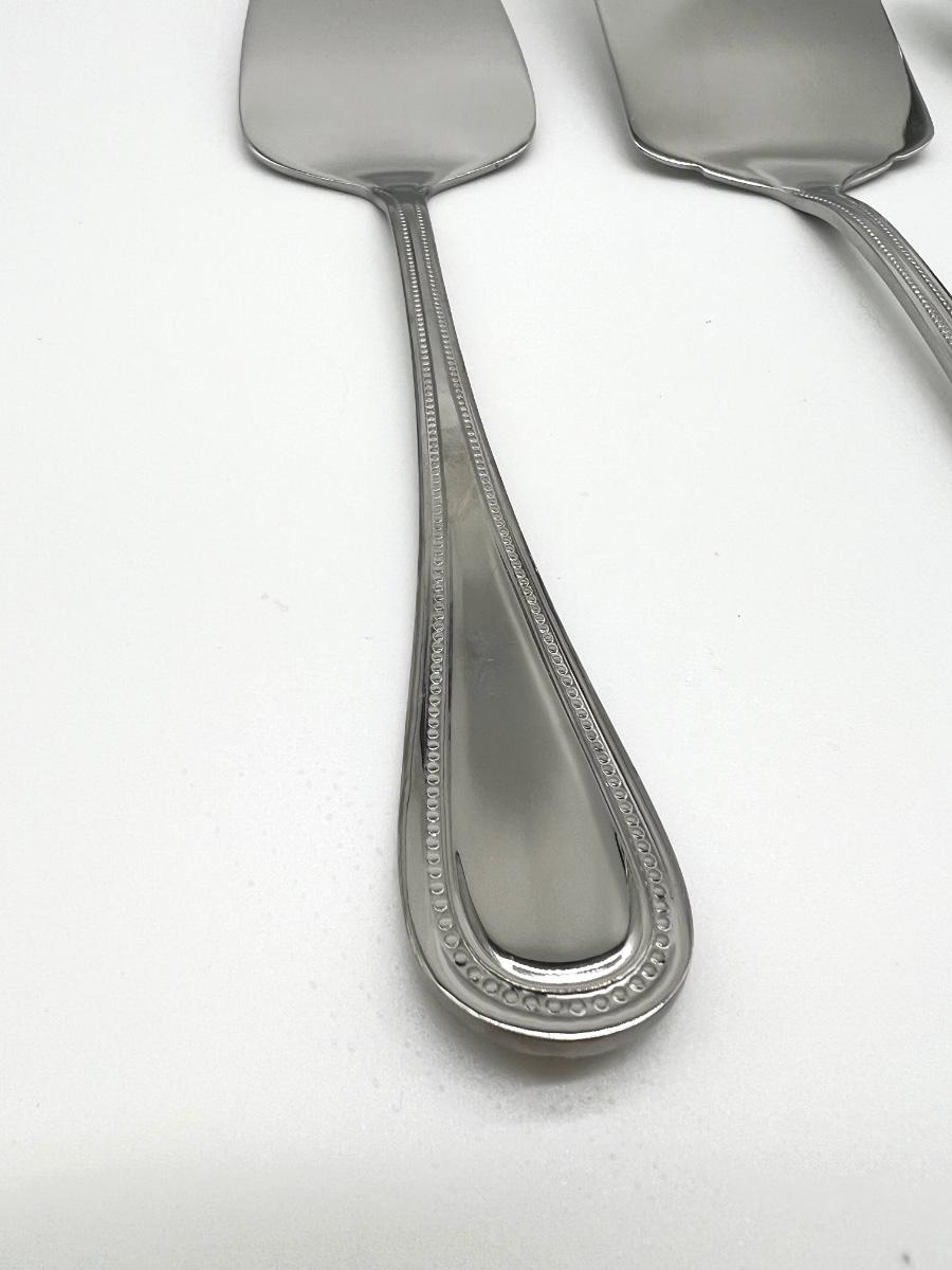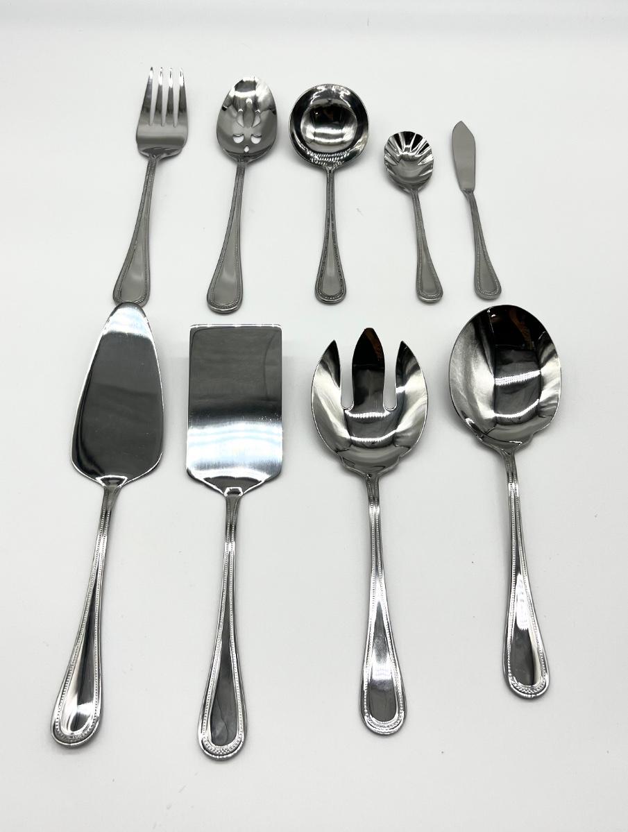 spoons, 24 teaspoons, 12 ice tea mixing spoons. Hostess serving kit includes one sugar spoon, one butter spreader, one pierced tablespoon, 2 tablespoons, one pie server, two pastry forks, one 2 piece salad server, one lasagna server, and one sauce./gravy ladle.